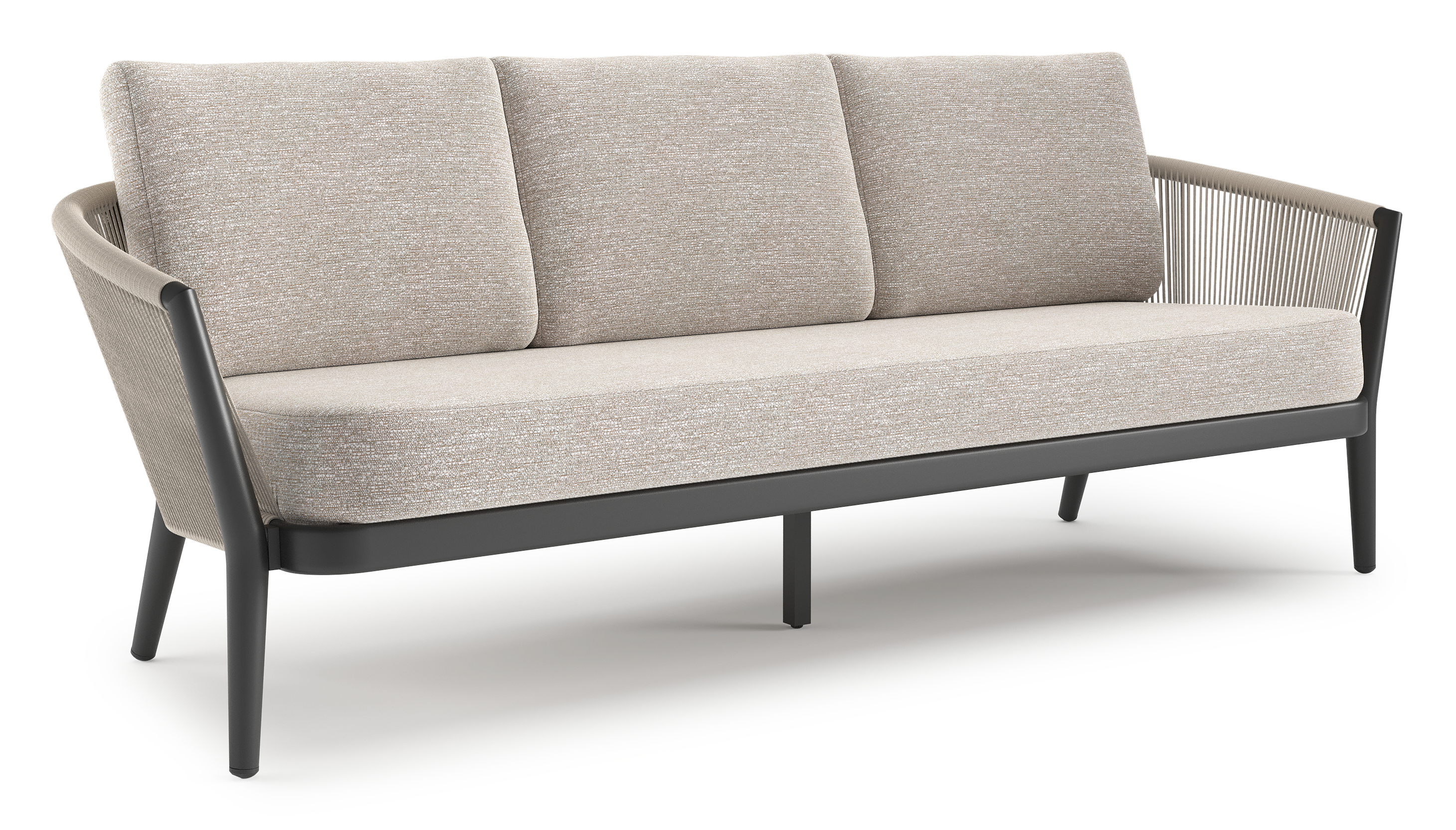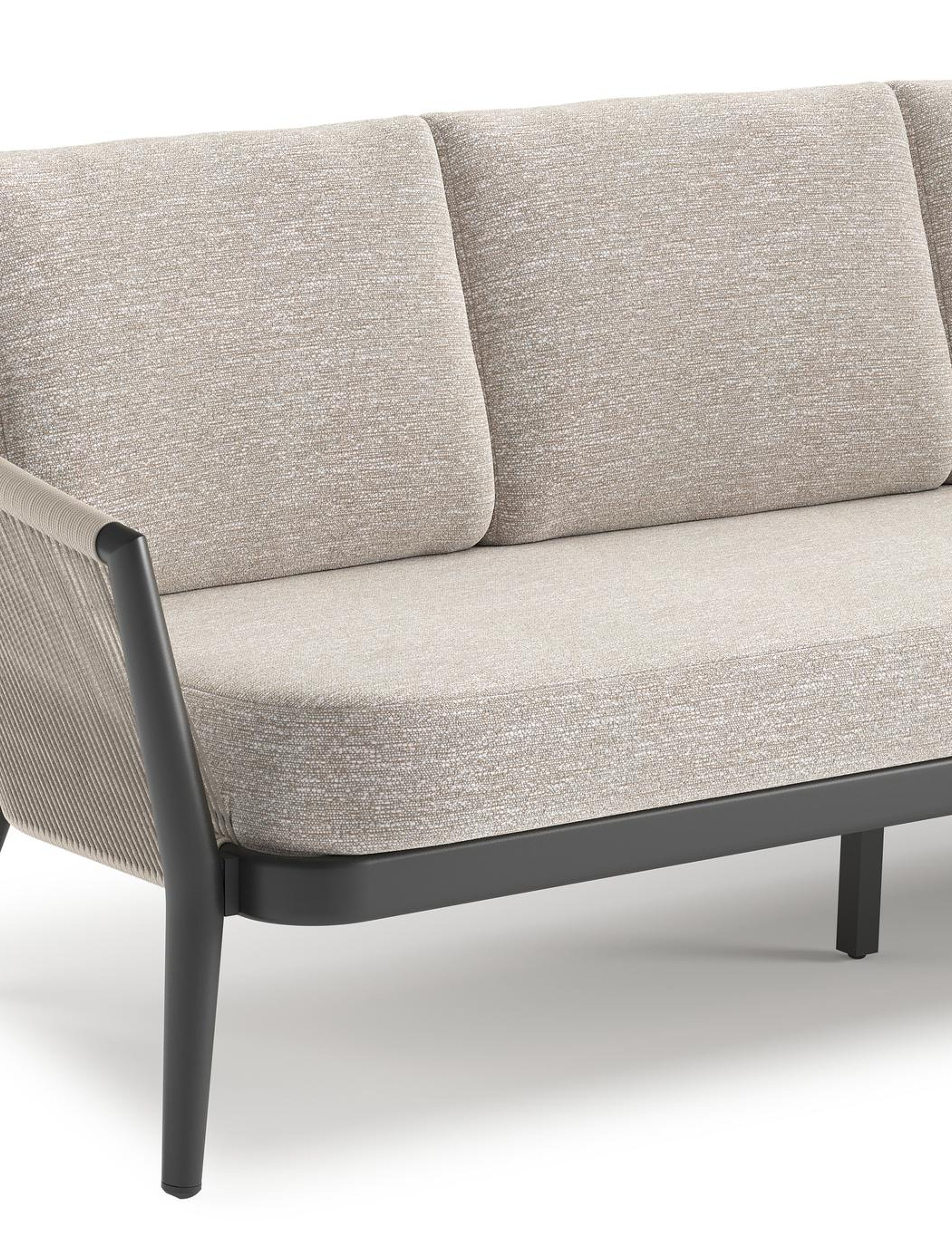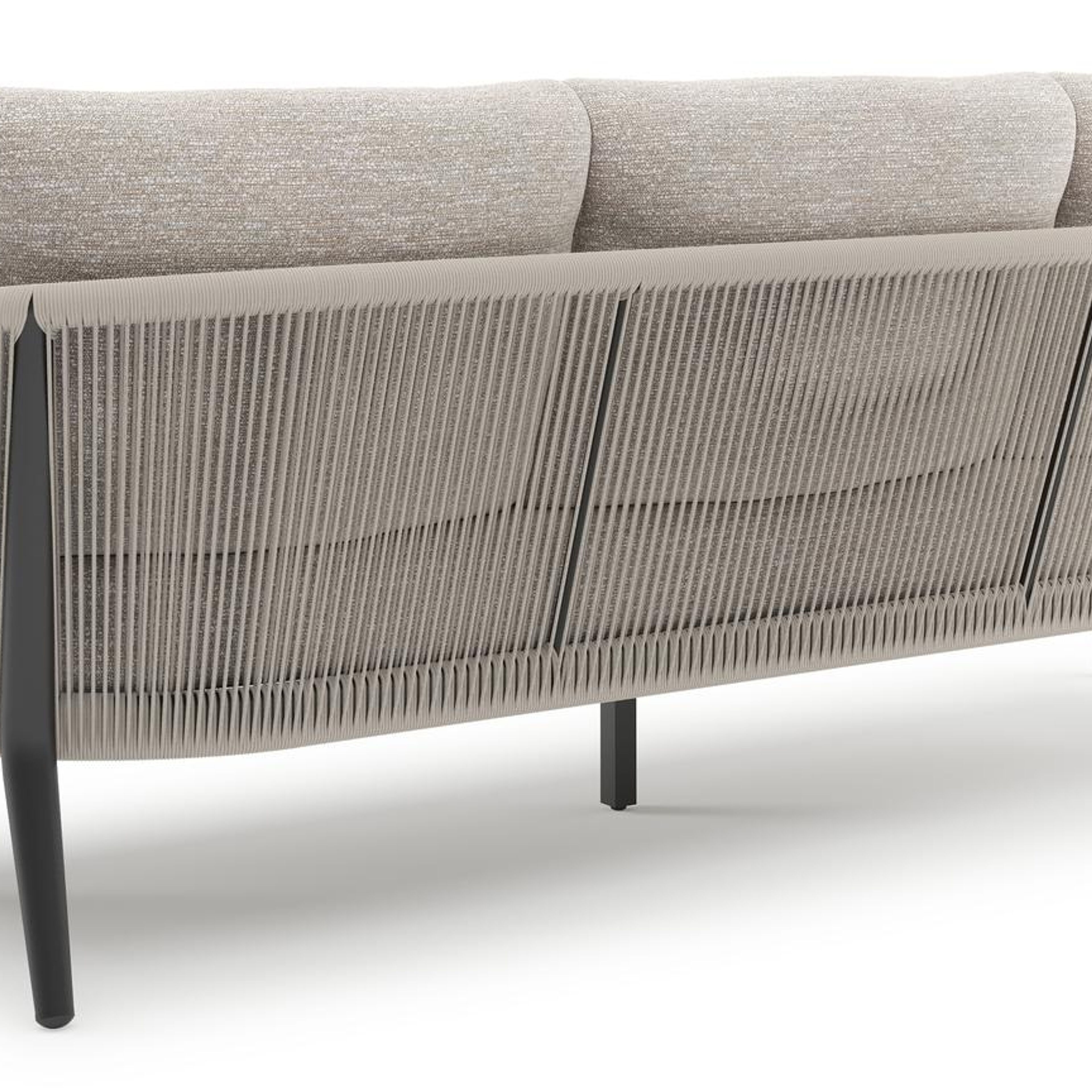 Canapé de jardin Orso en aluminium noir en corde ronde tissée verticalement beige et coussins en all weather sunbrella® luxe Tundra Sand | Exterioo mobilier de jardin