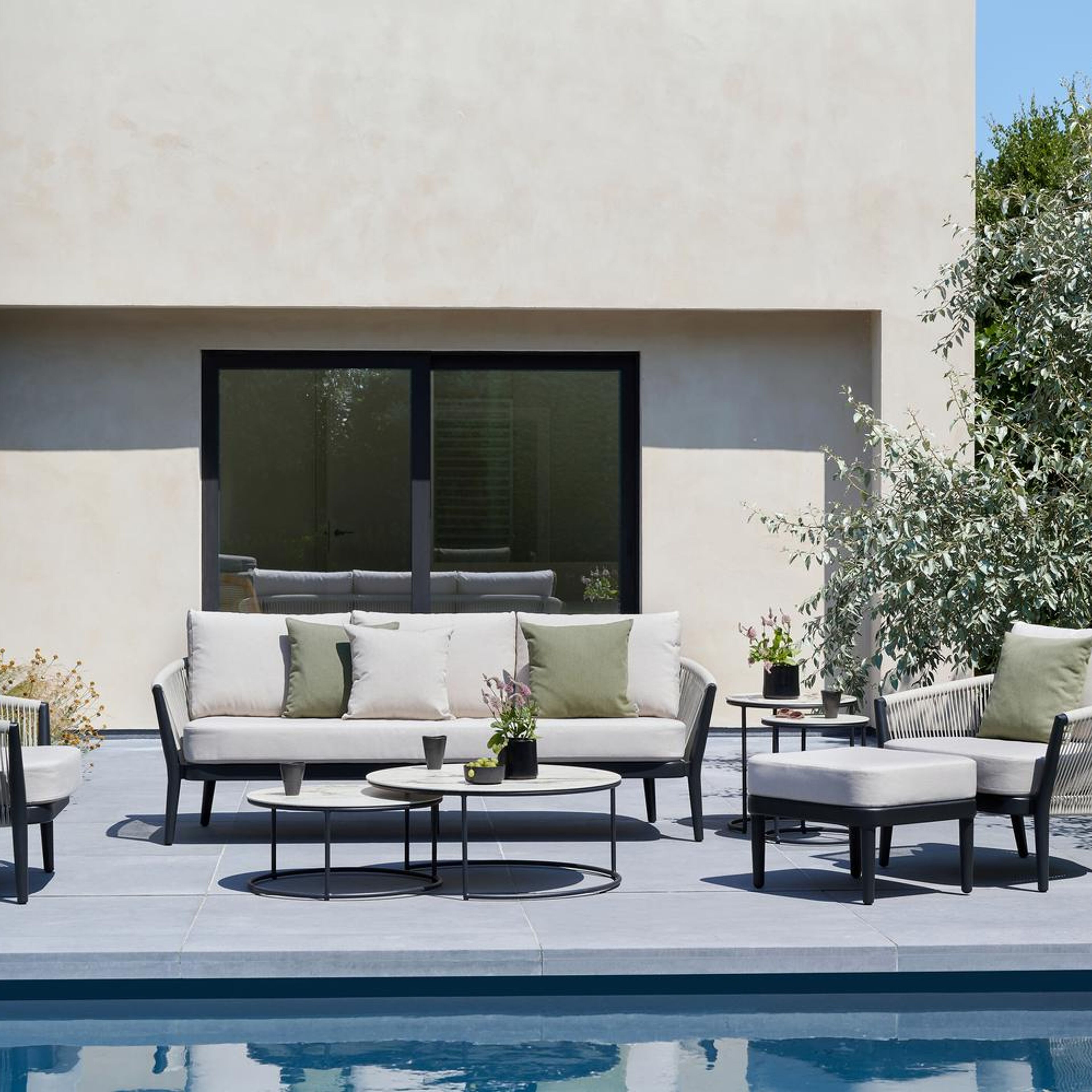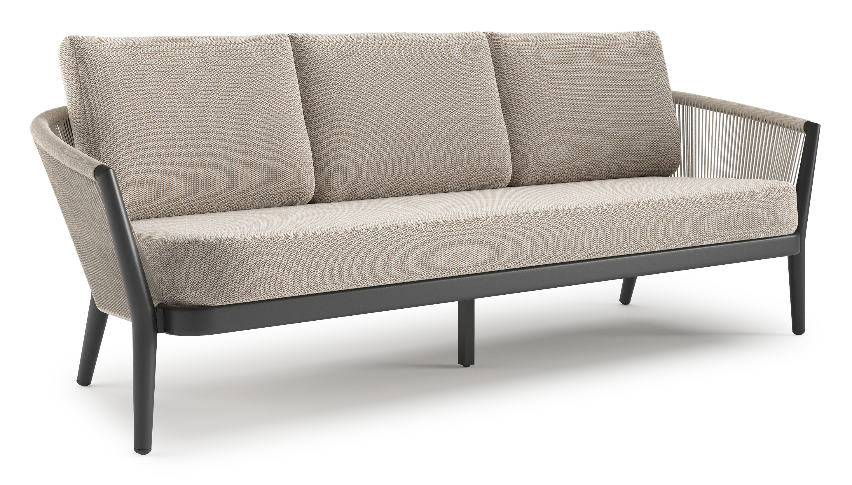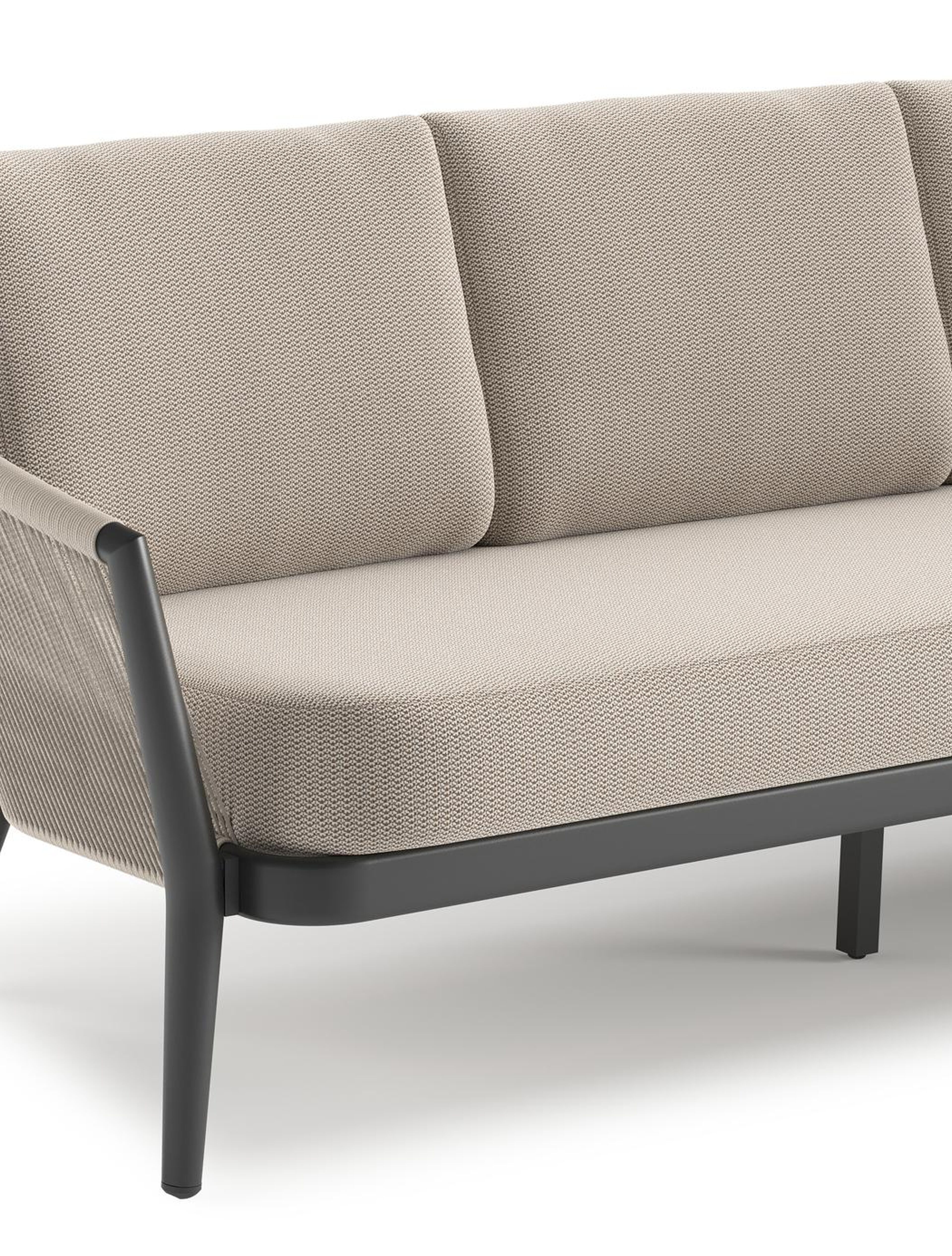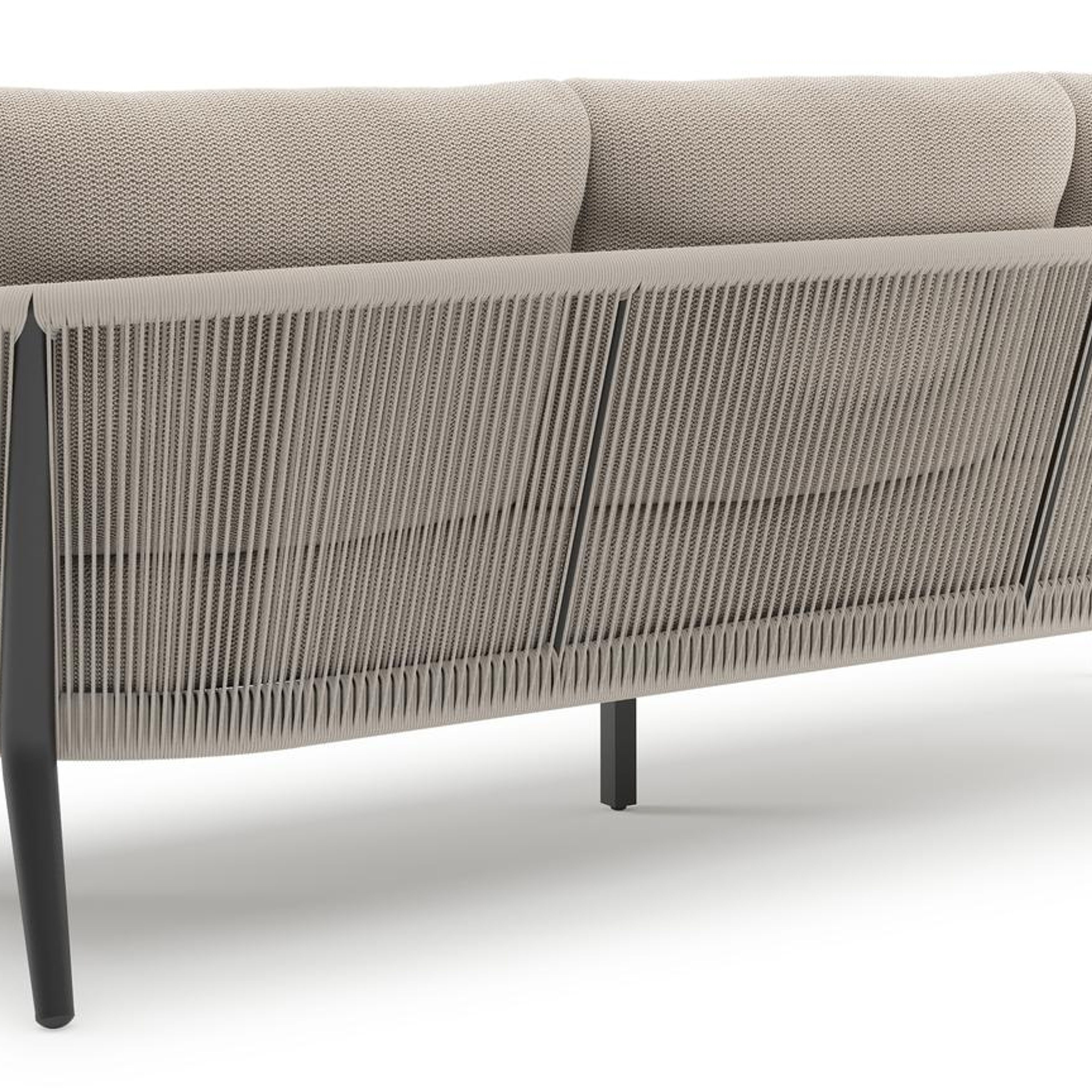 Canapé de jardin Orso en aluminium noir en corde ronde tissée verticalement beige et coussins en all weather sunbrella® luxe Lopi Fossil | Exterioo mobilier de jardin