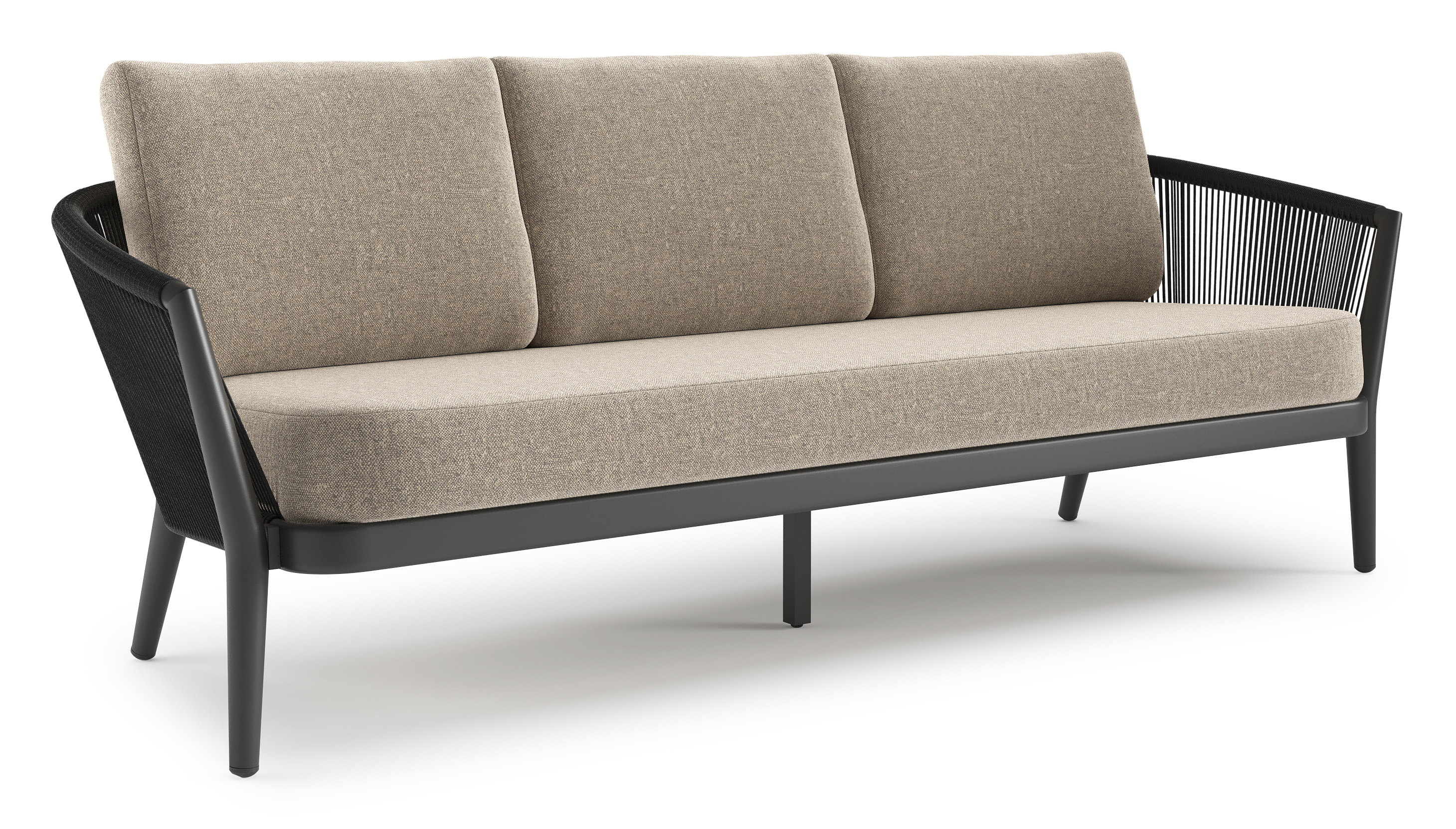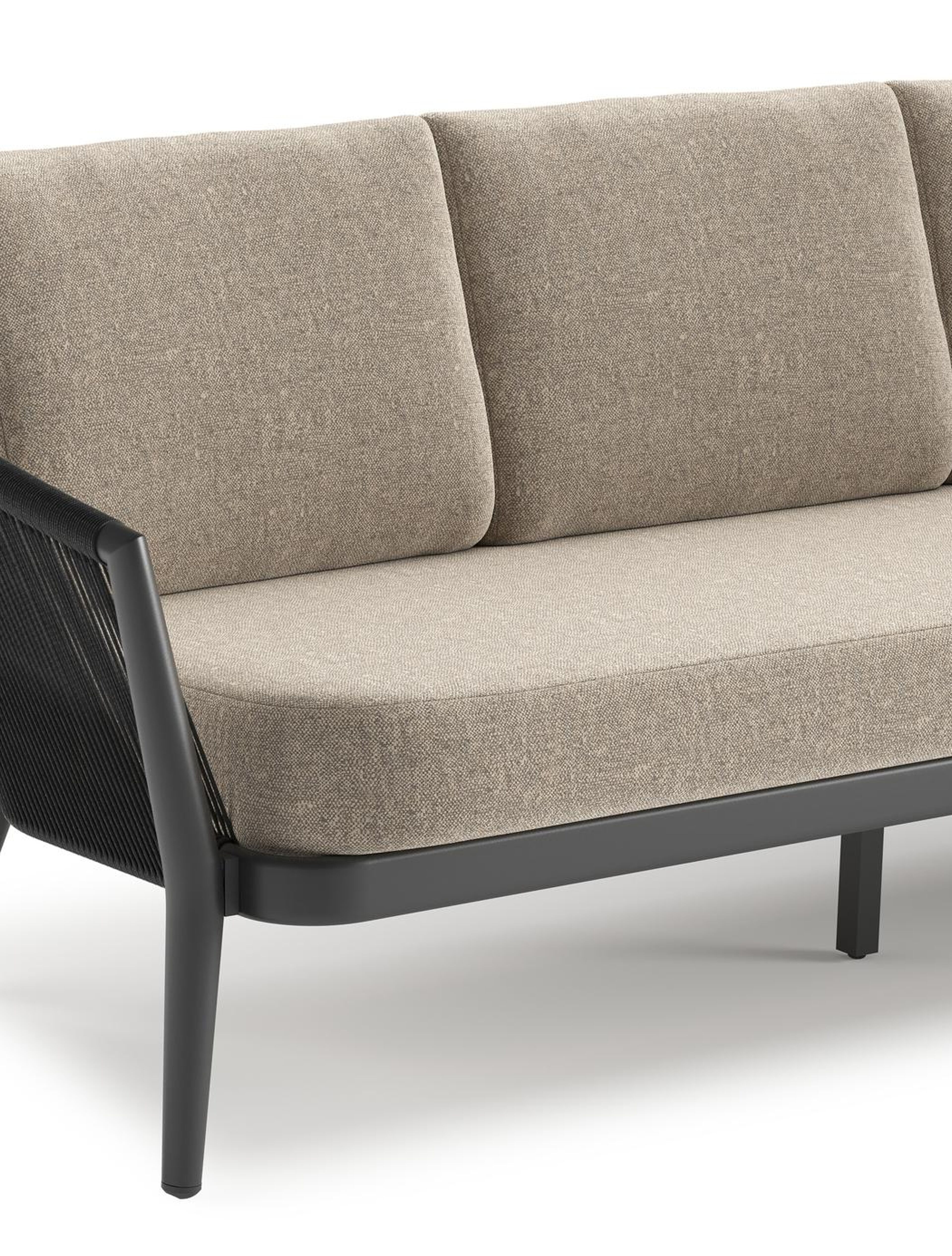 Canapé de jardin Orso en aluminium noir en corde ronde tissée verticalement noir et coussins en all weather sunbrella® luxe Chartres Pewter | Exterioo mobilier de jardin