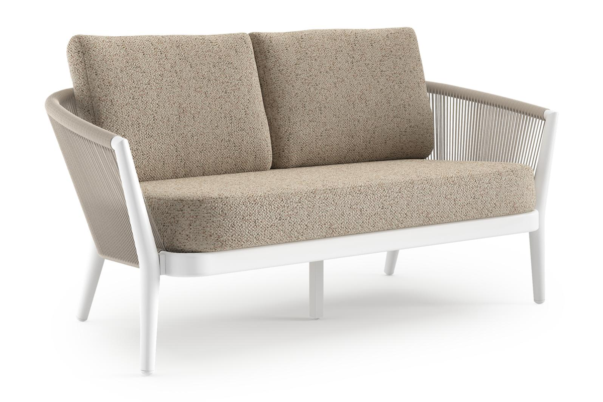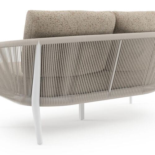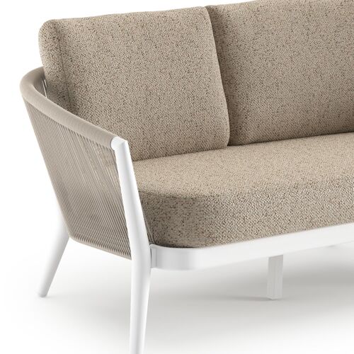 Canapé de jardin Orso en aluminium blanc en corde ronde tissée verticalement beige et coussins en all weather cosytica Bora Jungle | Exterioo