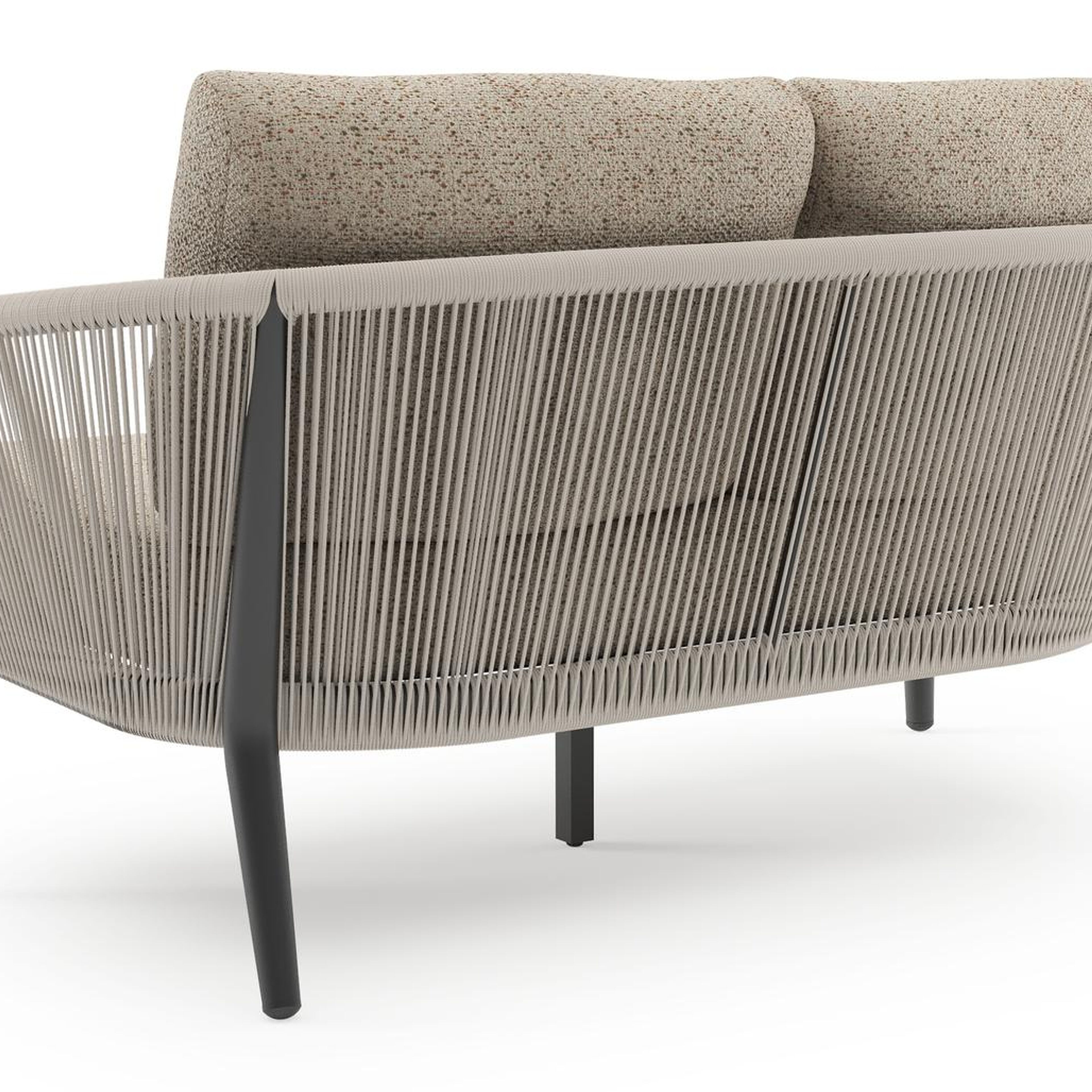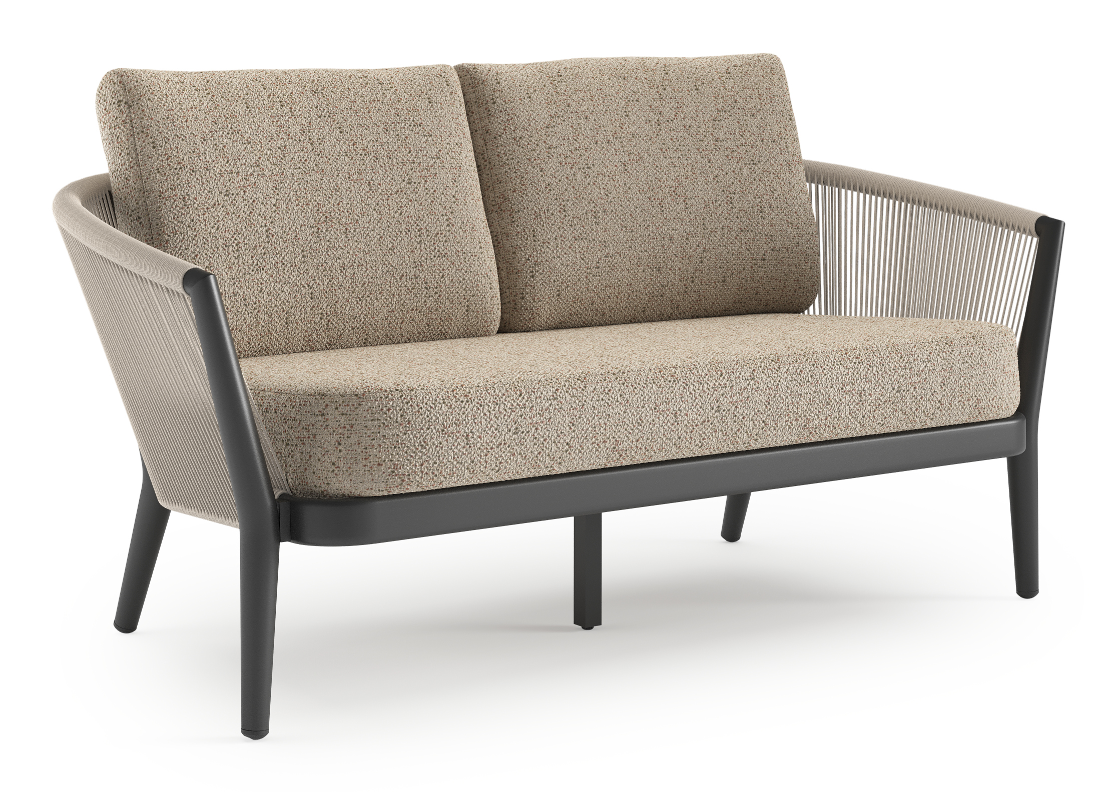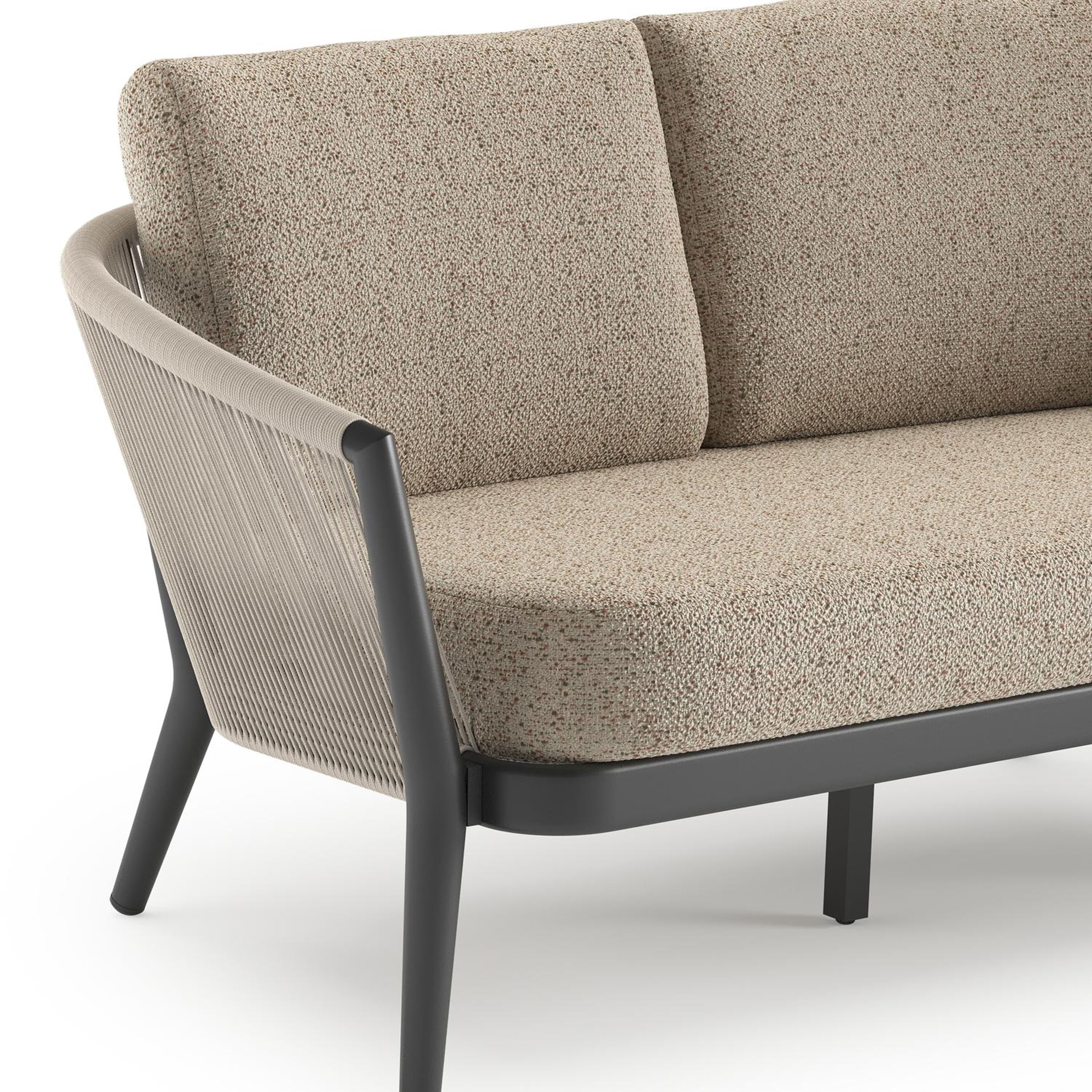 Canapé de jardin Orso en aluminium noir en corde ronde tissée verticalement beige et coussins en all weather cosytica Bora Jungle | Exterioo mobilier de jardin