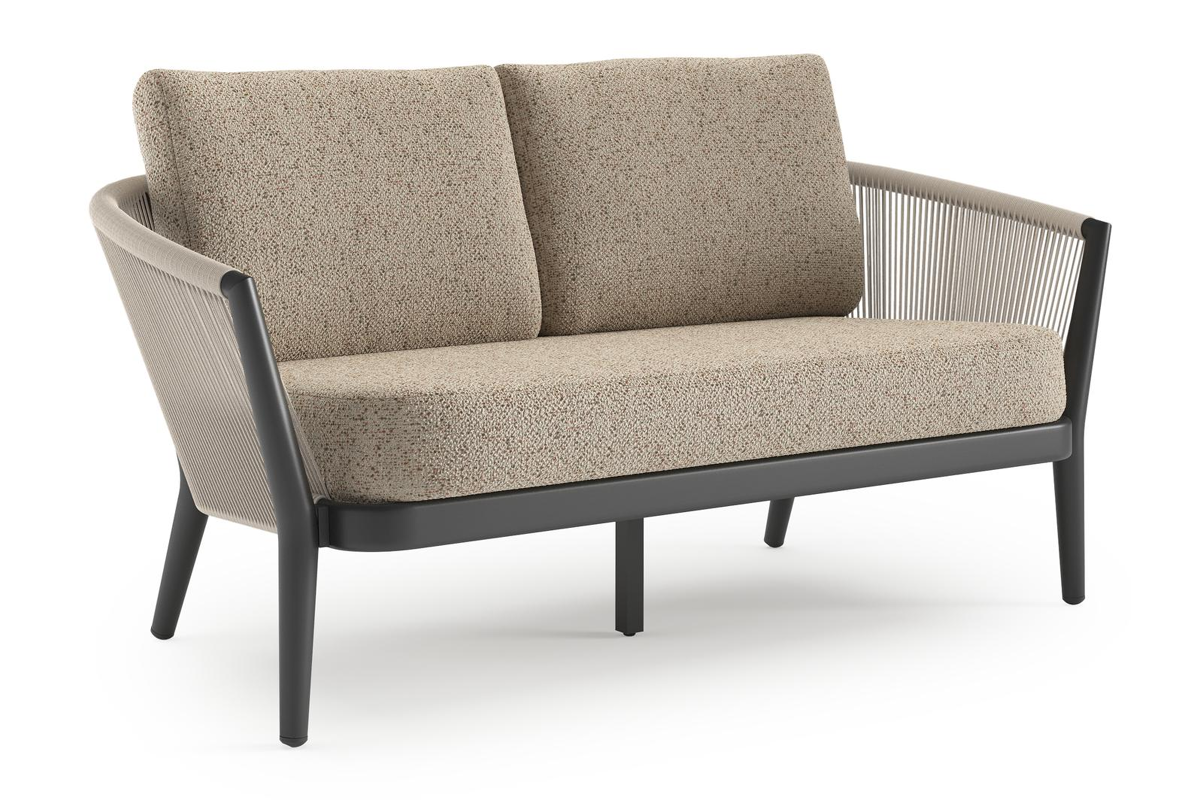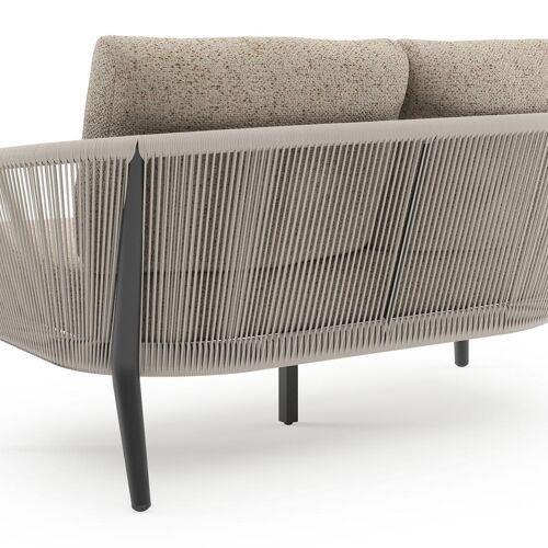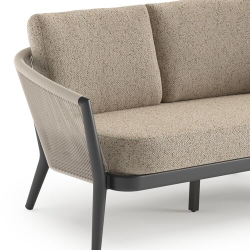 Canapé de jardin Orso en aluminium noir en corde ronde tissée verticalement beige et coussins en all weather cosytica Bora Jungle | Exterioo