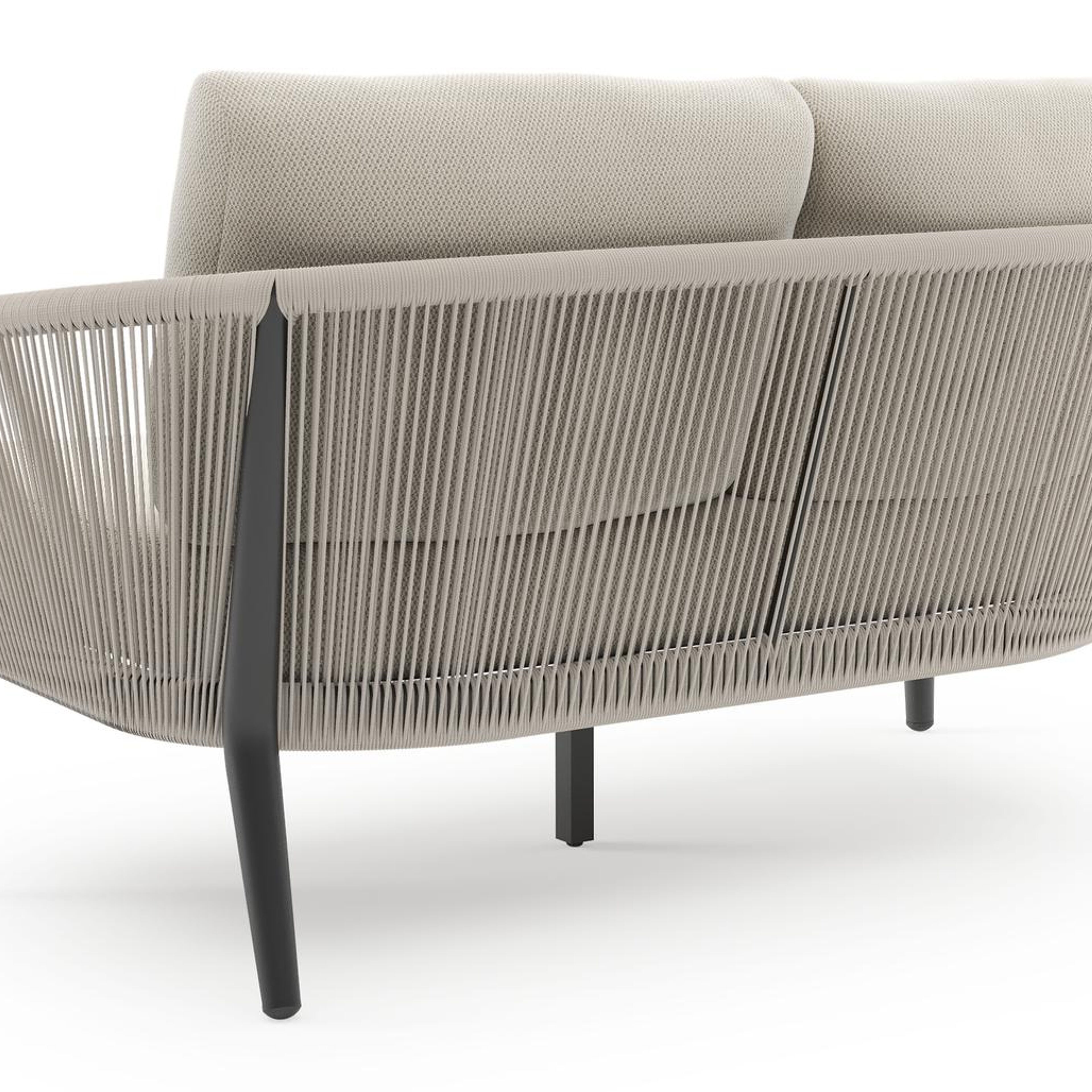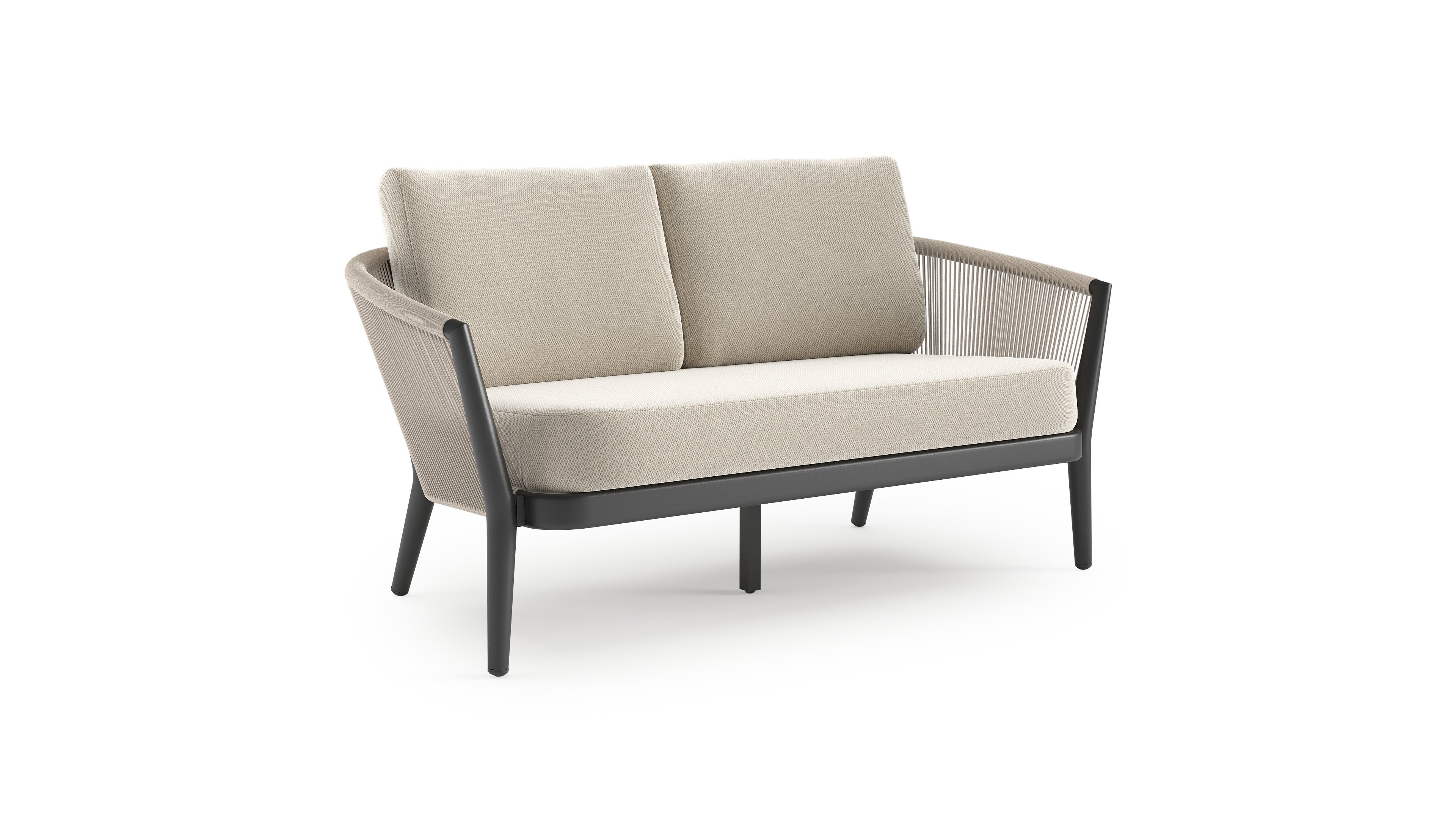 Canapé de jardin Orso en aluminium noir en corde ronde tissée verticalement beige et coussins en all weather sunbrella® luxe Lopi Marble | Exterioo mobilier de jardin