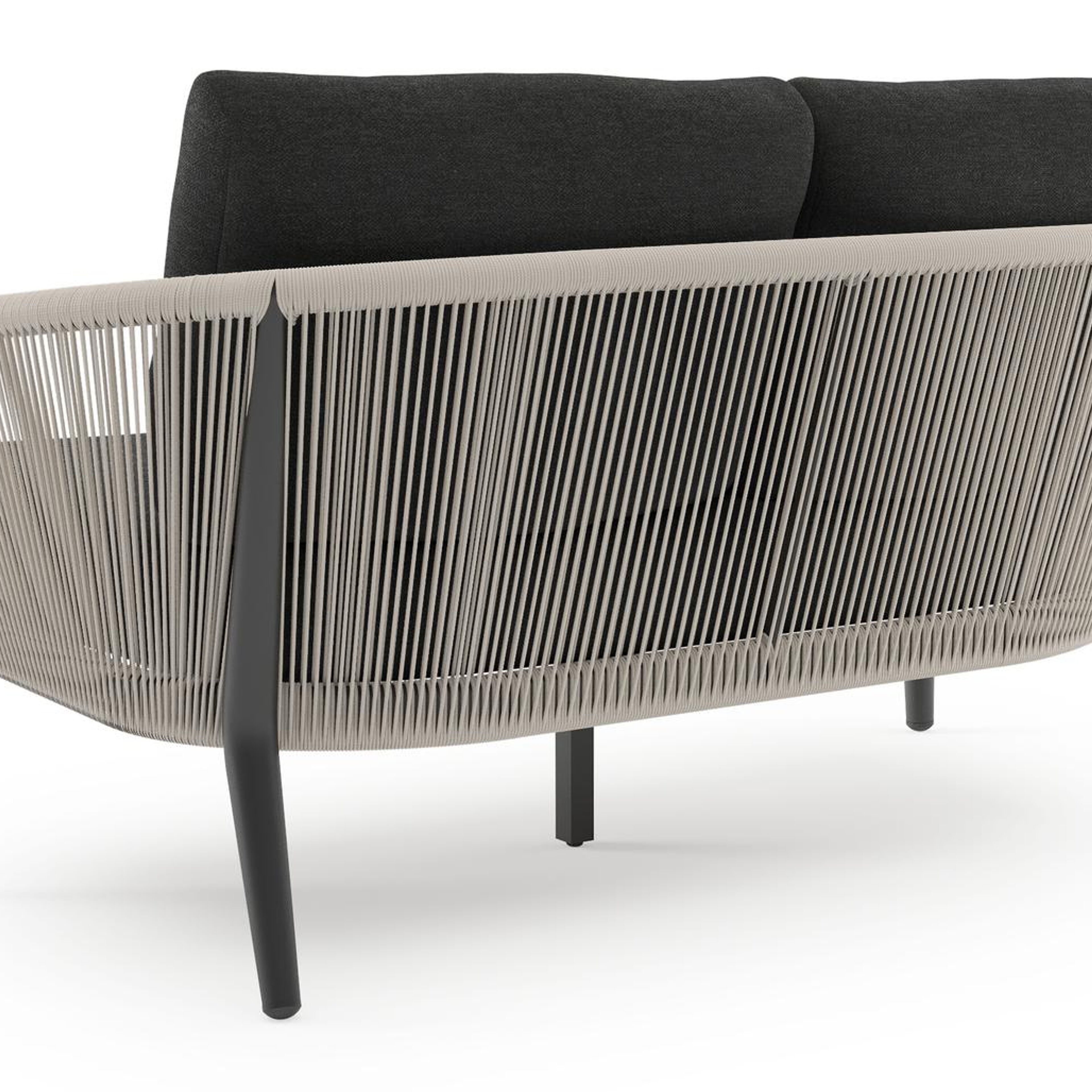 Canapé de jardin Orso en aluminium noir en corde ronde tissée verticalement beige et coussins en all weather sunbrella® luxe Chartres Sooty | Exterioo mobilier de jardin