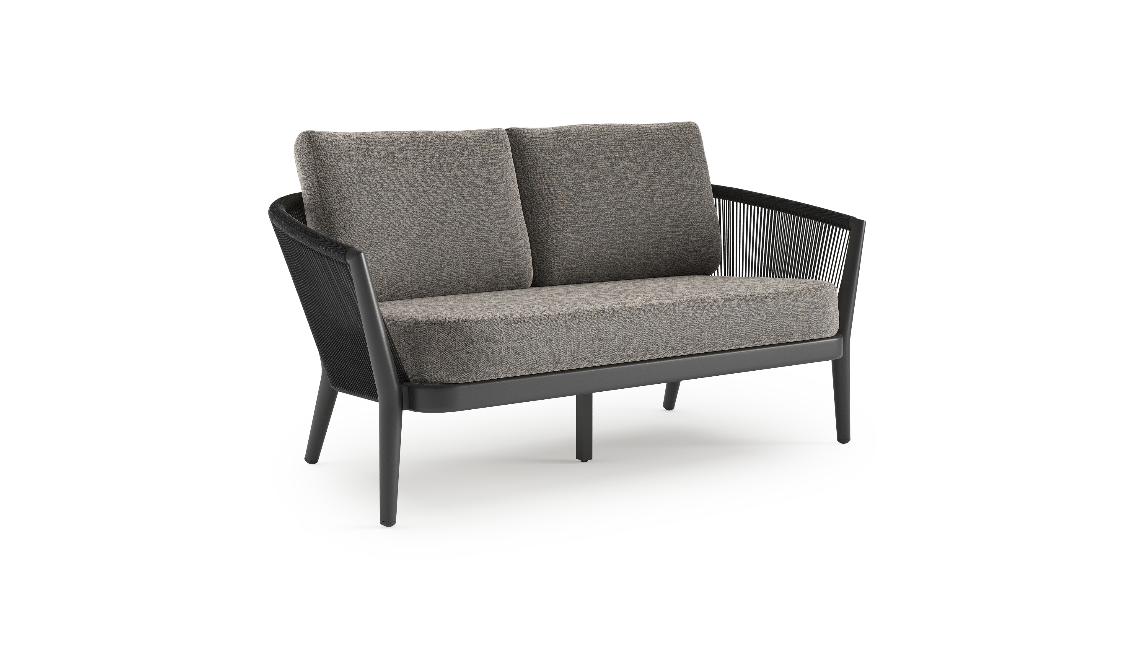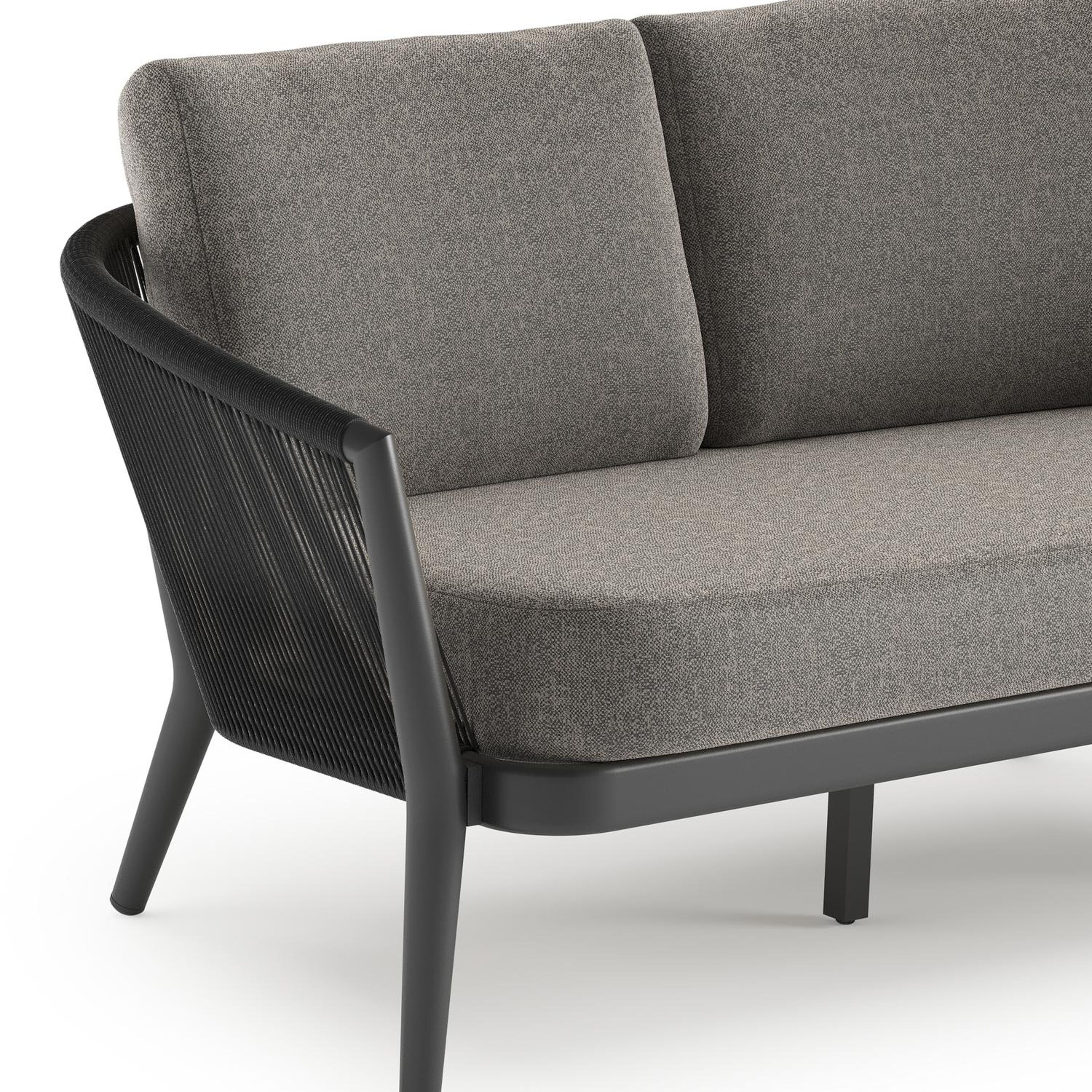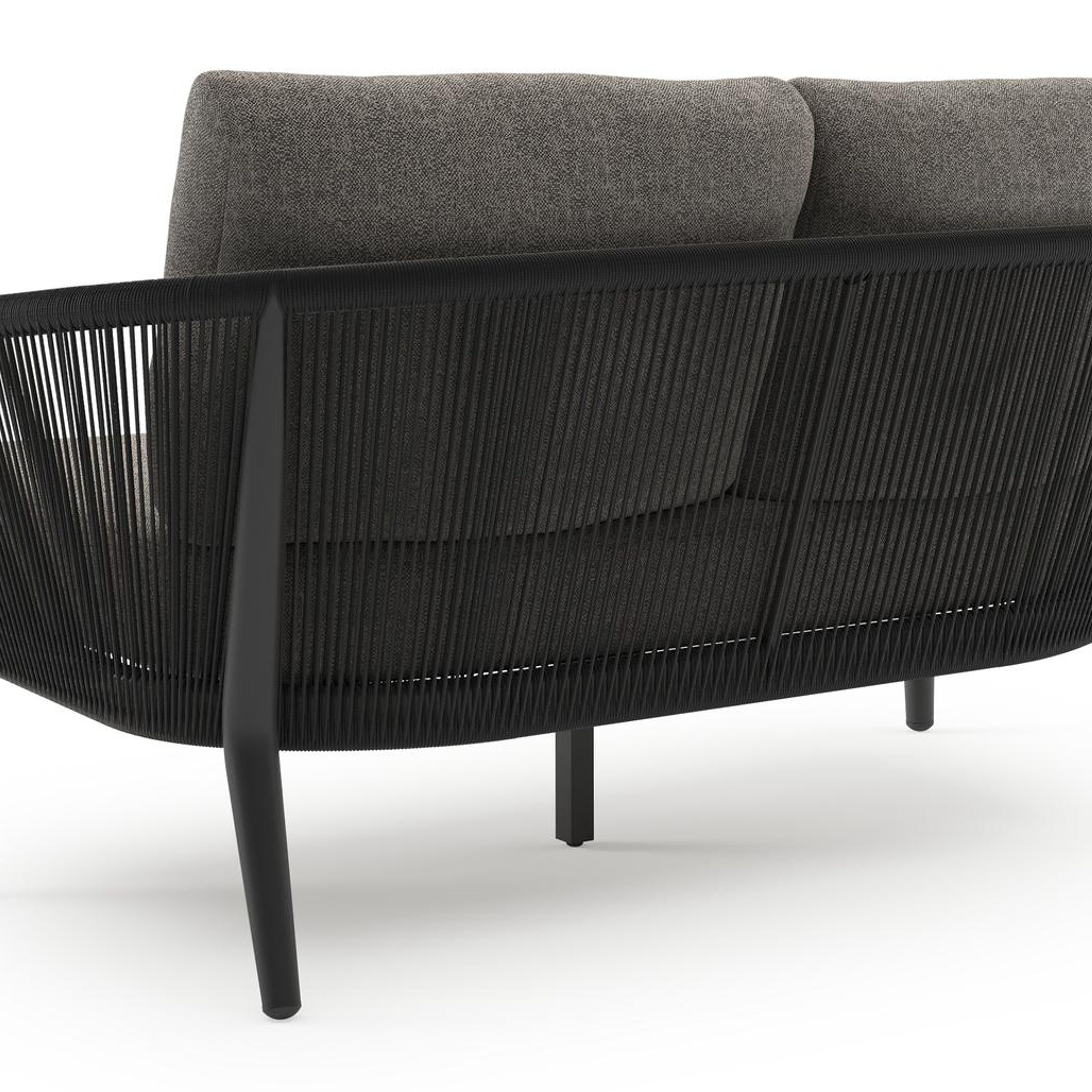 Canapé de jardin Orso en aluminium noir en corde ronde tissée verticalement noir et coussins en all weather sunbrella® luxe Chartres Drizzle | Exterioo mobilier de jardin