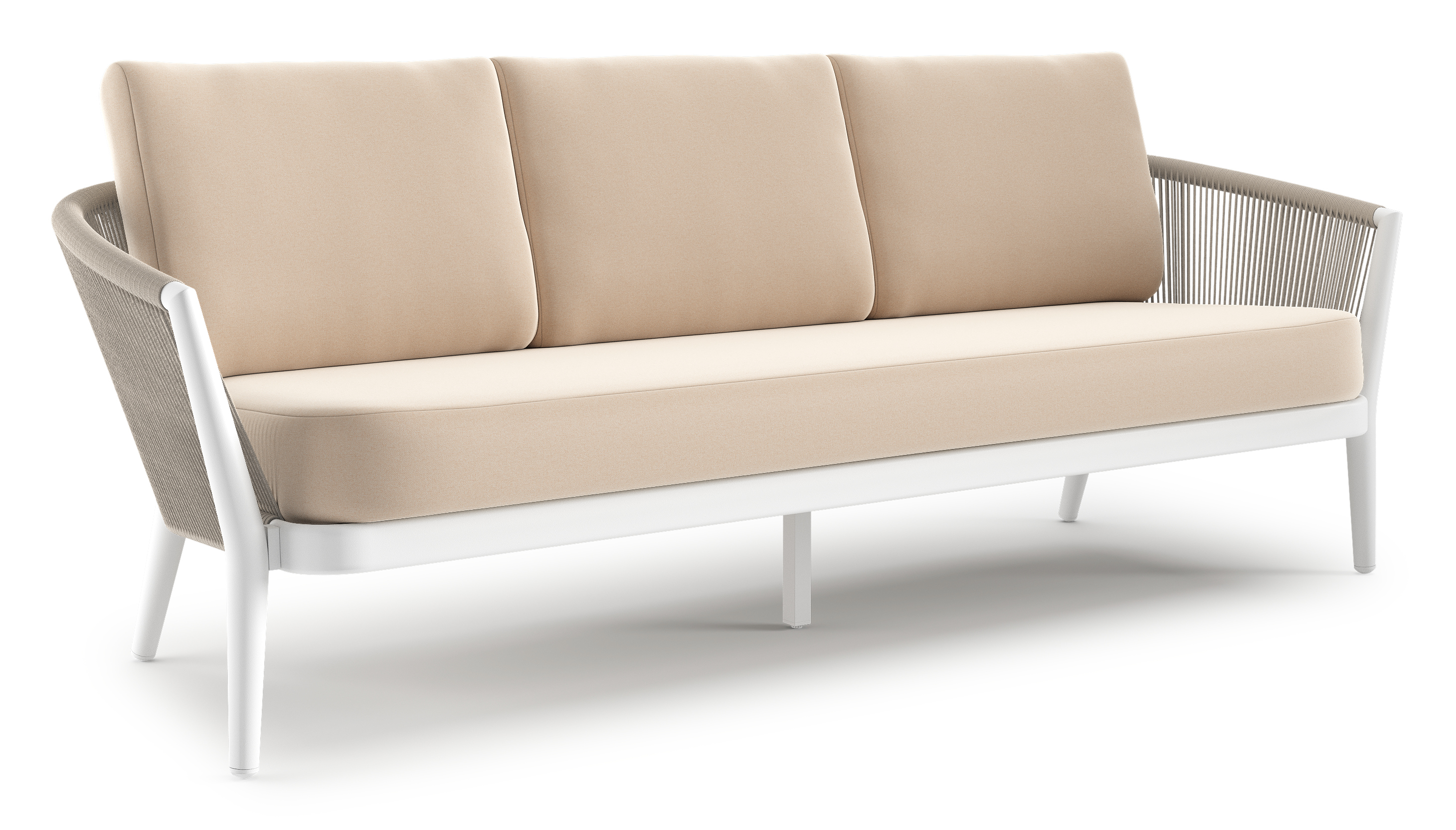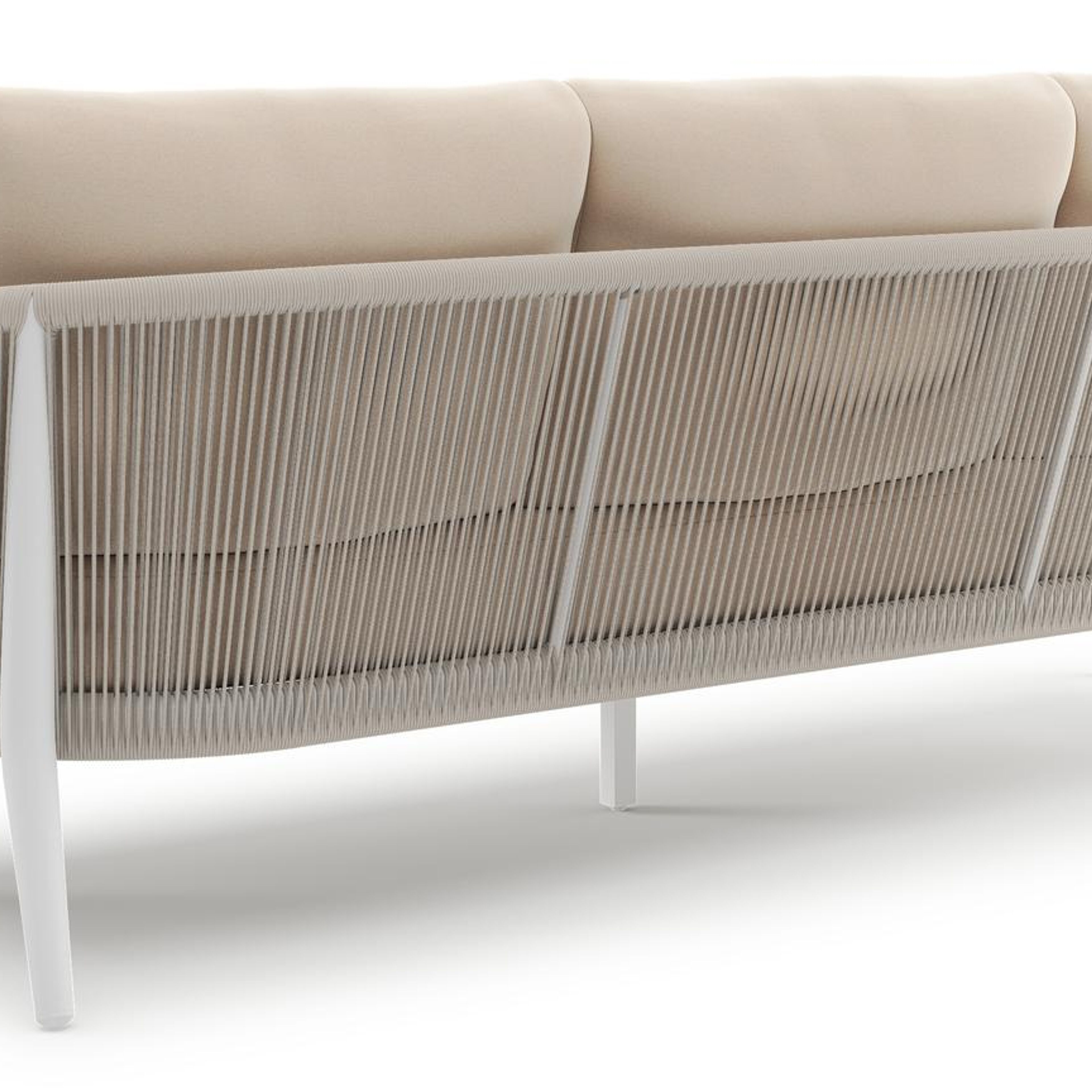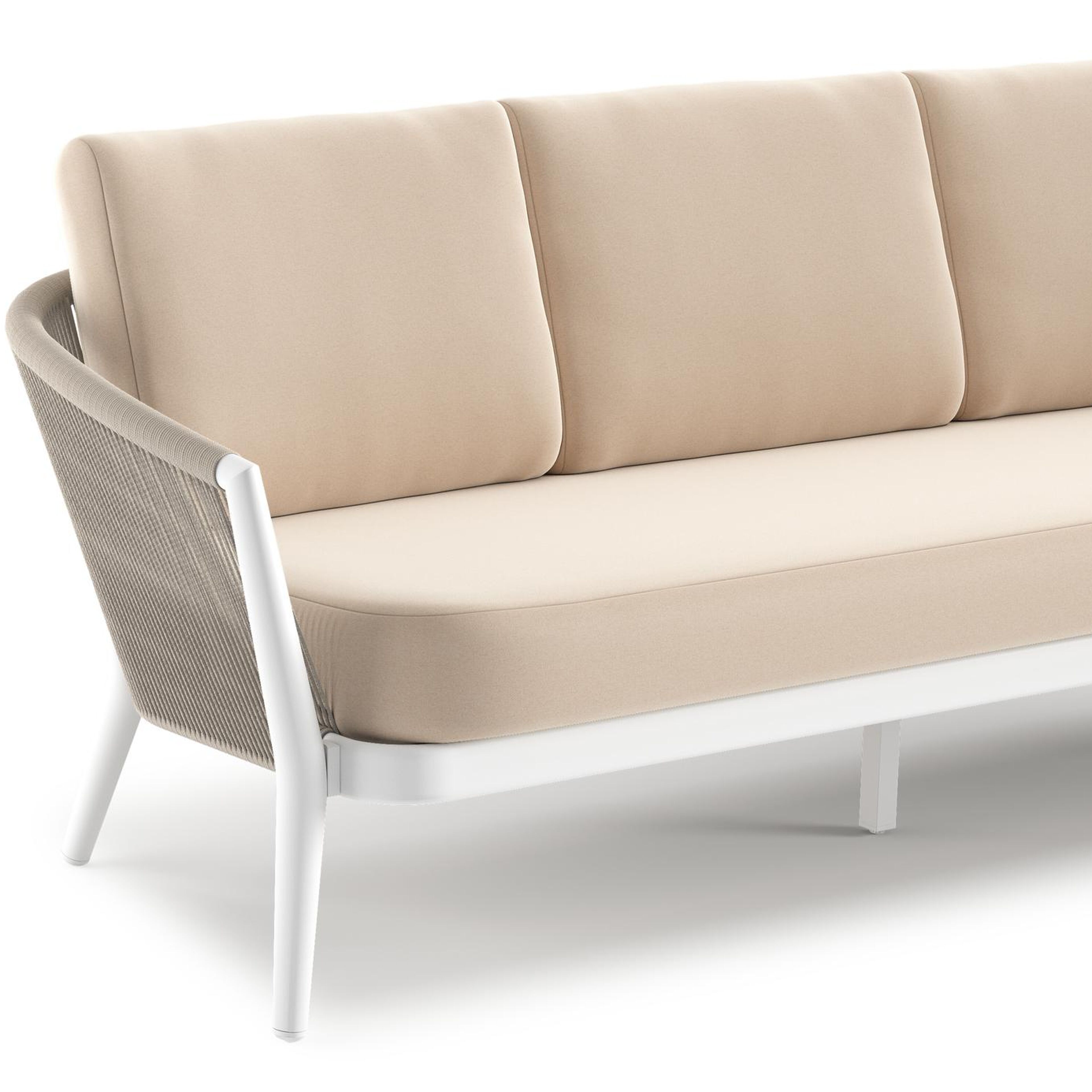 Orso loungebank 3-zit in wit aluminium en beige verticaal geweven ronde rope met natte linen chalk all weather sunbrella® luxe kussen | Exterioo mobilier de jardin