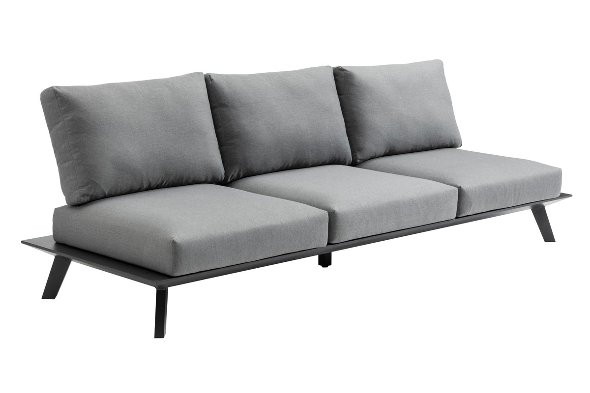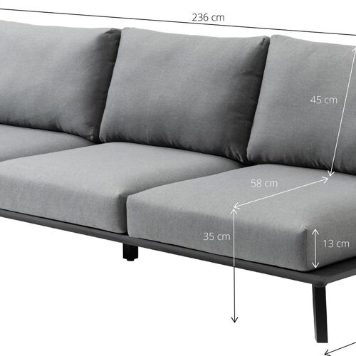 Lounge 3 pl en aluminium noir mat. Coussins d'assise et de dossier en toile Weather+ Softtouch grise inclus. Dimension totale : Lg 236 x P 82 x H 63,5 cm.