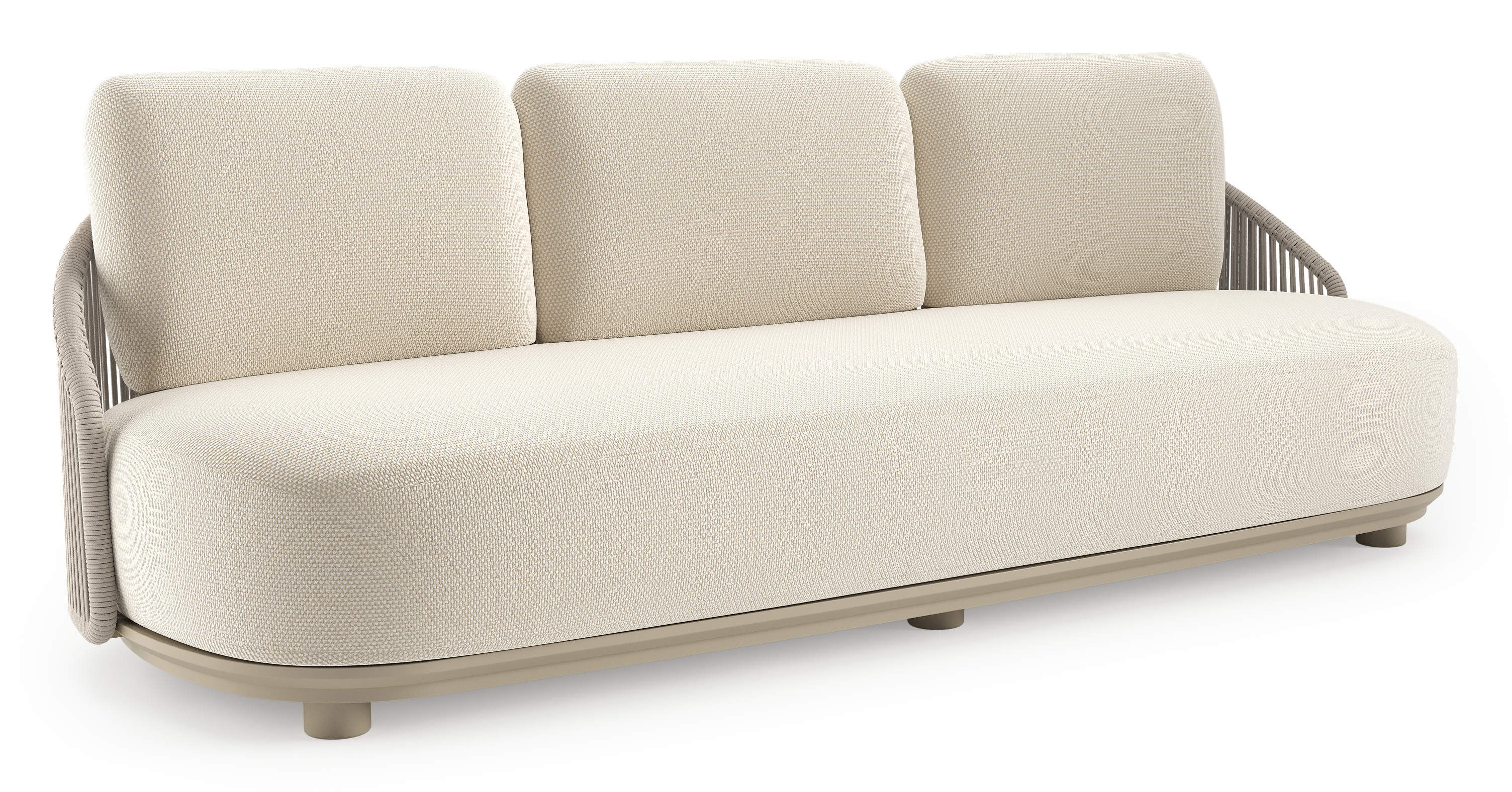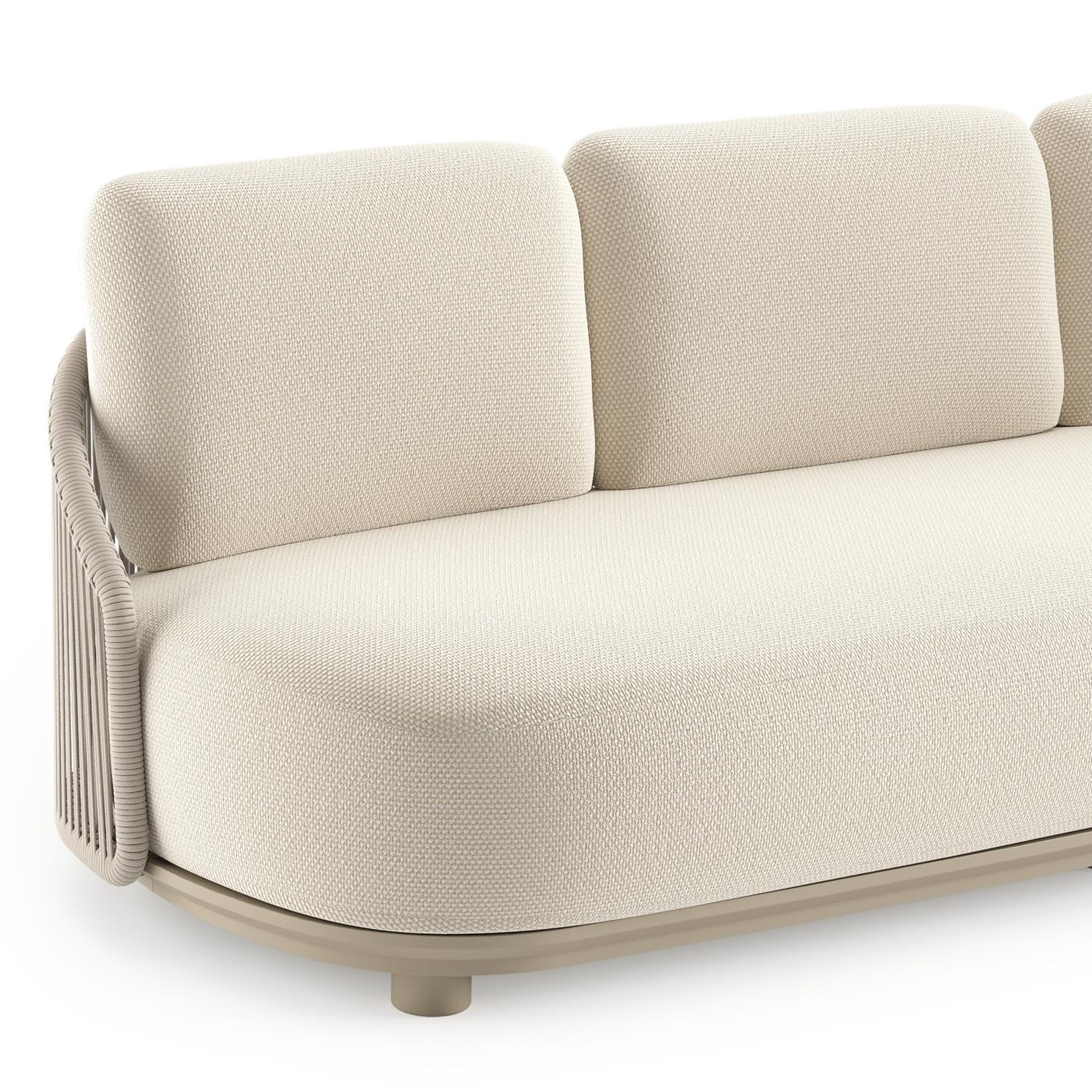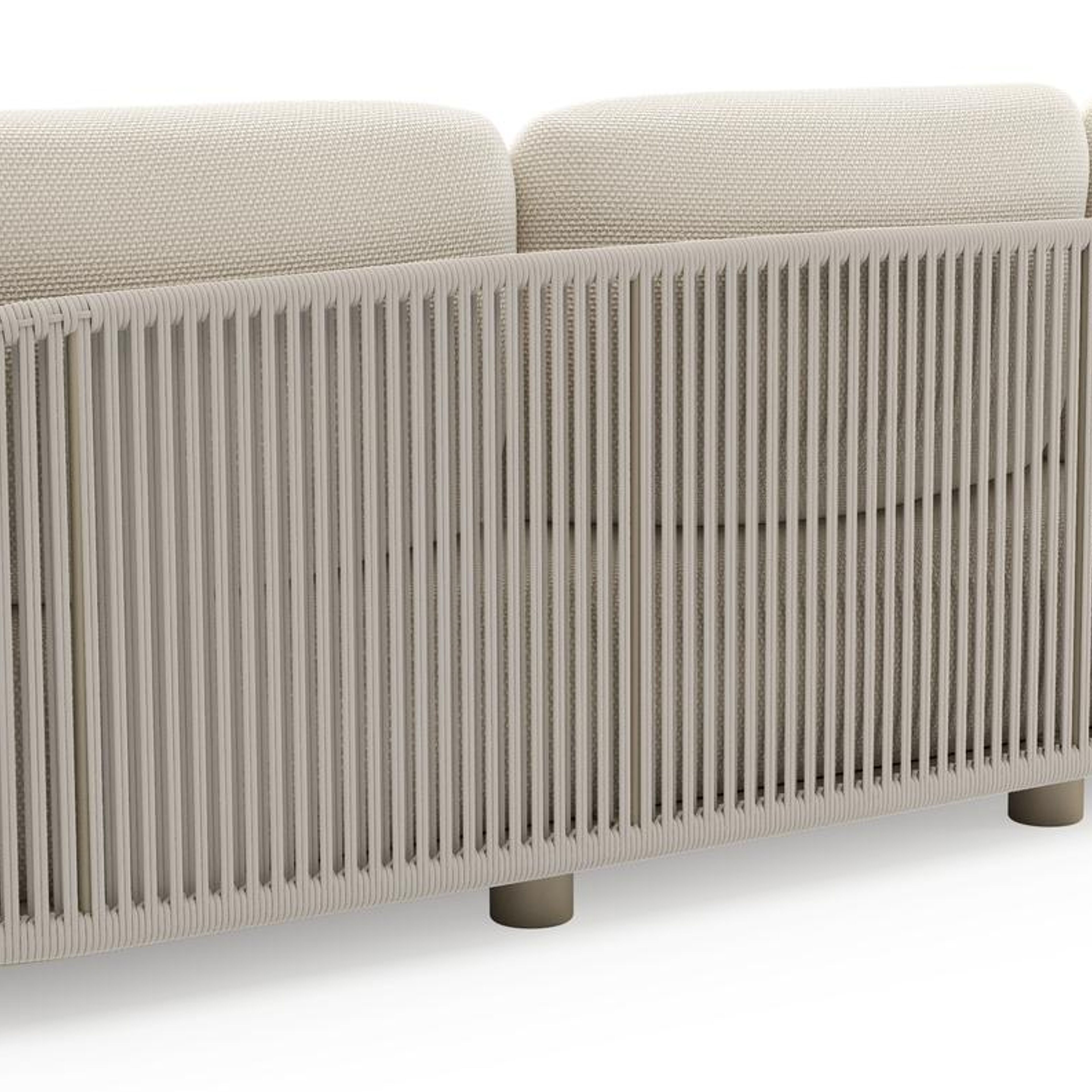 Canapé de jardin Vadelo en aluminium beige et corde ronde tissée verticalement beige et coussins en all weather cosytica althea off white | Exterioo mobilier de jardin