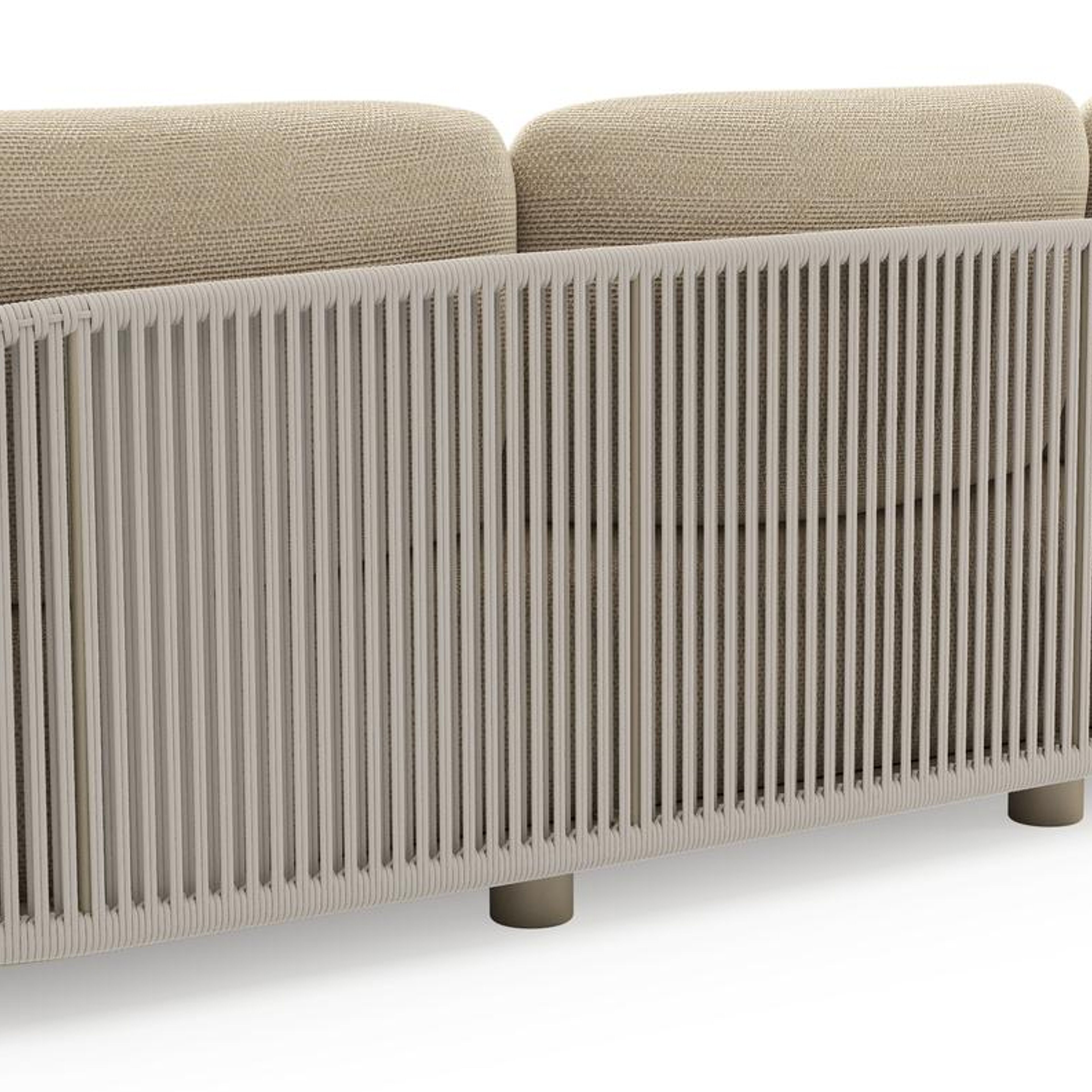 Canapé de jardin Vadelo en aluminium beige et corde ronde tissée verticalement beige et coussins en all weather cosytica althea camel | Exterioo mobilier de jardin