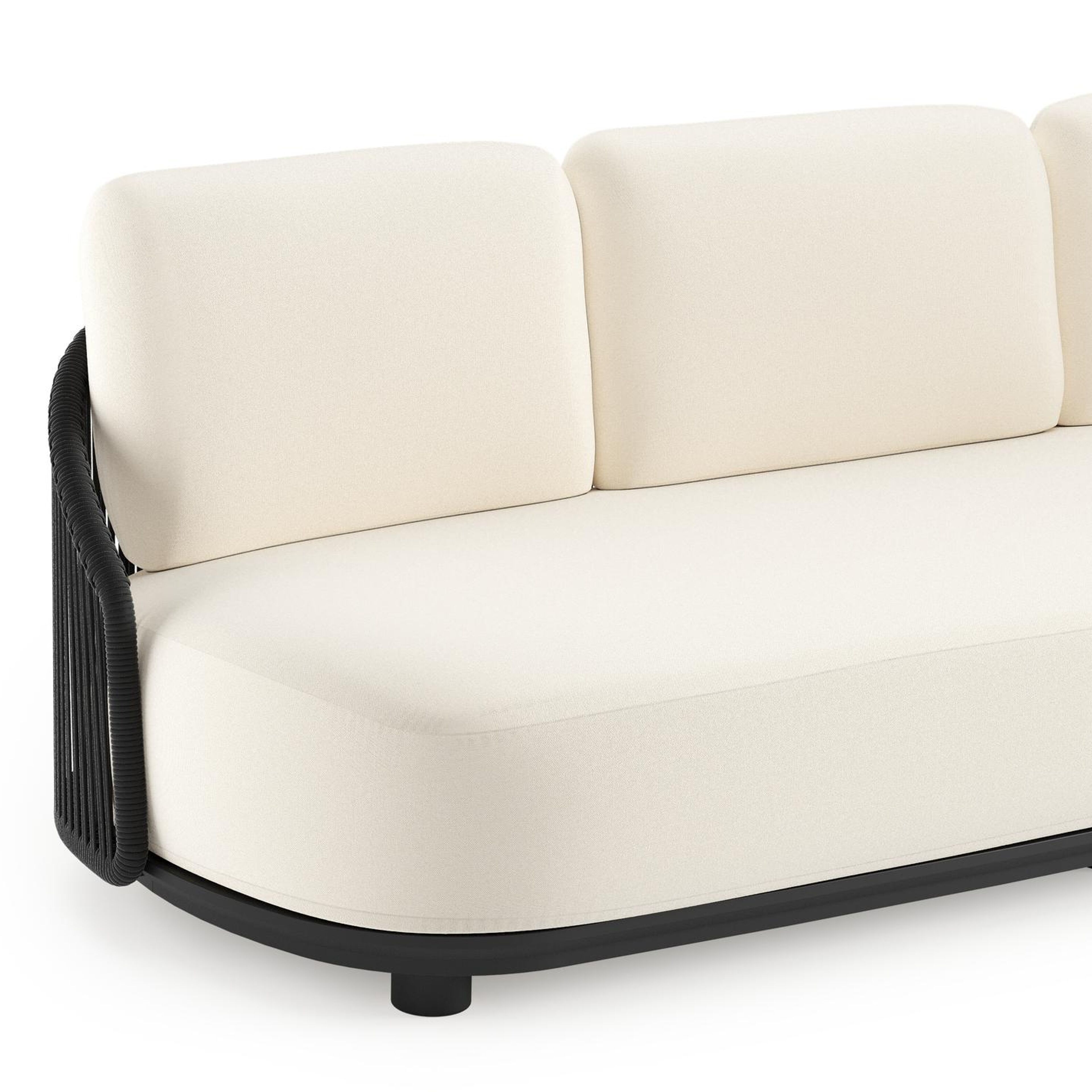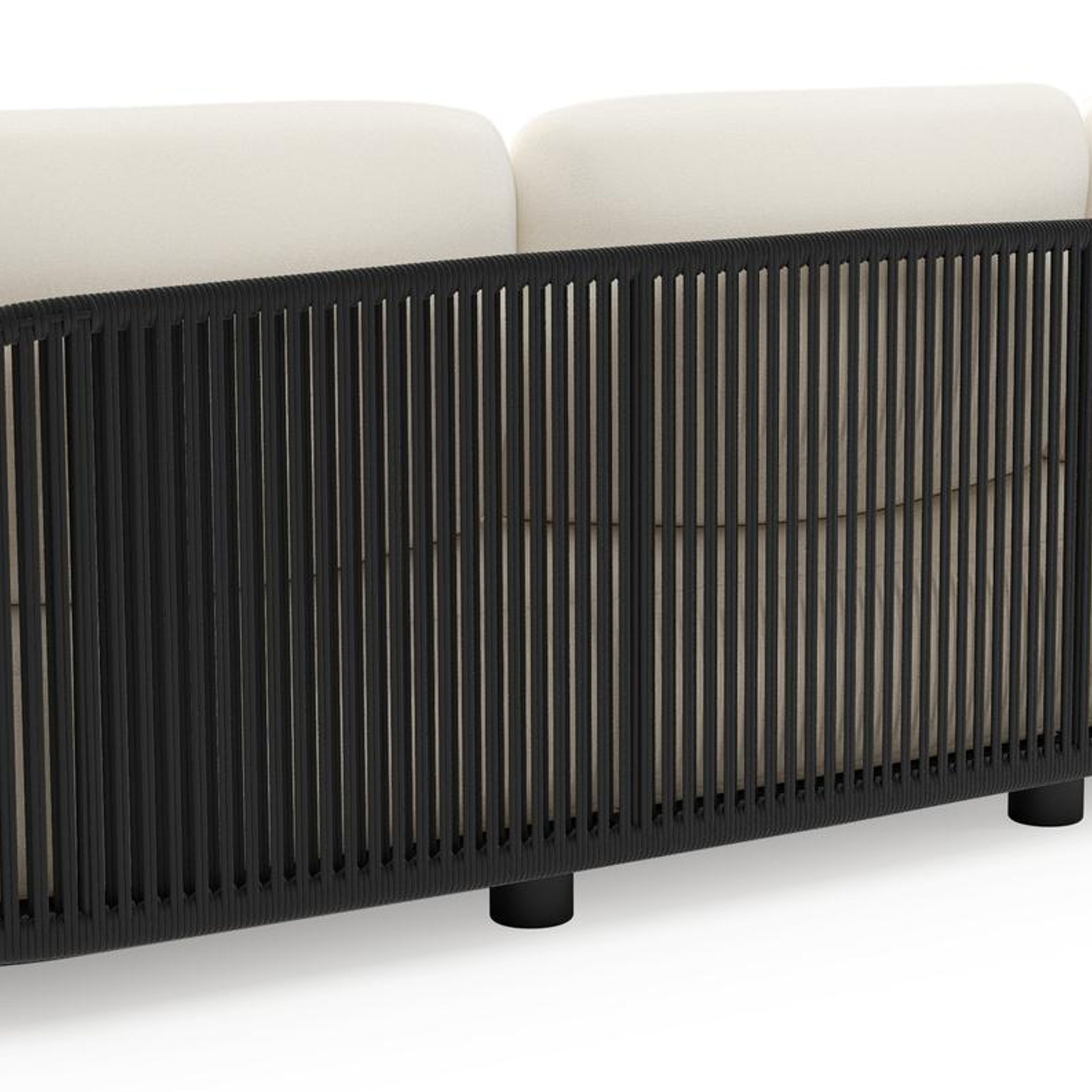 Canapé de jardin Vadelo en aluminium noir et corde ronde tissée verticalement noir et coussins en all weather sunbrella® luxe natte white | Exterioo mobilier de jardin