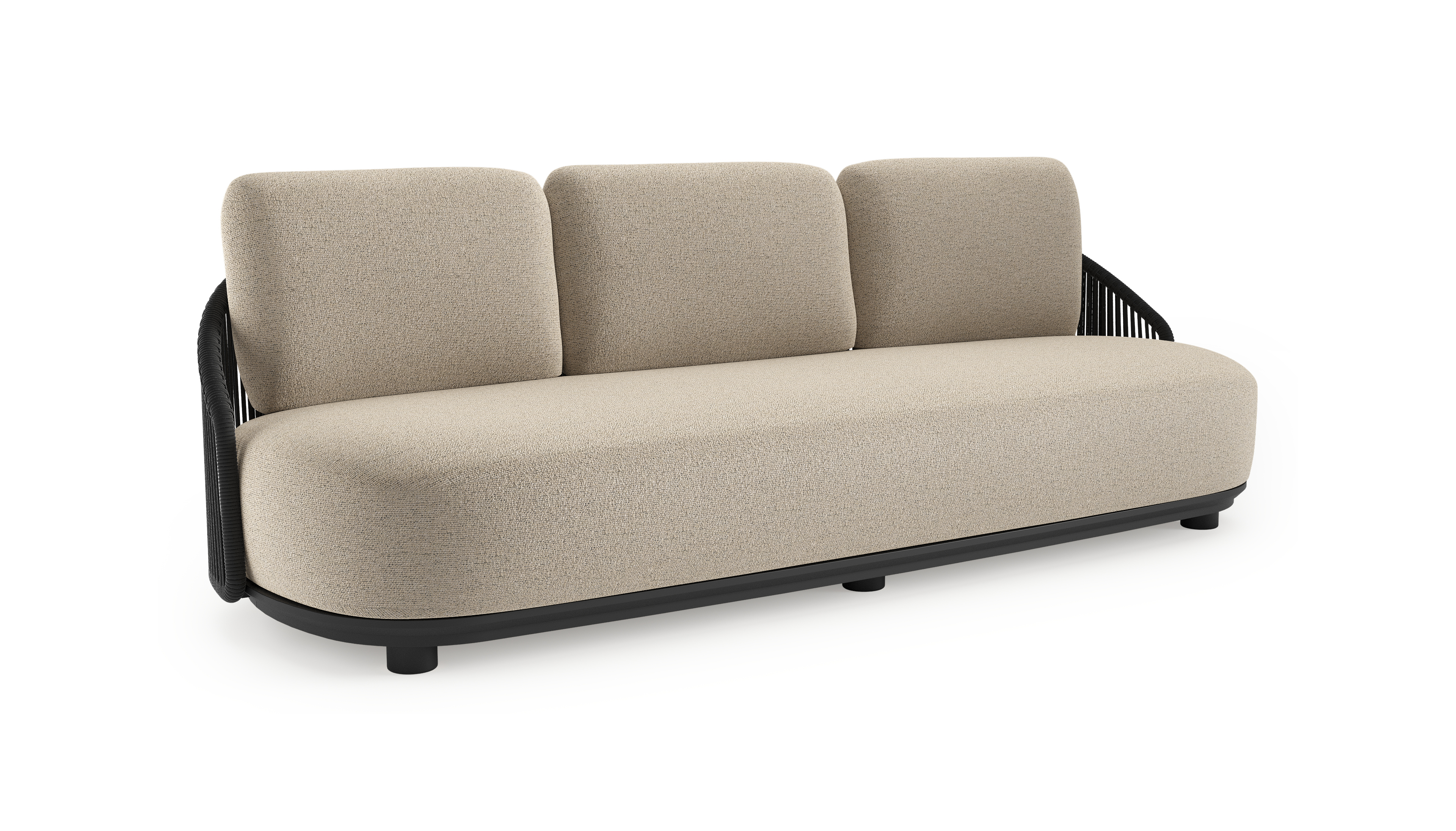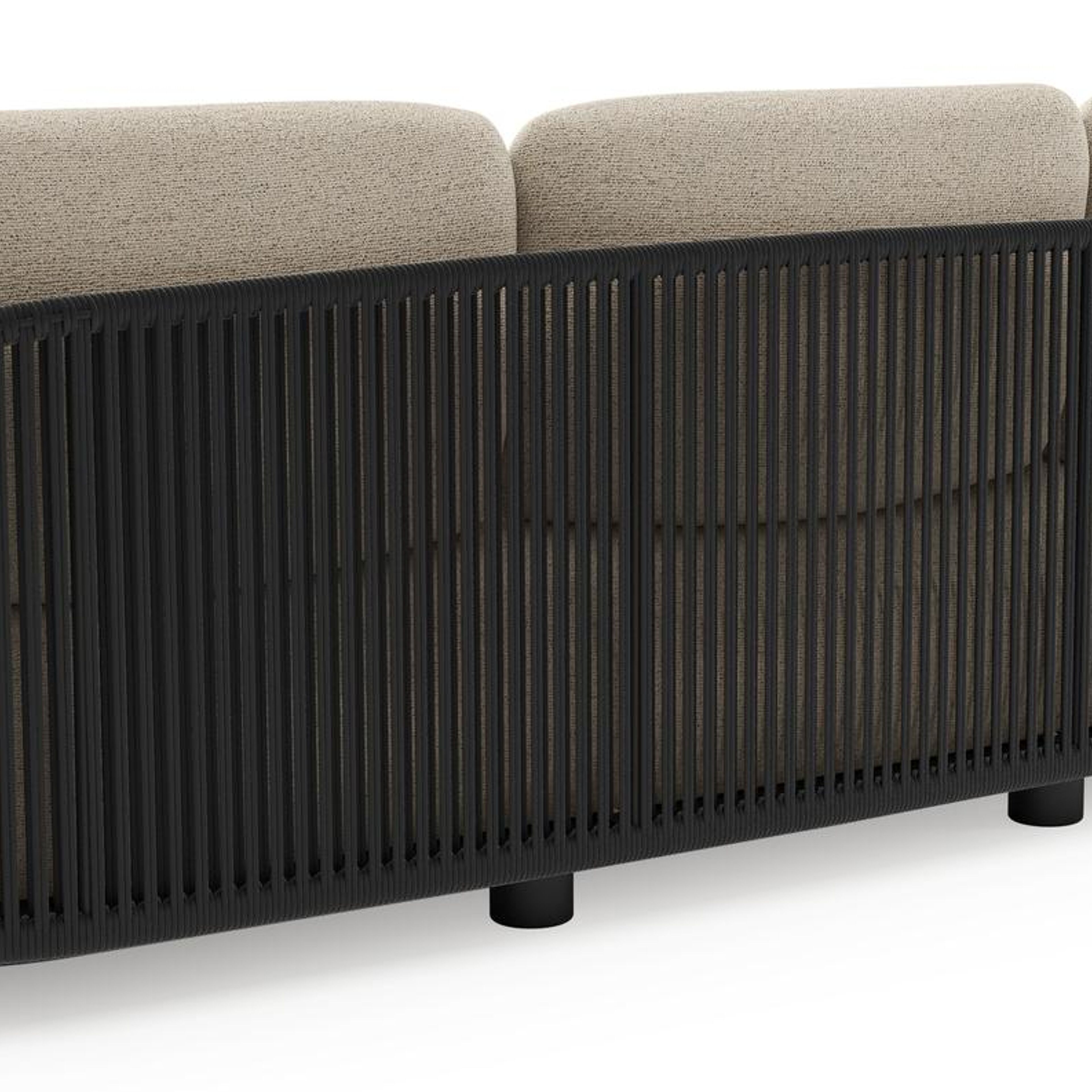 Canapé de jardin Vadelo en aluminium noir et corde ronde tissée verticalement noir et coussins en all weather cosytica marbella beige | Exterioo mobilier de jardin