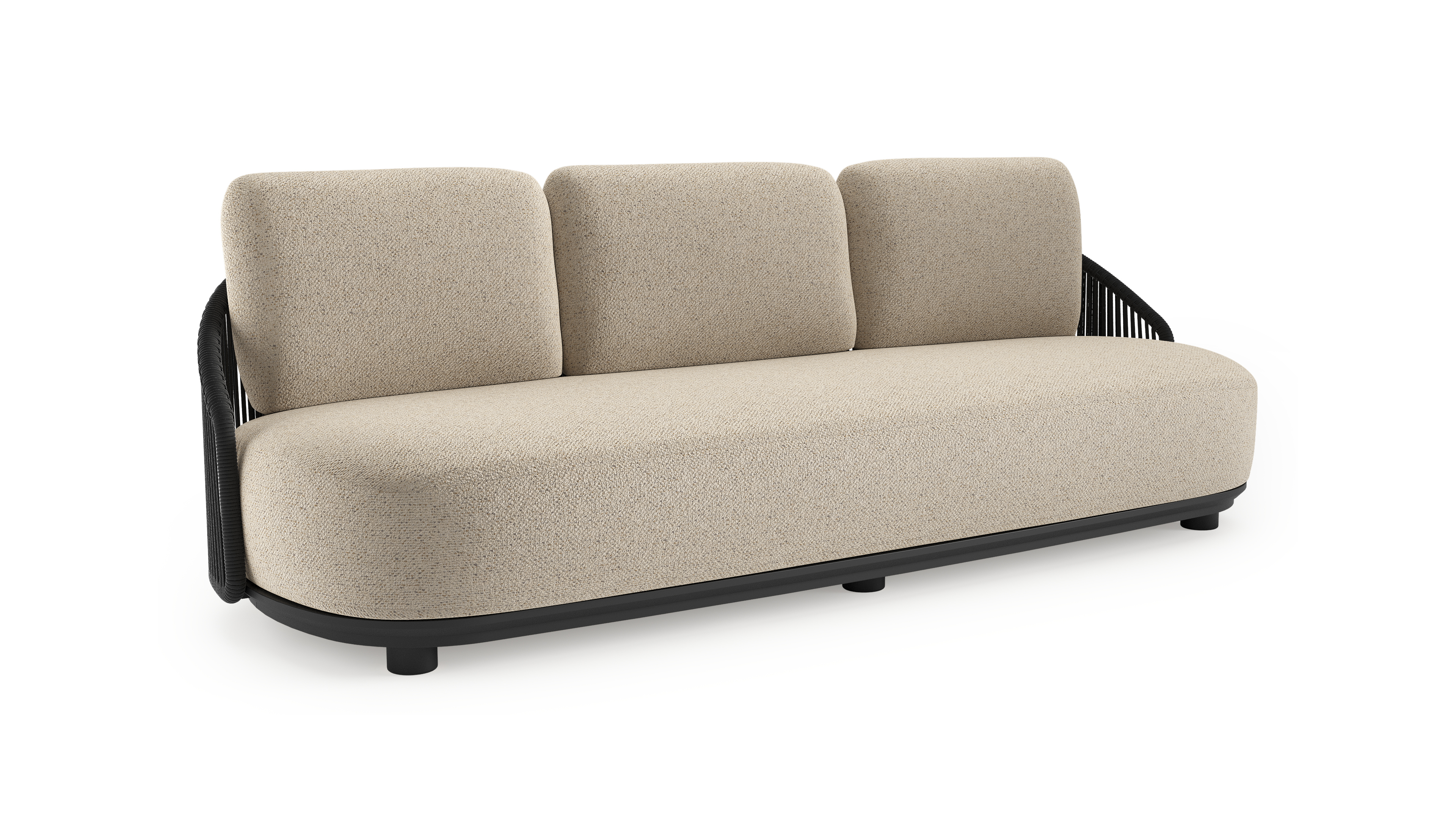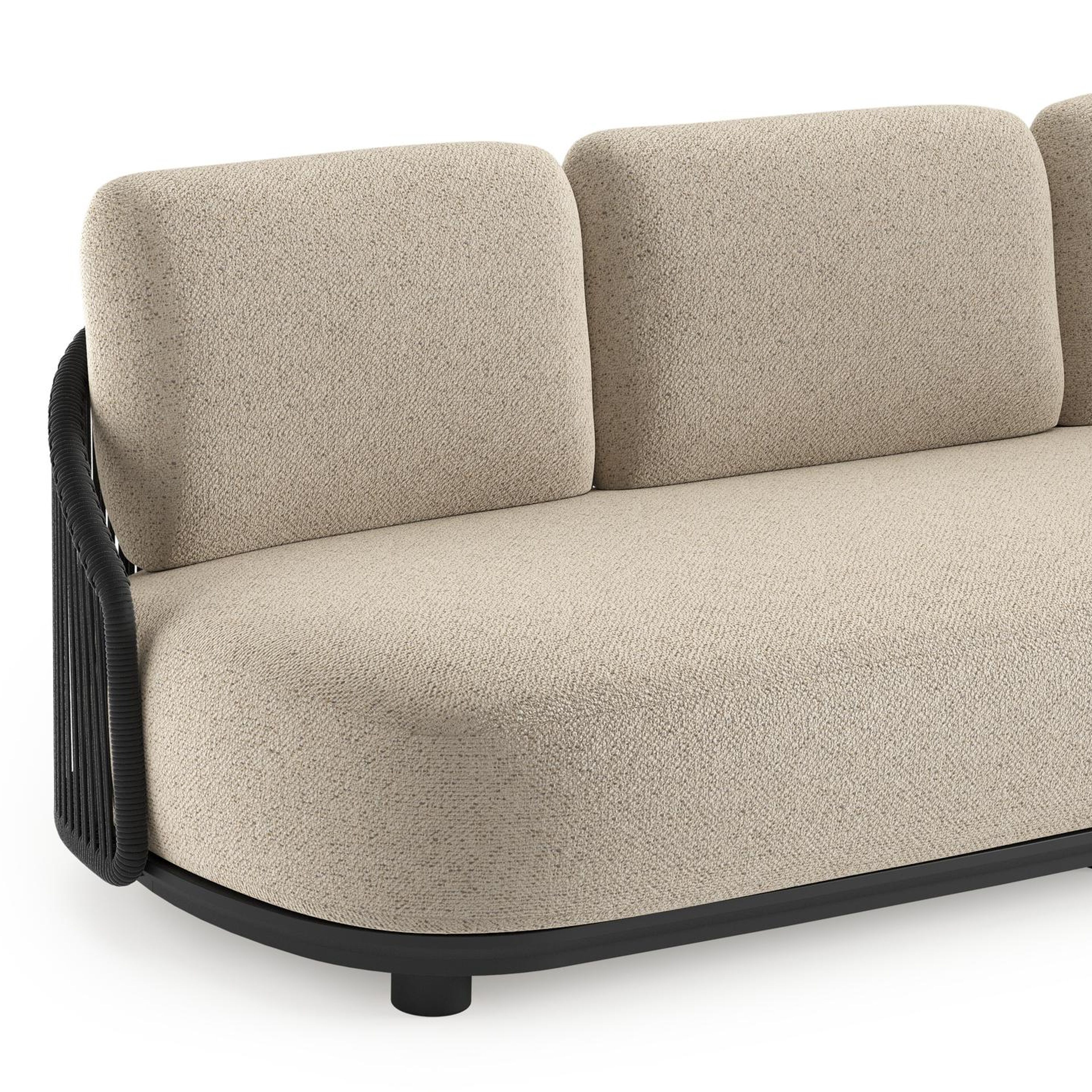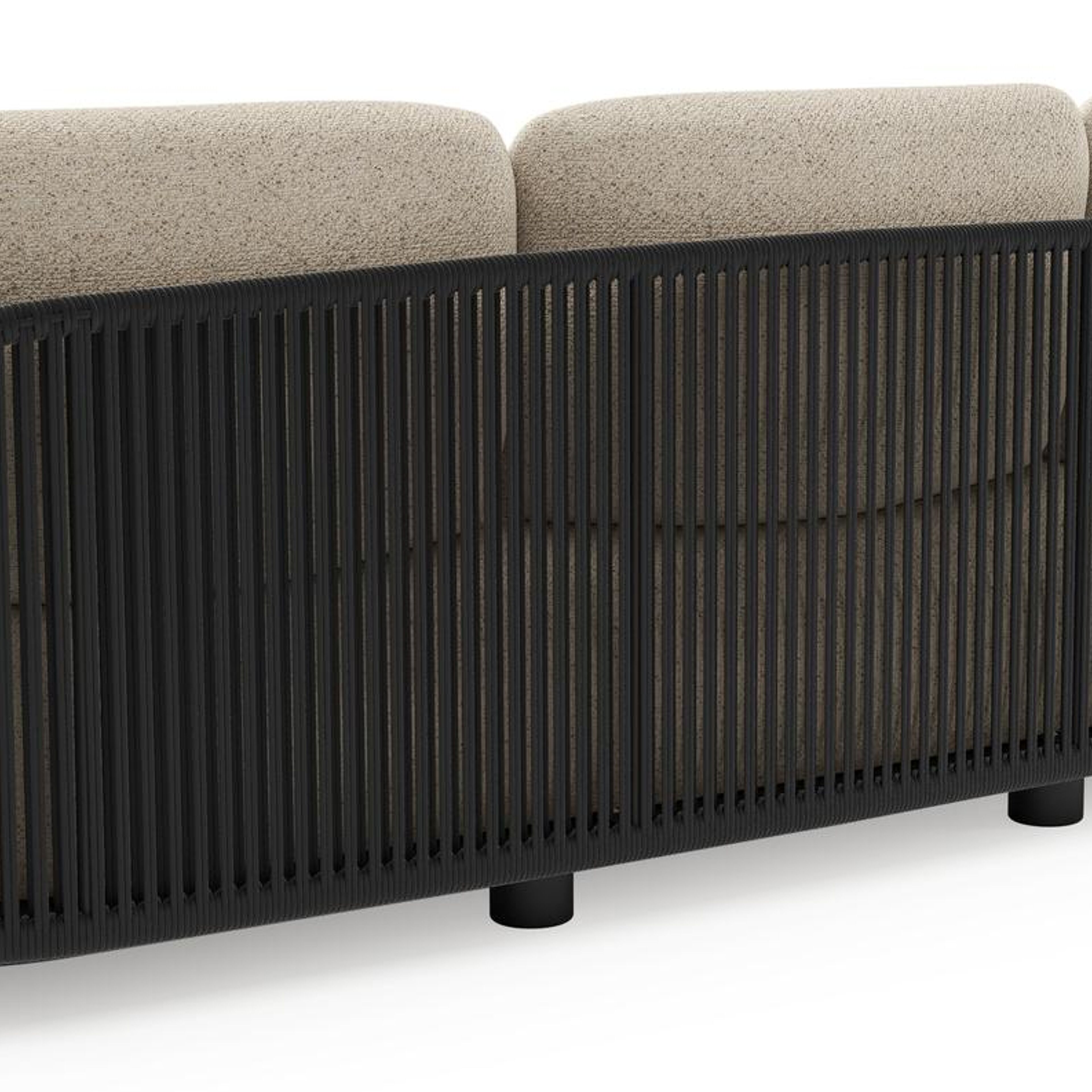 Canapé de jardin Vadelo en aluminium noir et corde ronde tissée verticalement noir et coussins en all weather cosytica bora desert | Exterioo mobilier de jardin