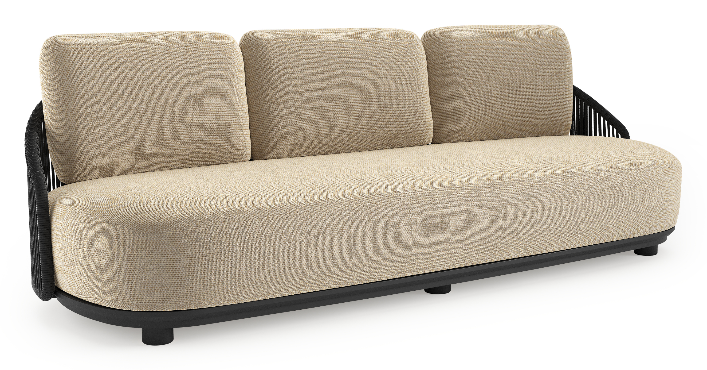 Canapé de jardin Vadelo en aluminium noir et corde ronde tissée verticalement noir et coussins en all weather cosytica althea camel | Exterioo mobilier de jardin