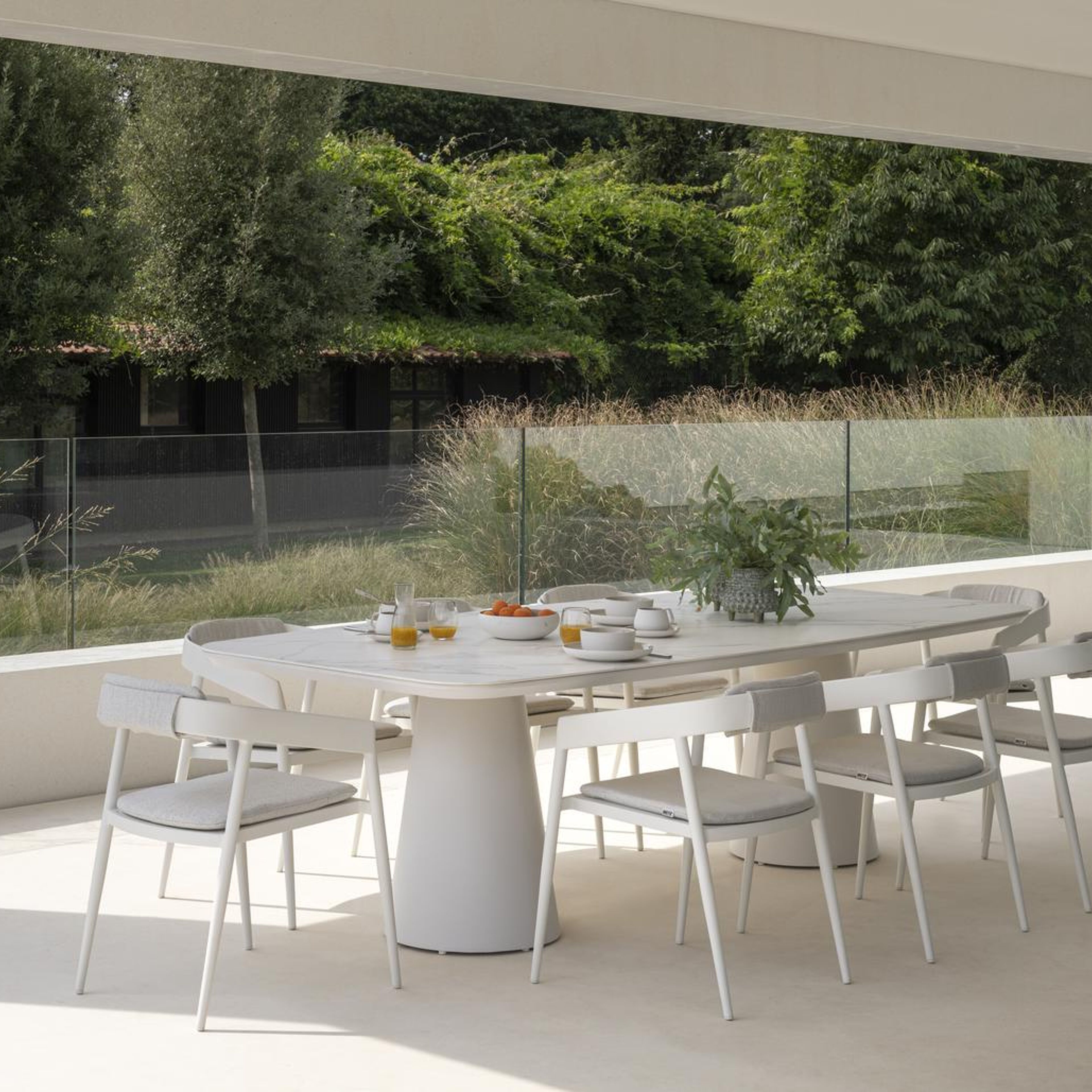La chaise Donato s'intégrera parfaitement à votre terrasse. Less is more est la philosophie qui définit parfaitement la conception de cette chaise. Avec sa simplicité, elle dégage une véritable classe et peut être parfaitement combinée avec votre table idéale. La chaise est entièrement fabriquée en aluminium, ce qui la rend inoxydable. Grâce à la présence d'un revêtement de protection en poudre, elle est totalement résistante aux UV. Nous recommandons un coussin d'assise et de dossier pour un confort optimal. Demandez conseil dans nos showrooms ou auprès de nos conseillers en ligne.