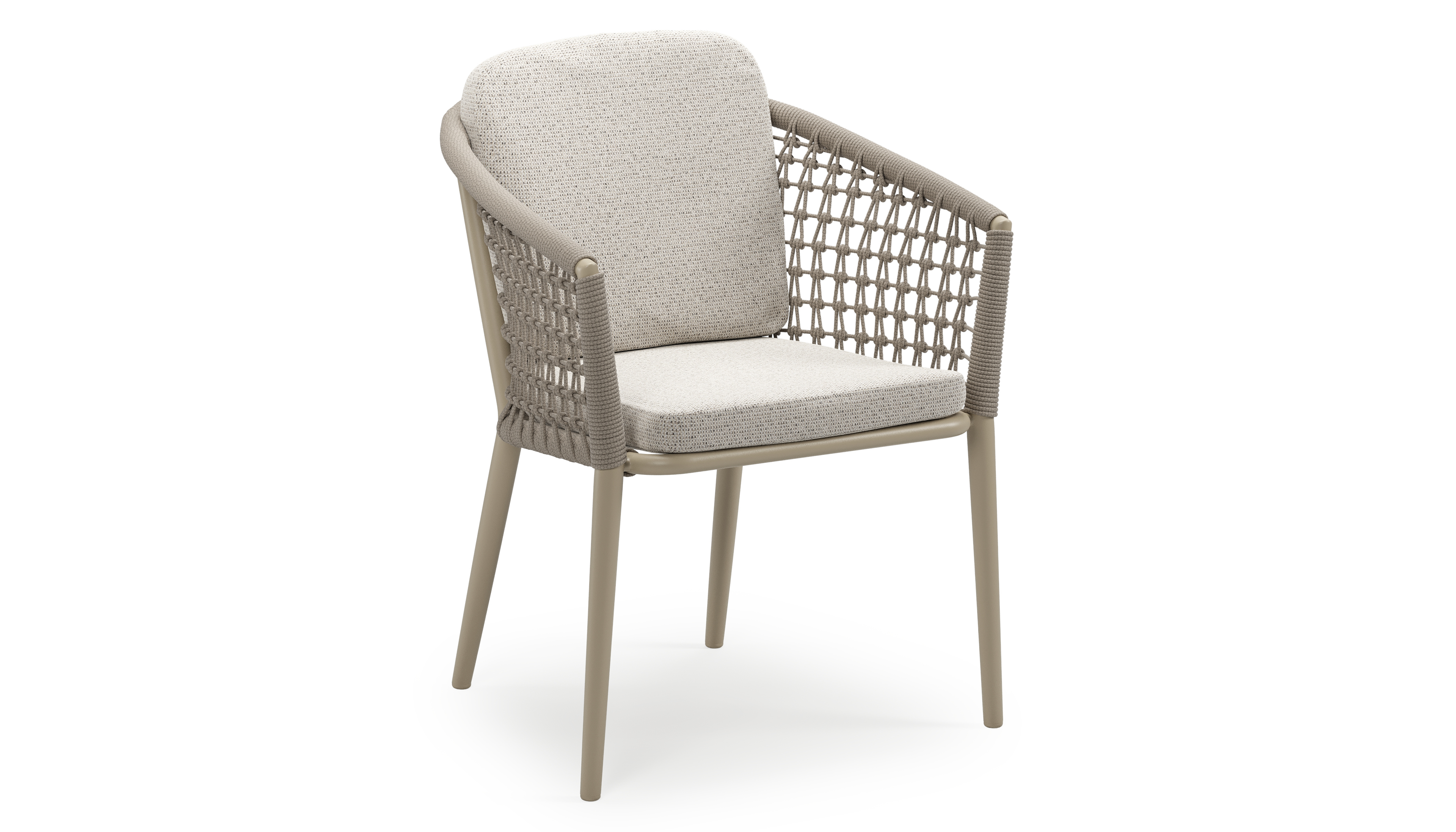 Chaise de jardin empilable Orso en aluminium beige et corde ronde tissée résille beige avec coussin en All Weather Solica Firenze Natural | Exterioo mobilier de jardin