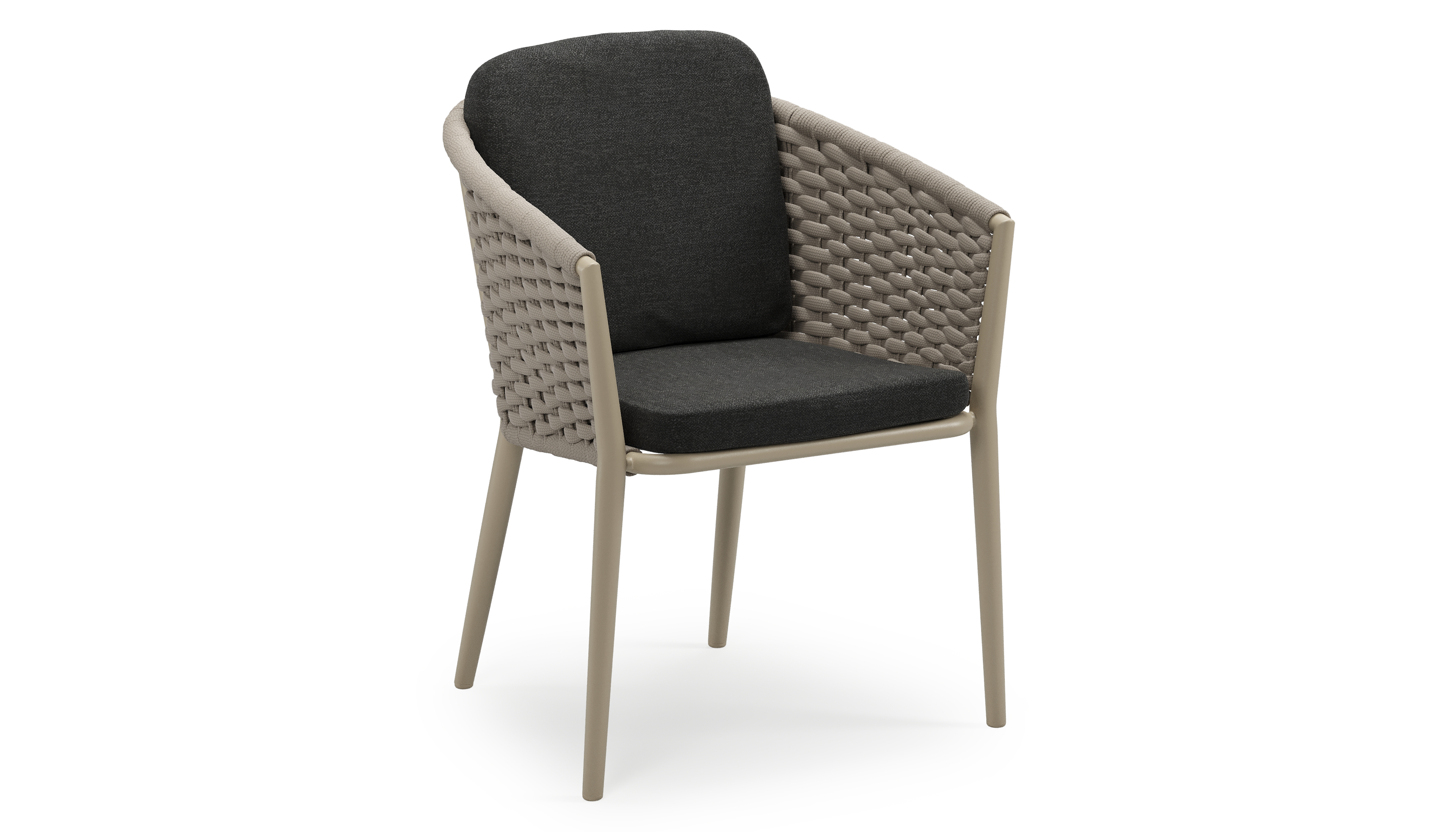 Chaise de jardin empilable Orso en aluminium beige et corde ronde tissée horizontalement beige avec coussin en All Weather Sunbrella® Luxe Chartres Sooty | Exterioo mobilier de jardin
