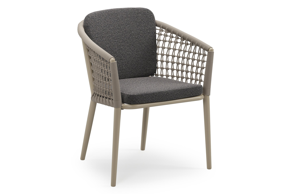 Chaise de jardin empilable Orso en aluminium beige et corde ronde tissée résille beige avec coussin en All Weather Solica Firenze Tunder | Exterioo