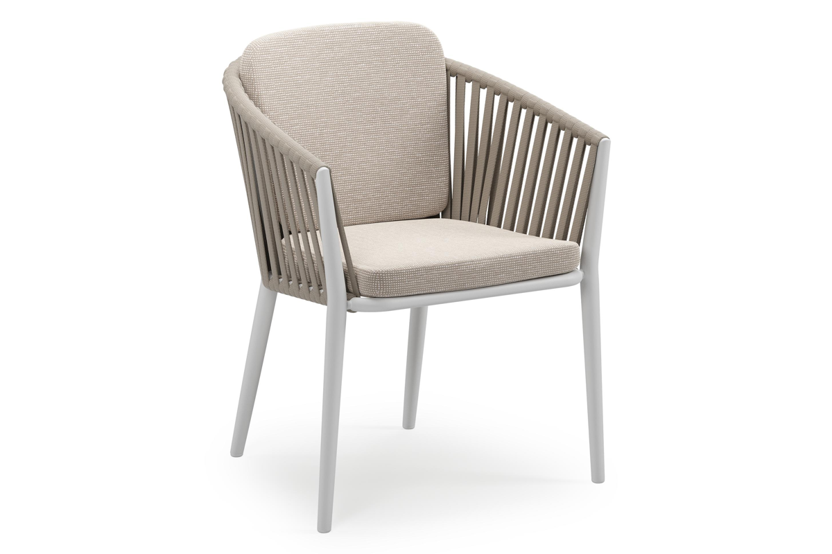 Chaise de jardin empilable Orso en aluminium blanc et corde large plate de luxe tissée verticalement beige avec coussin en All Weather Sunbrella® Luxe Slow Farafra | Exterioo