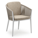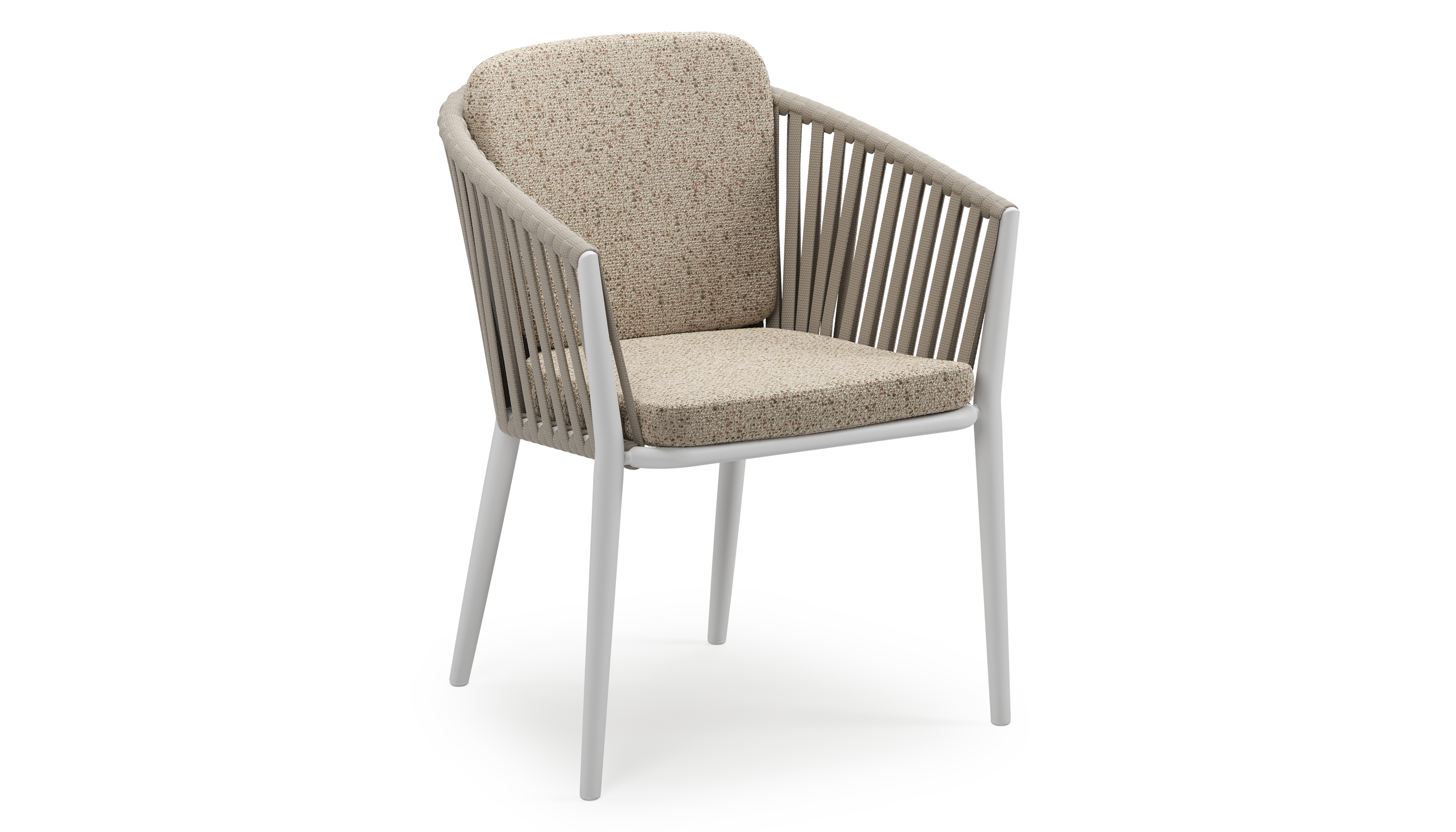 Chaise de jardin empilable Orso en aluminium blanc et corde large plate de luxe tissée verticalement beige avec coussin en All Weather Cosytica Bora Jungle | Exterioo mobilier de jardin