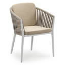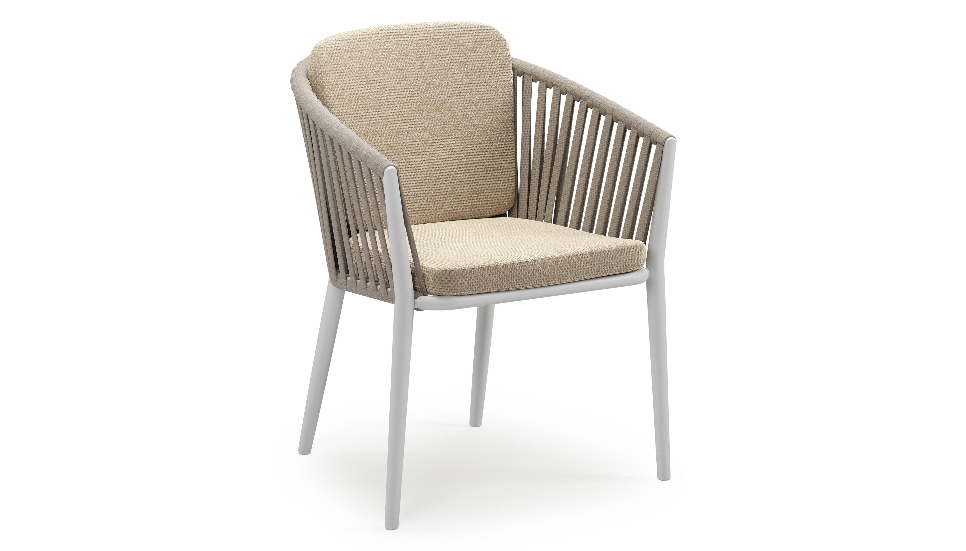 Chaise de jardin empilable Orso en aluminium blanc et corde large plate de luxe tissée verticalement beige avec coussin en All Weather Cosytica Althea Camel | Exterioo mobilier de jardin