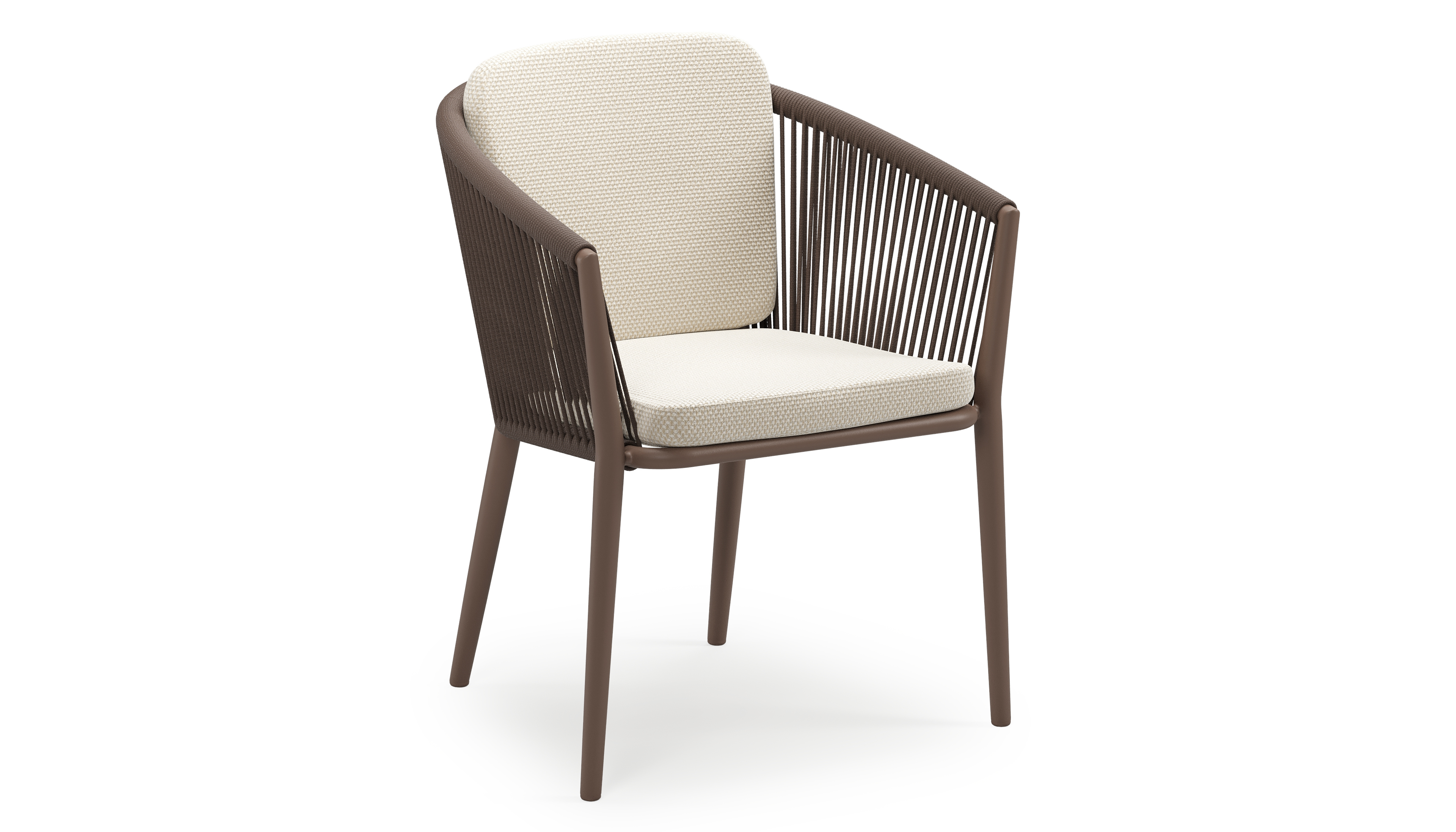 Chaise de jardin empilable Orso en aluminium taupe et corde ronde tissée verticalement taupe avec coussin en All Weather Cosytica Althea Off White | Exterioo mobilier de jardin
