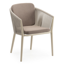 Chaise de jardin empilable Orso en aluminium brun foncé et corde ronde tissée verticalement brun foncé avec coussin en All Weather Sunbrella® Luxe Savane Earth | Exterioo mobilier de jardin