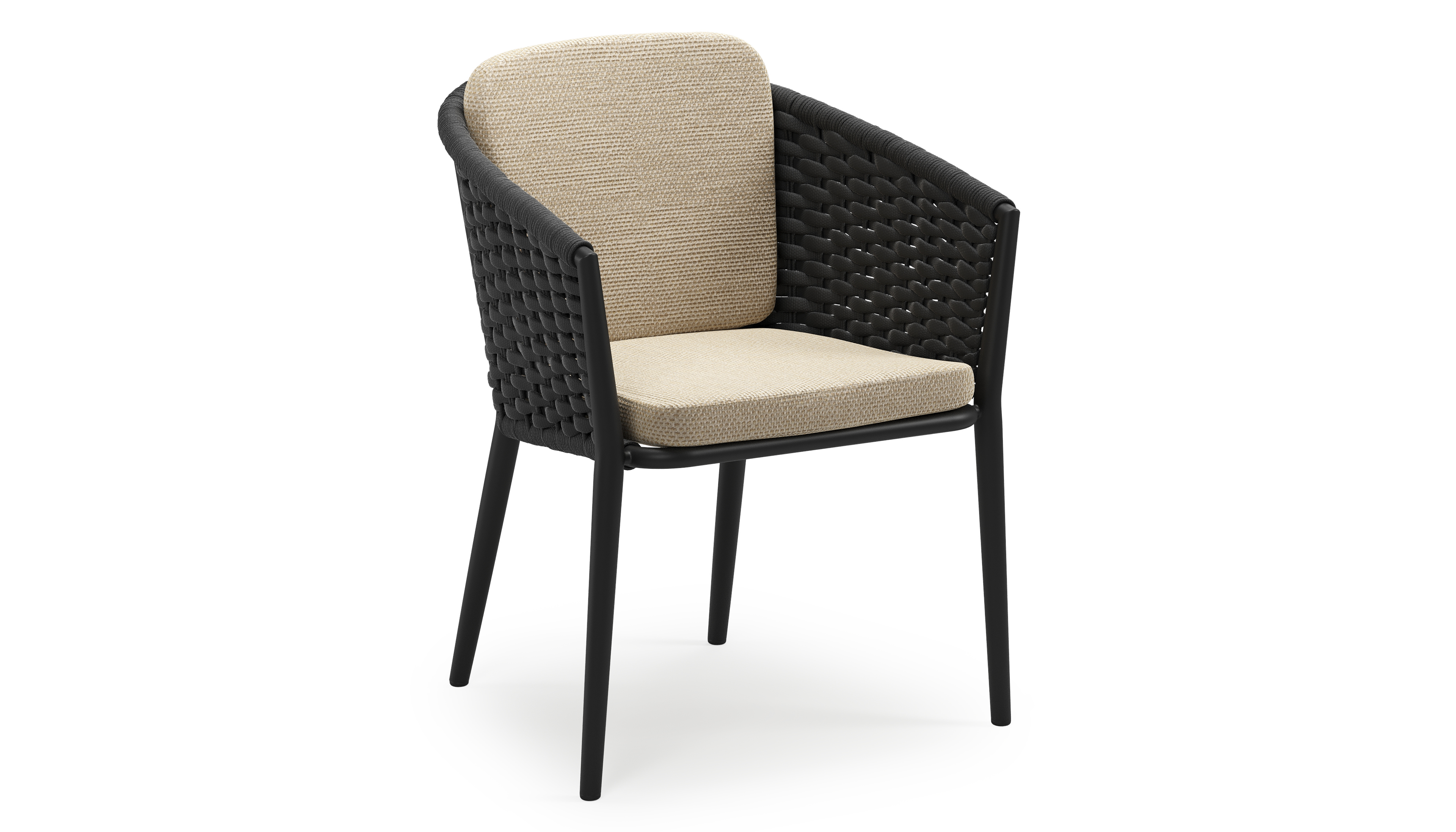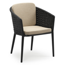 Chaise de jardin empilable Orso en aluminium noir et corde ronde tissée horizontalement noir avec coussin en All Weather Cosytica Althea Camel | Exterioo mobilier de jardin