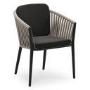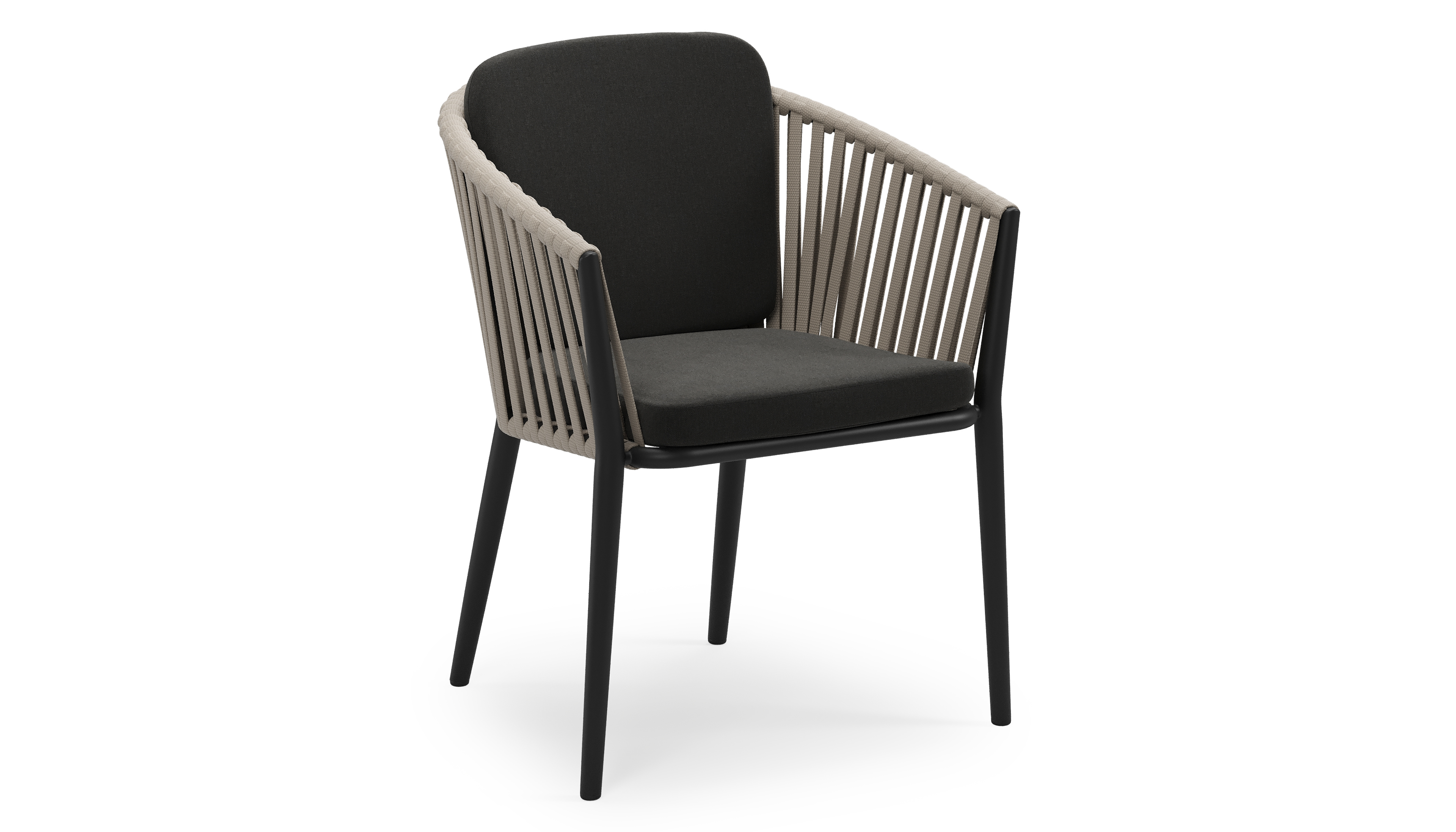Chaise de jardin empilable Orso en aluminium noir et corde large plate de luxe tissée verticalement beige avec coussin en All Weather Sunbrella® Luxe Natte Sooty | Exterioo mobilier de jardin