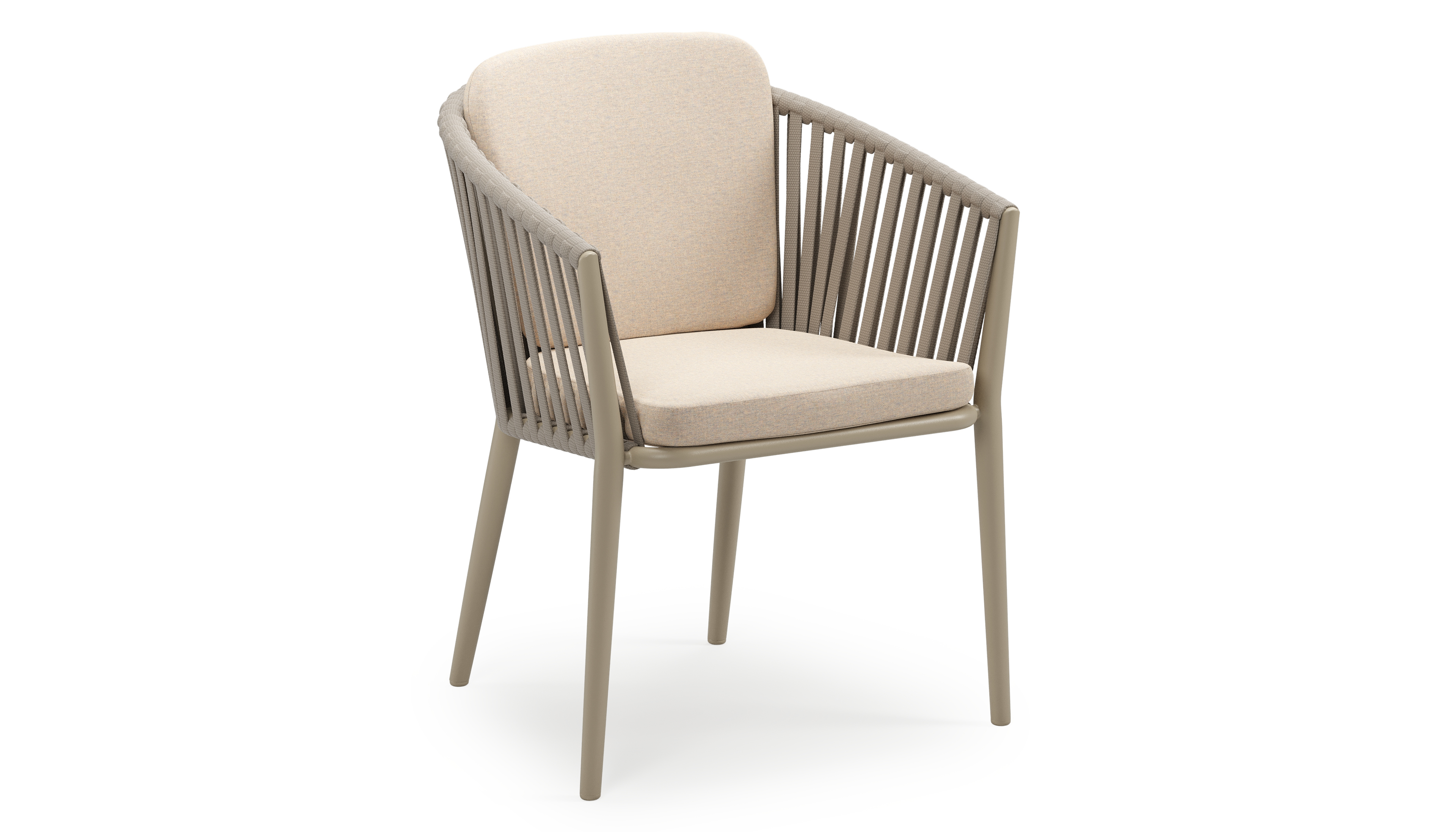 Chaise de jardin empilable Orso en aluminium beige et corde large plate de luxe tissée verticalement beige avec coussin en All Weather Sunbrella® Luxe Heritage Papyrus | Exterioo mobilier de jardin