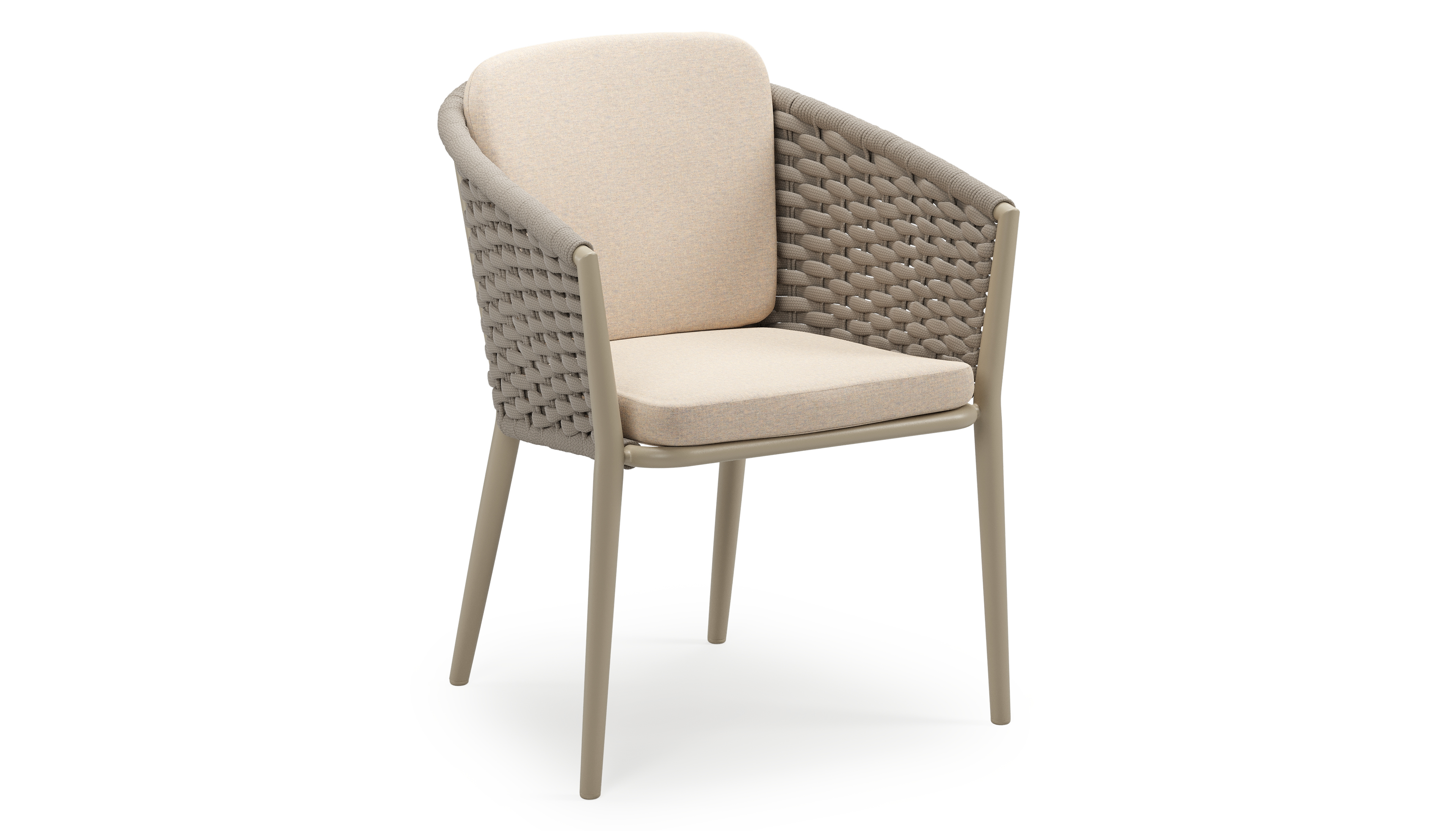 Chaise de jardin empilable Orso en aluminium beige et corde ronde tissée horizontalement beige avec coussin en All Weather Sunbrella® Luxe Heritage Papyrus | Exterioo mobilier de jardin