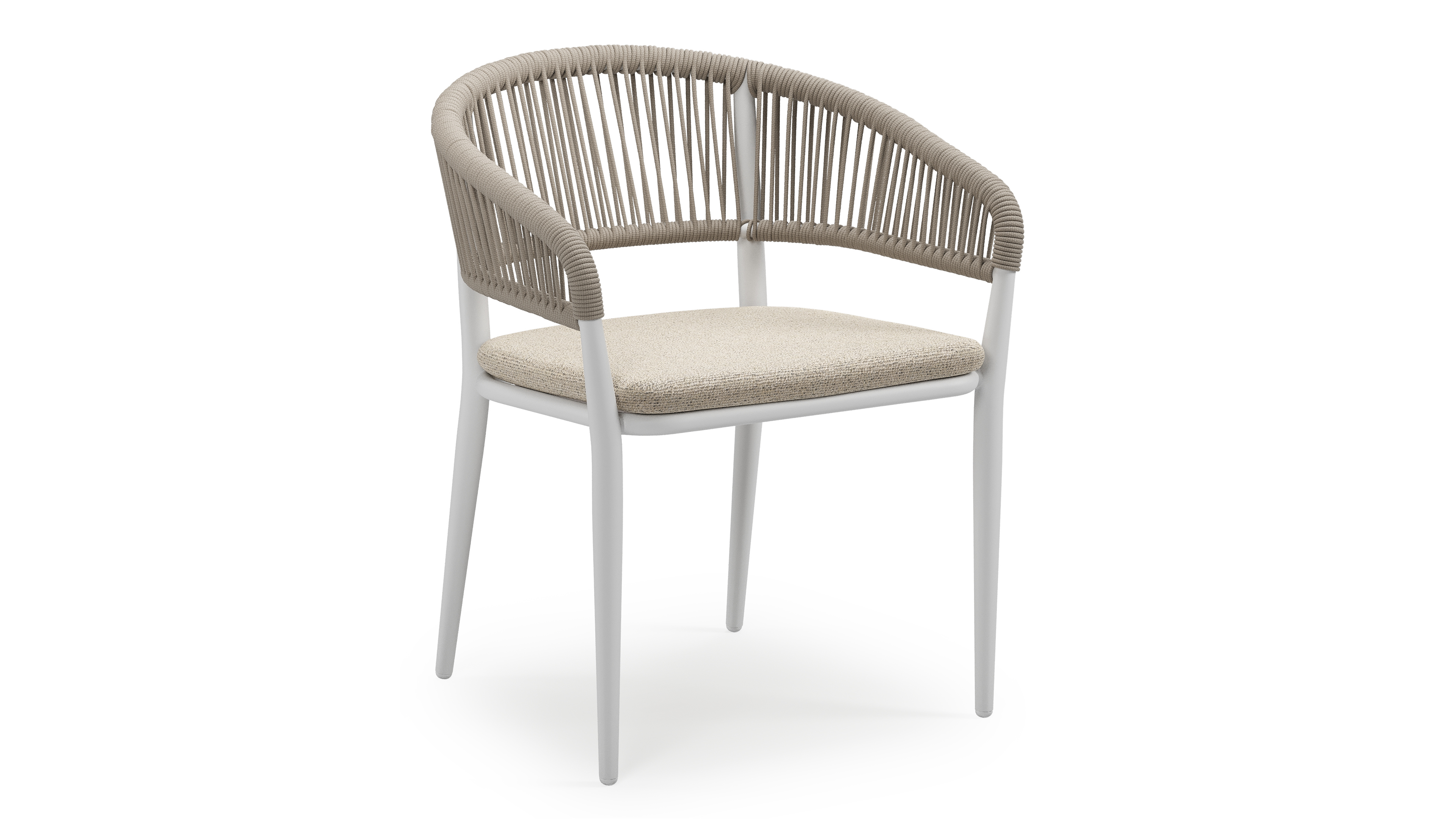Chaise de jardin empilable Tolfa en aluminium blanc et corde ronde tissée verticalement beige avec coussin en All Weather Cosytica Marbella Beige | Exterioo mobilier de jardin