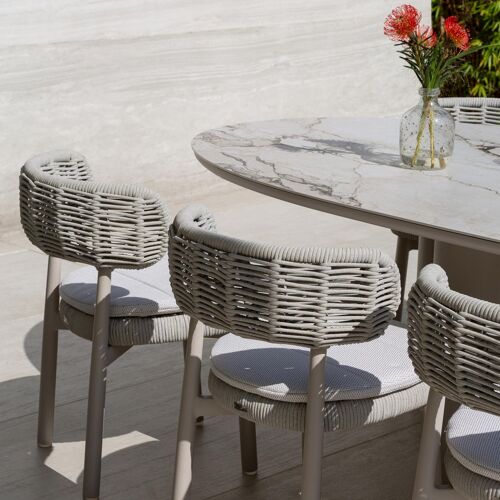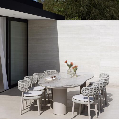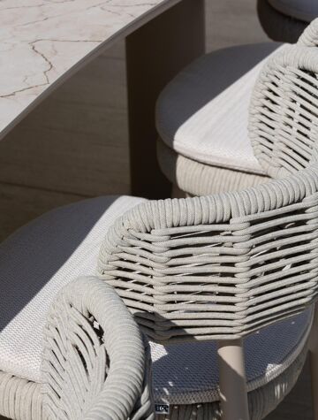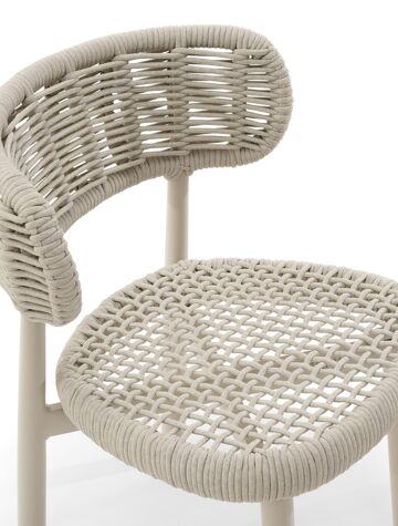 La corde est un fil synthétique composé de plusieurs couches. Ce matériau résistant aux intempéries a un aspect unique et est doux au toucher. La corde est connue pour être facile à entretenir, solide et très confortable. La corde a une forme ronde qui accentue les formes organiques et donne une impression naturel.