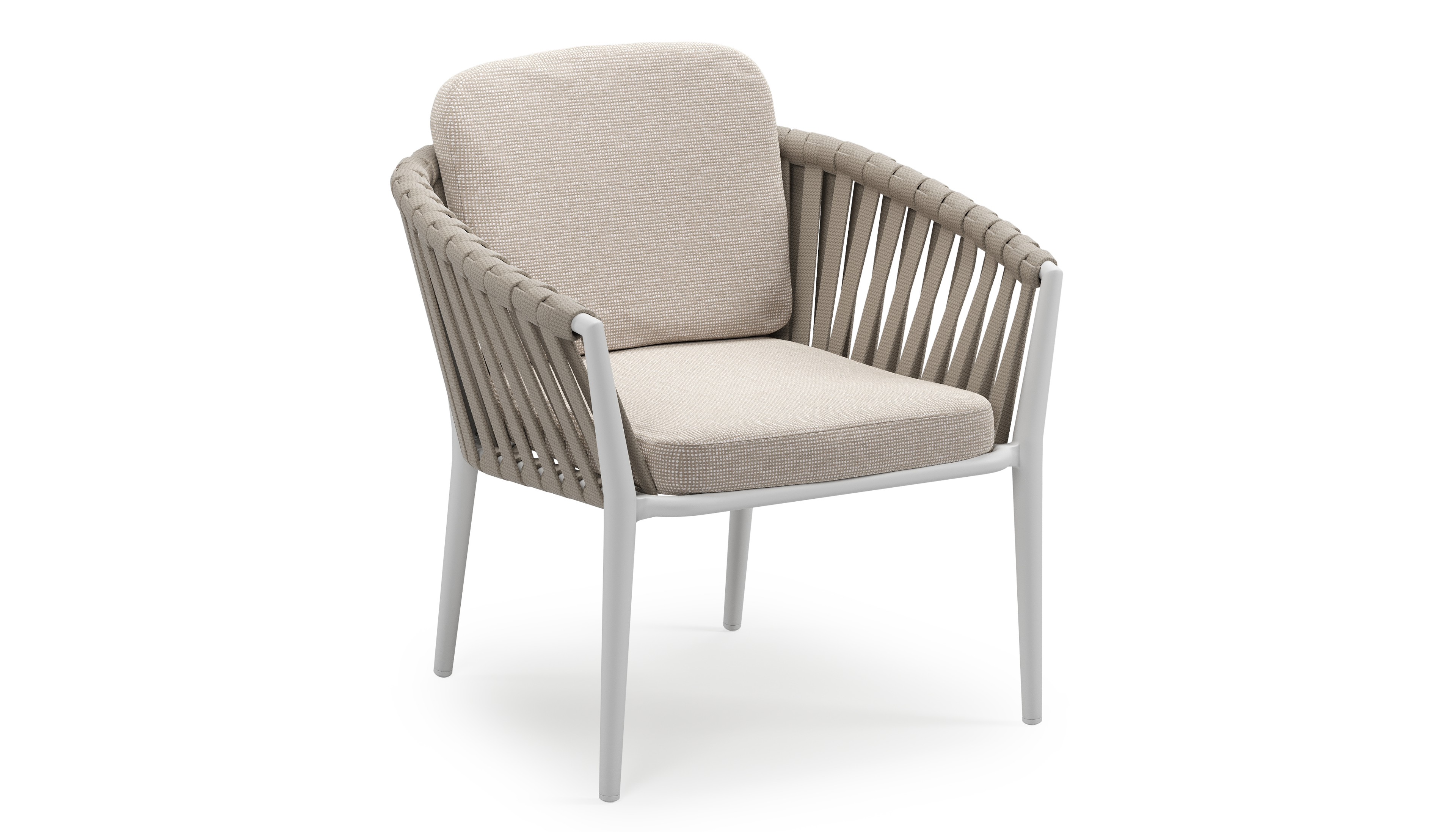 Chaise de jardin low dining Orso en aluminium blanc et corde large plate de luxe tissée verticalement beige avec coussin en All Weather Sunbrella® Luxe Slow Farafra | Exterioo mobilier de jardin