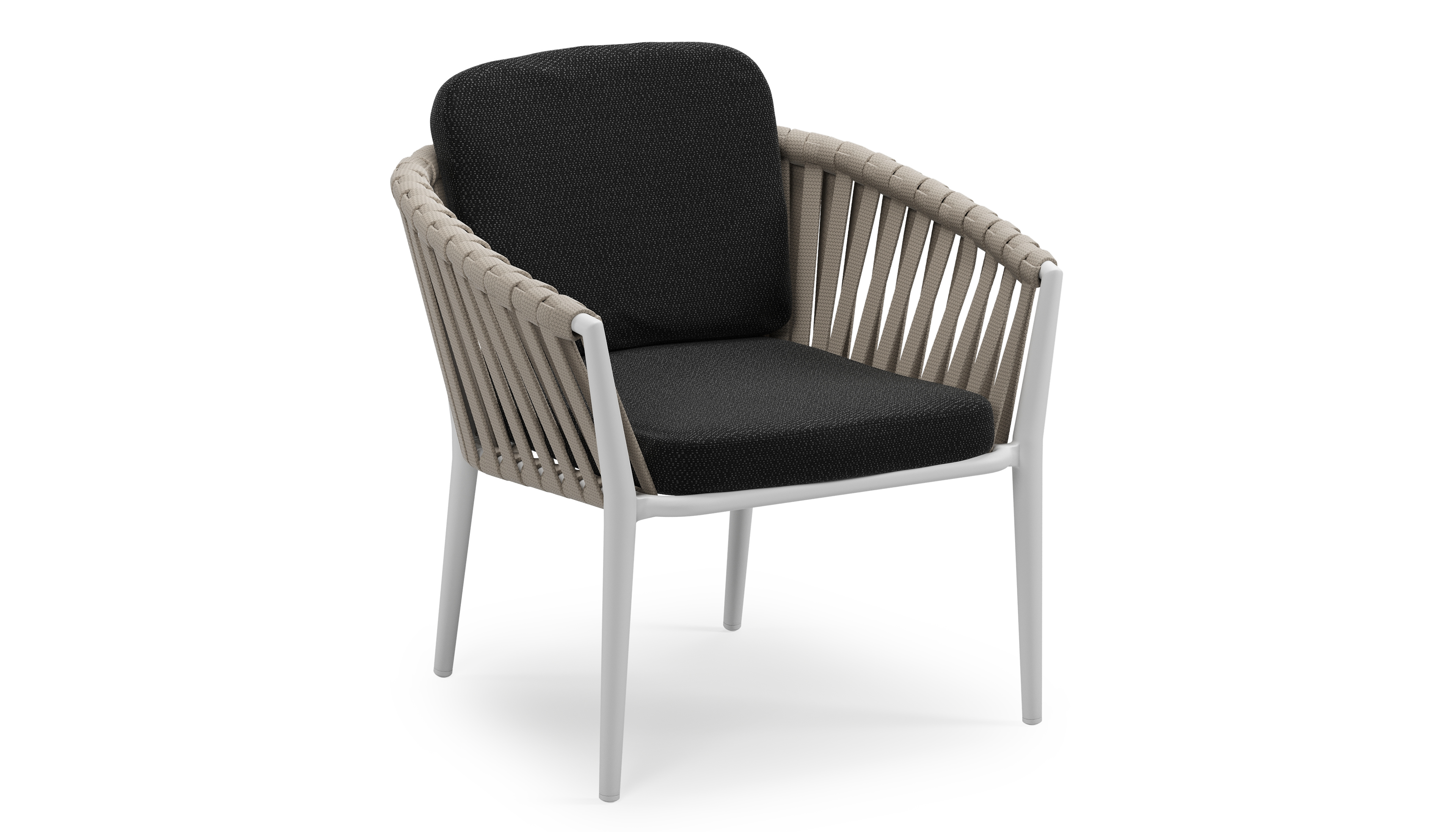 Chaise de jardin low dining Orso en aluminium blanc et corde large plate de luxe tissée verticalement beige avec coussin en All Weather Sunbrella® Luxe Lopi Baribal | Exterioo mobilier de jardin