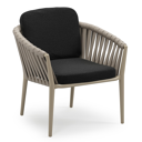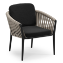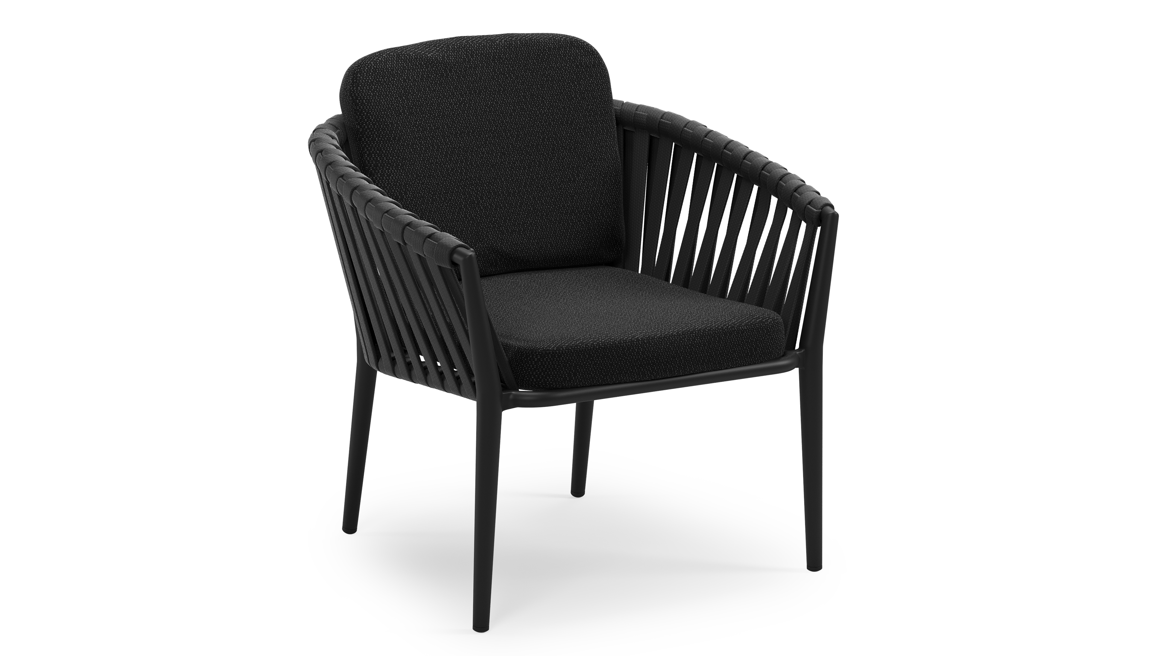 Chaise de jardin low dining Orso en aluminium noir et corde large plate de luxe tissée verticalement noir avec coussin en All Weather Sunbrella® Luxe Lopi Baribal | Exterioo mobilier de jardin