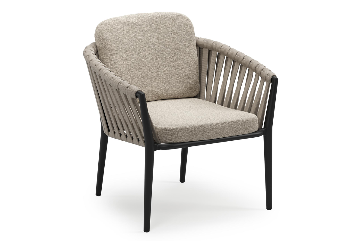 Chaise de jardin low dining Orso en aluminium noir et corde large plate de luxe tissée verticalement beige avec coussin en All Weather Cosytica Catania Sand | Exterioo