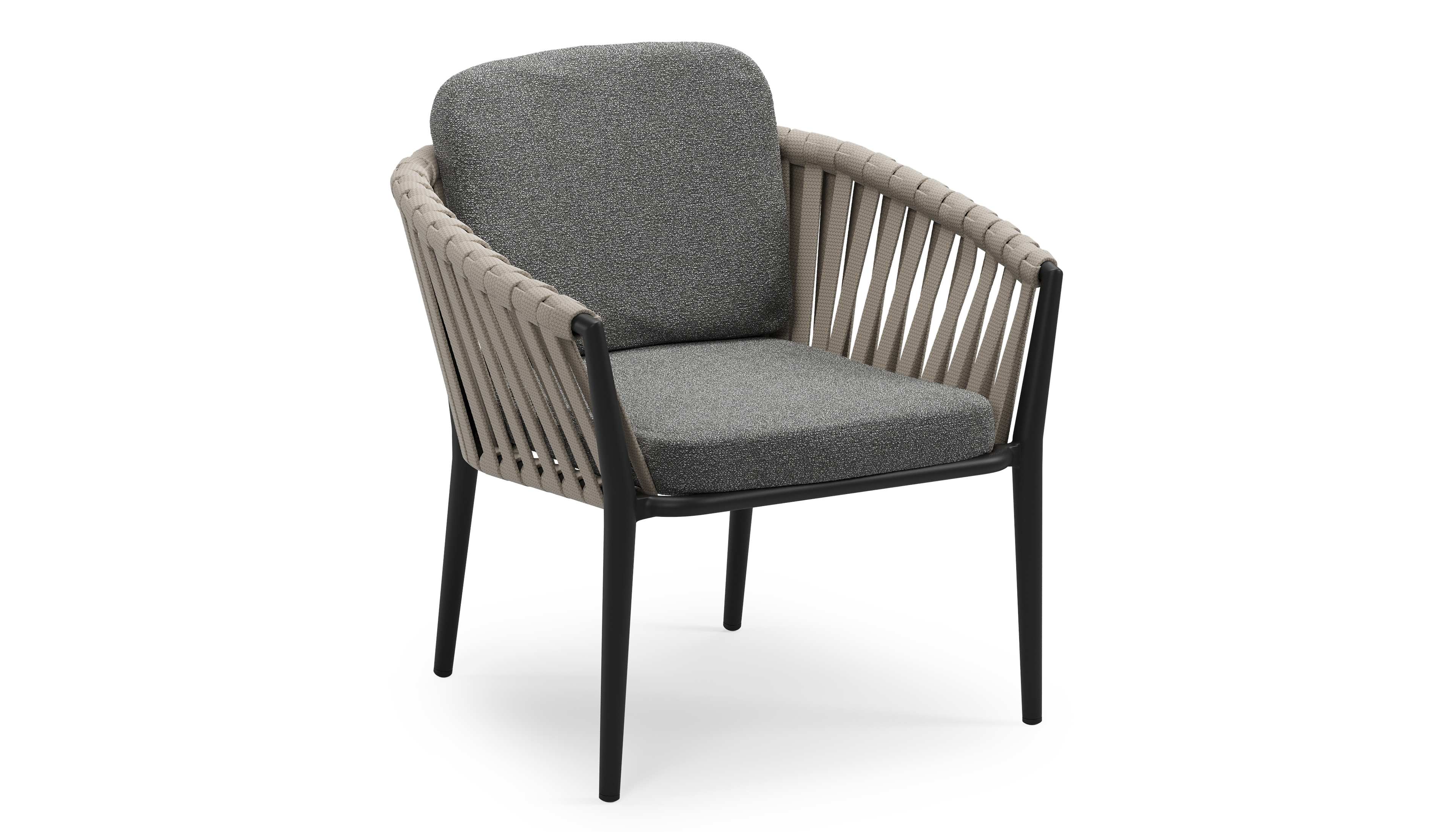 Chaise de jardin low dining Orso en aluminium noir et corde large plate de luxe tissée verticalement beige avec coussin en All Weather Cosytica Catania Black | Exterioo mobilier de jardin