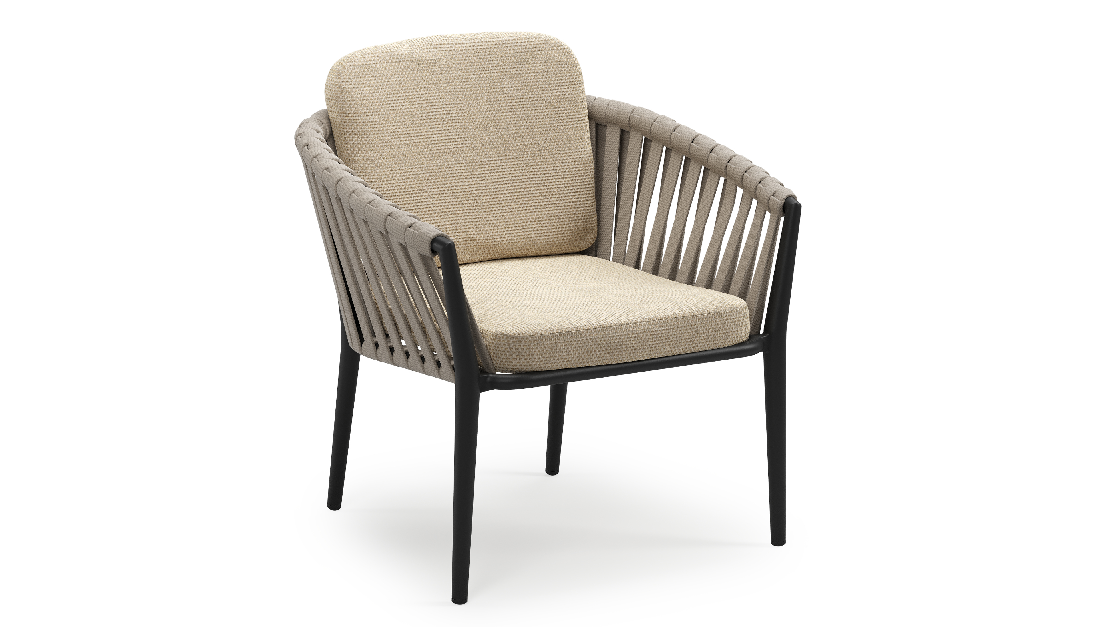 Chaise de jardin low dining Orso en aluminium noir et corde large plate de luxe tissée verticalement beige avec coussin en All Weather Cosytica Althea Camel | Exterioo mobilier de jardin