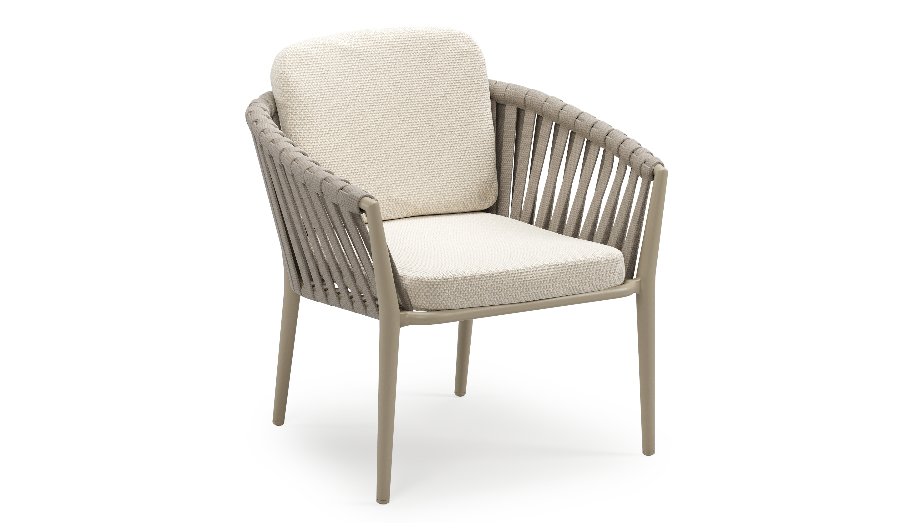 Chaise de jardin low dining Orso en aluminium beige et corde large plate de luxe tissée verticalement beige avec coussin en All Weather Cosytica Althea Off White | Exterioo mobilier de jardin