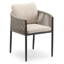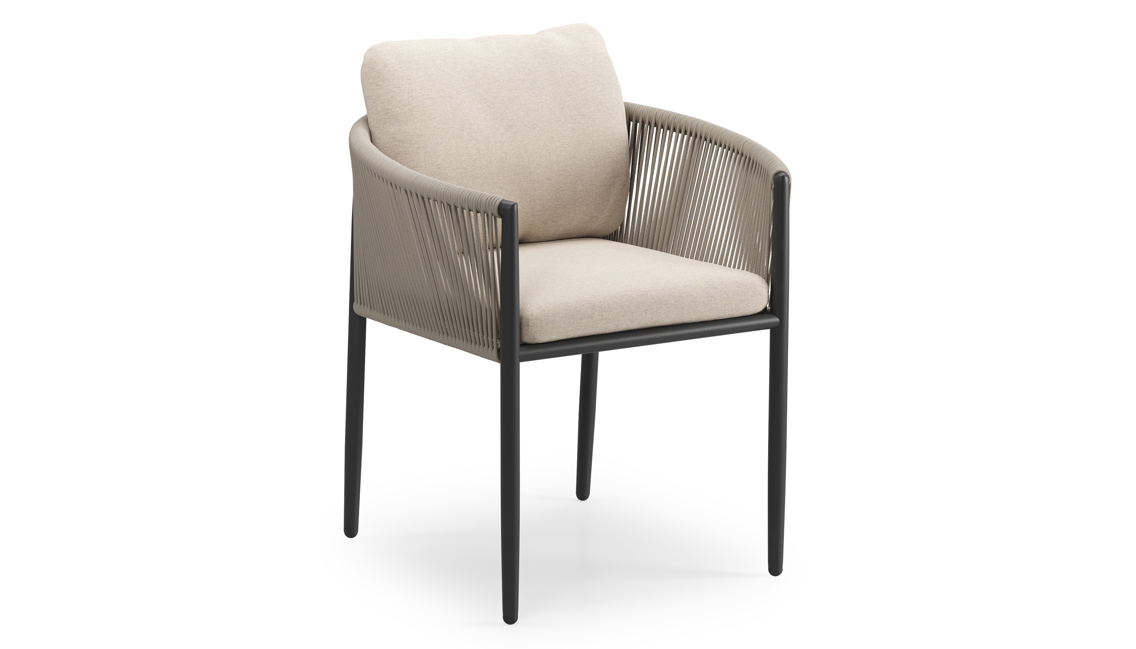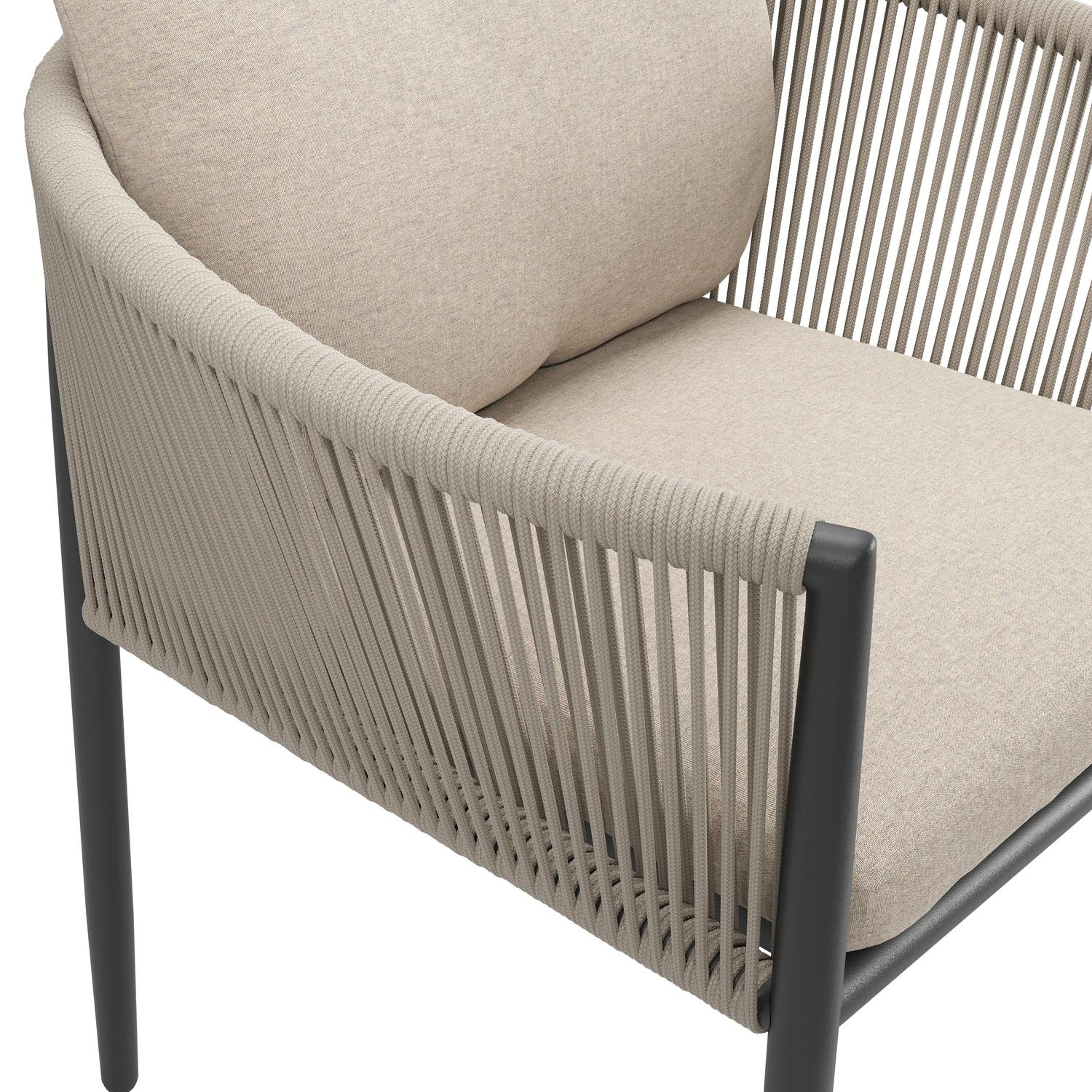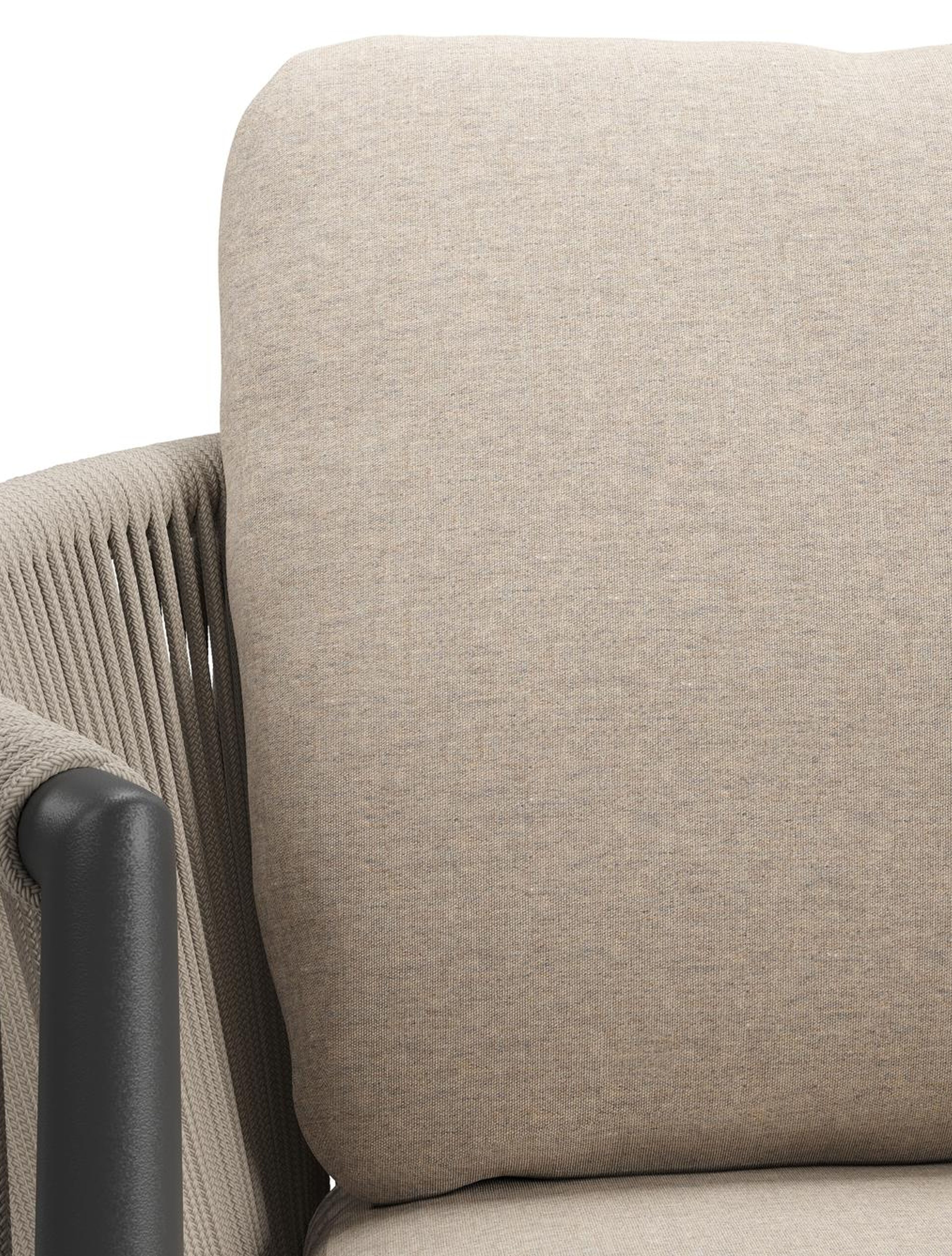 Chaise de jardin Organo en aluminium noir et corde ronde tissée verticalement noir avec coussin en All Weather Sunbrella® Luxe Heritage Ash | Exterioo mobilier de jardin