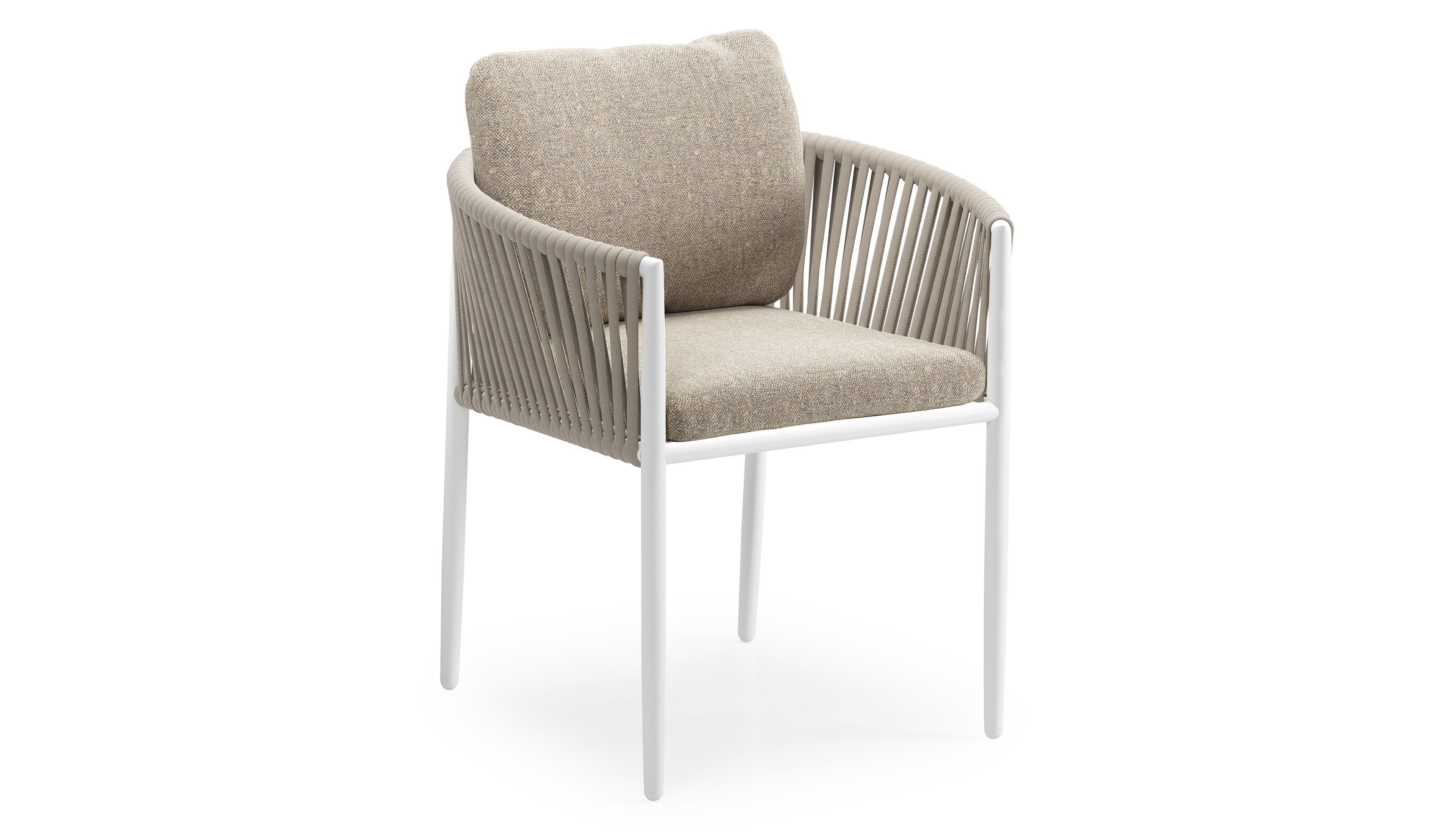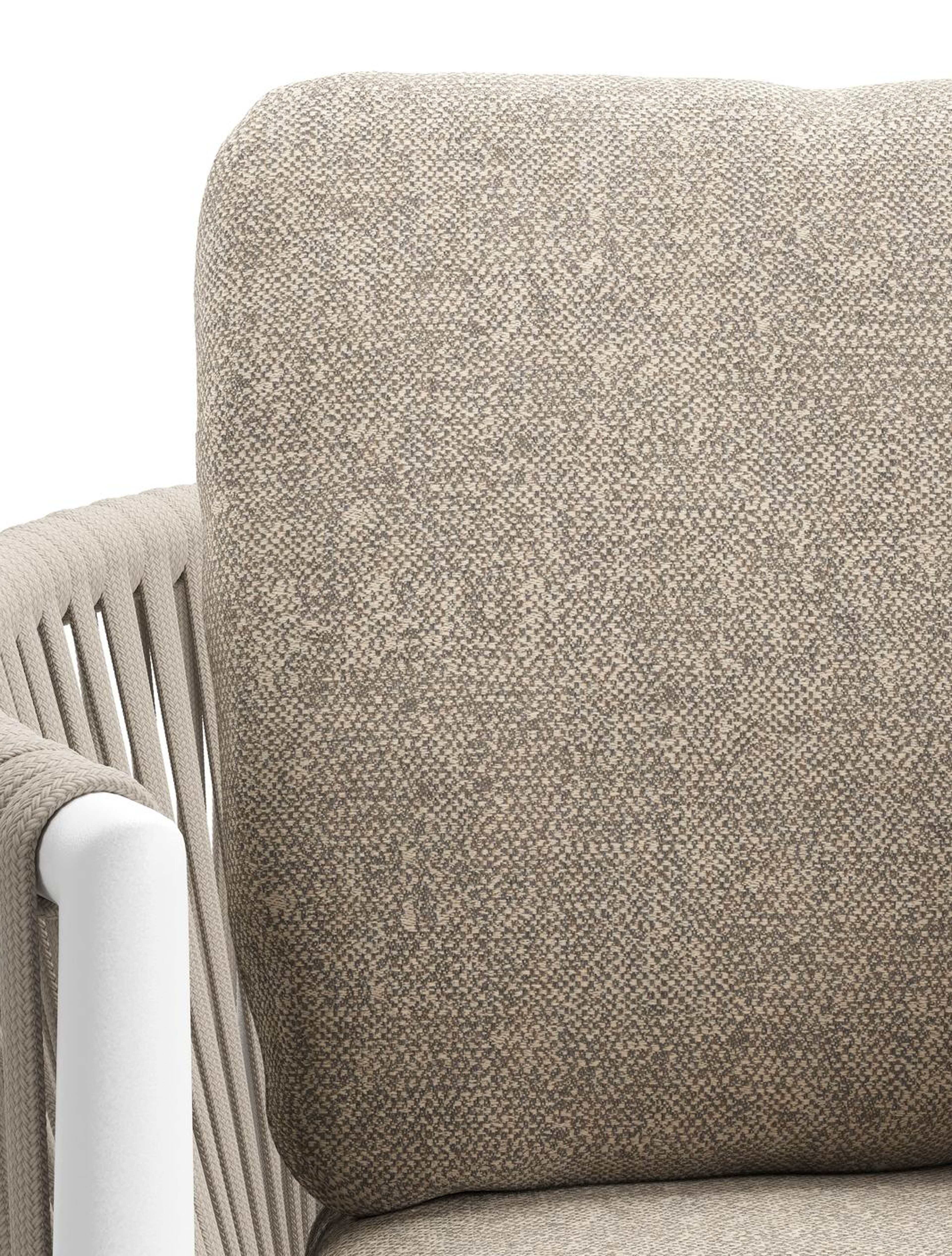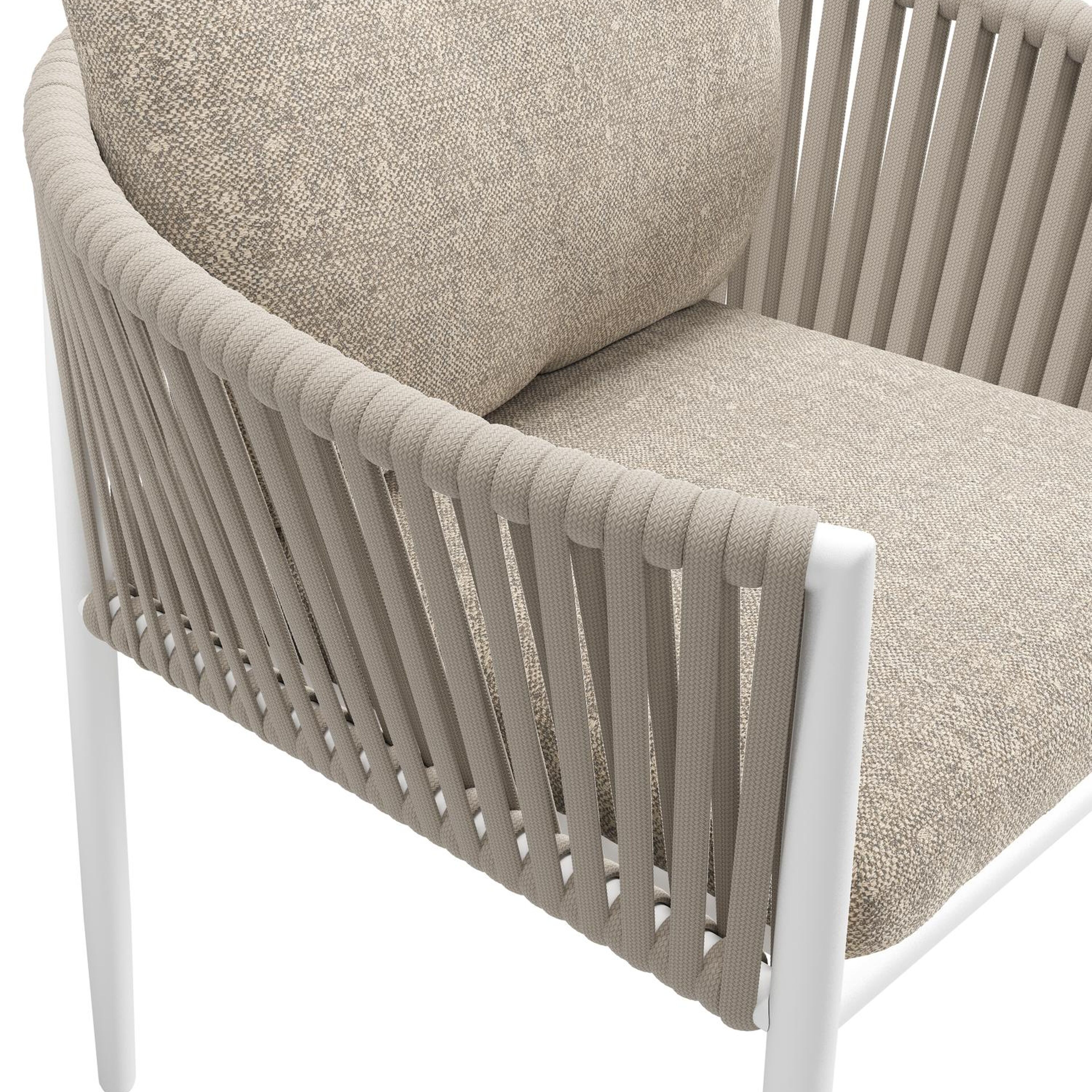Chaise de jardin Organo en aluminium blanc et corde luxe plate tissée verticalement beige avec coussin en All Weather Sunbrella® Luxe Chartres Pewter | Exterioo mobilier de jardin
