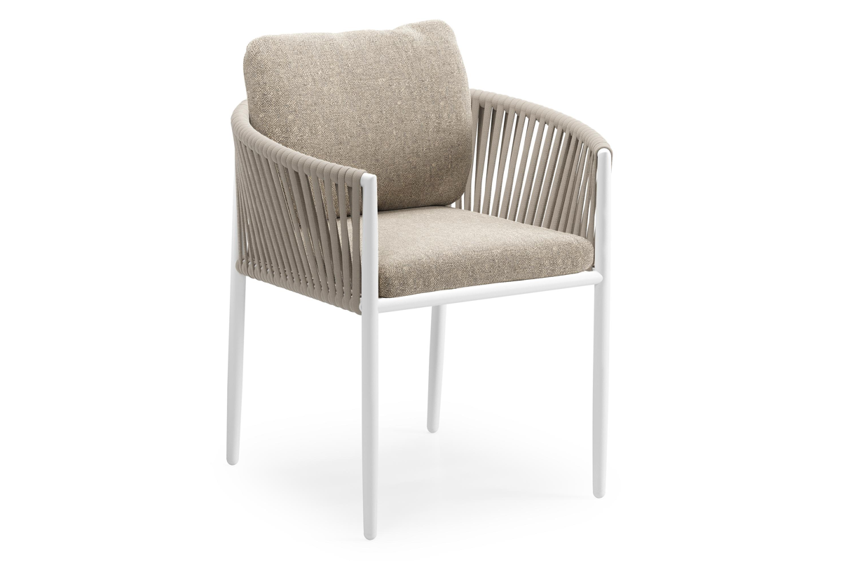 Chaise de jardin Organo en aluminium blanc et corde luxe plate tissée verticalement beige avec coussin en All Weather Sunbrella® Luxe Chartres Pewter | Exterioo