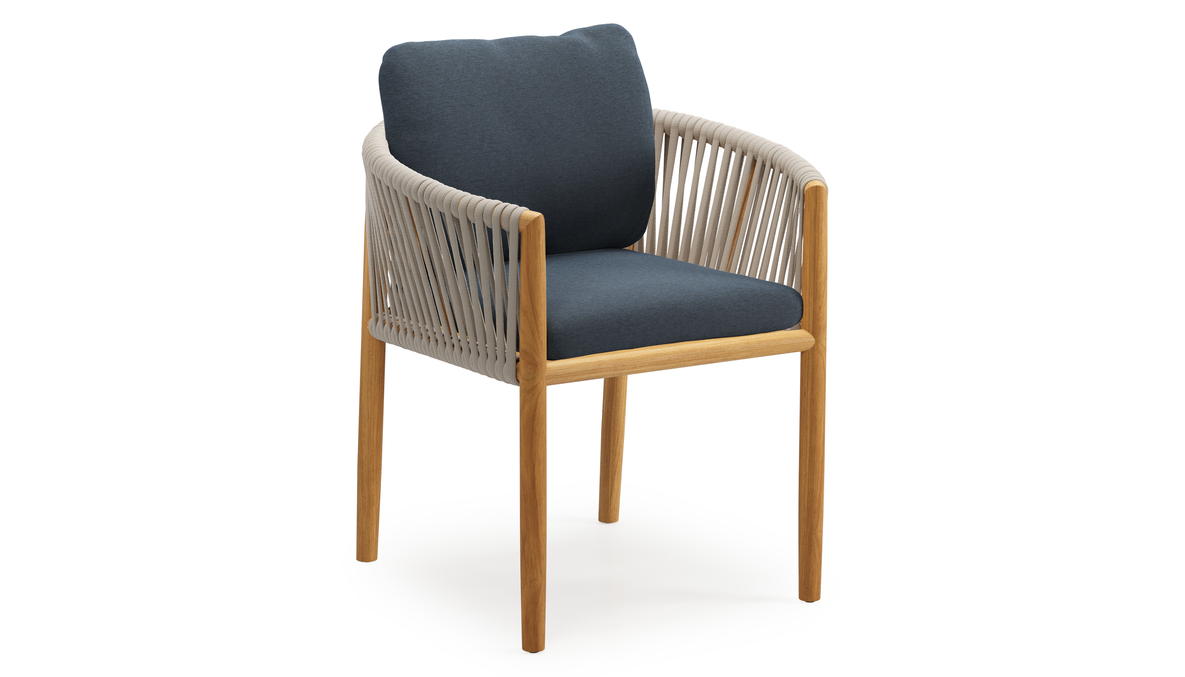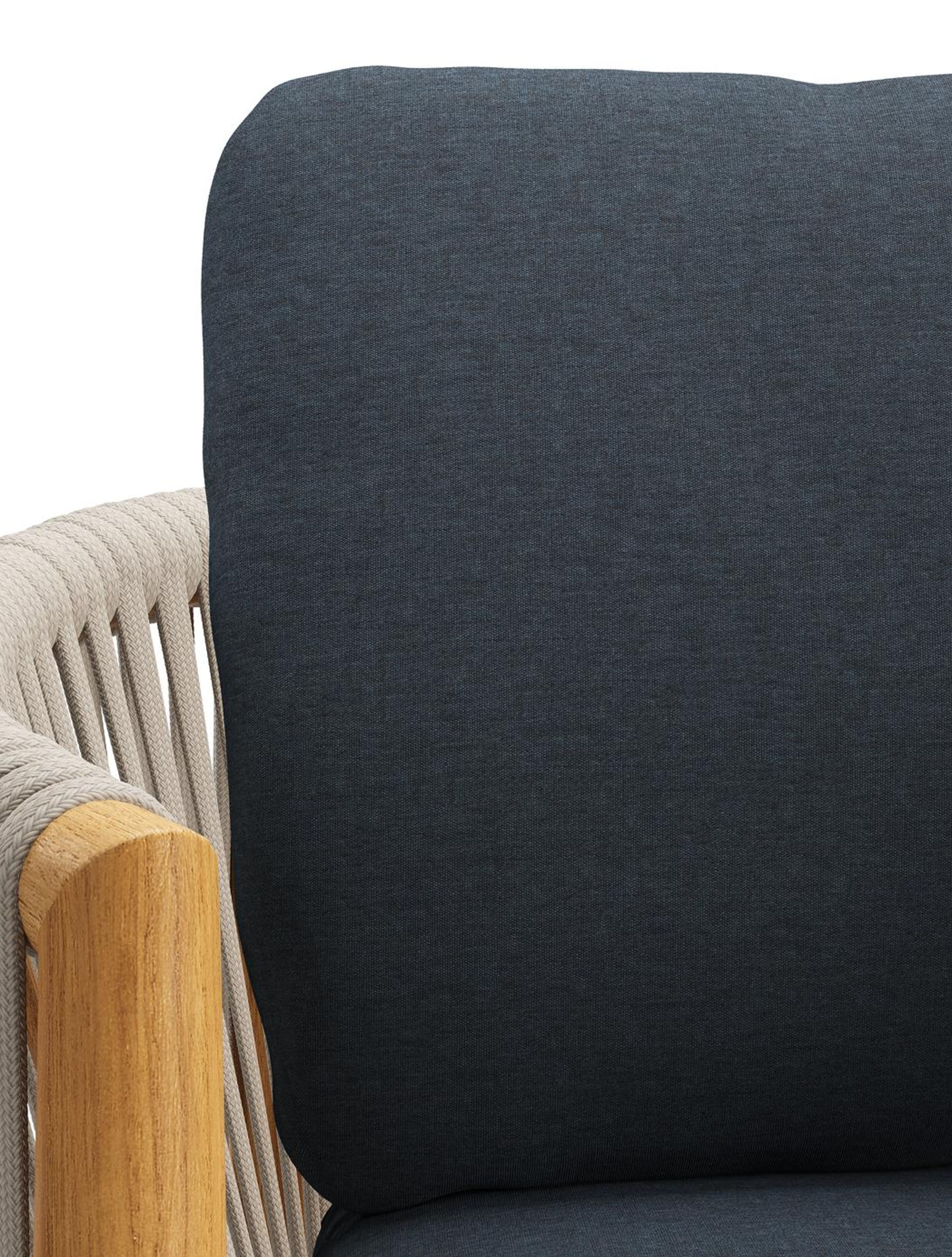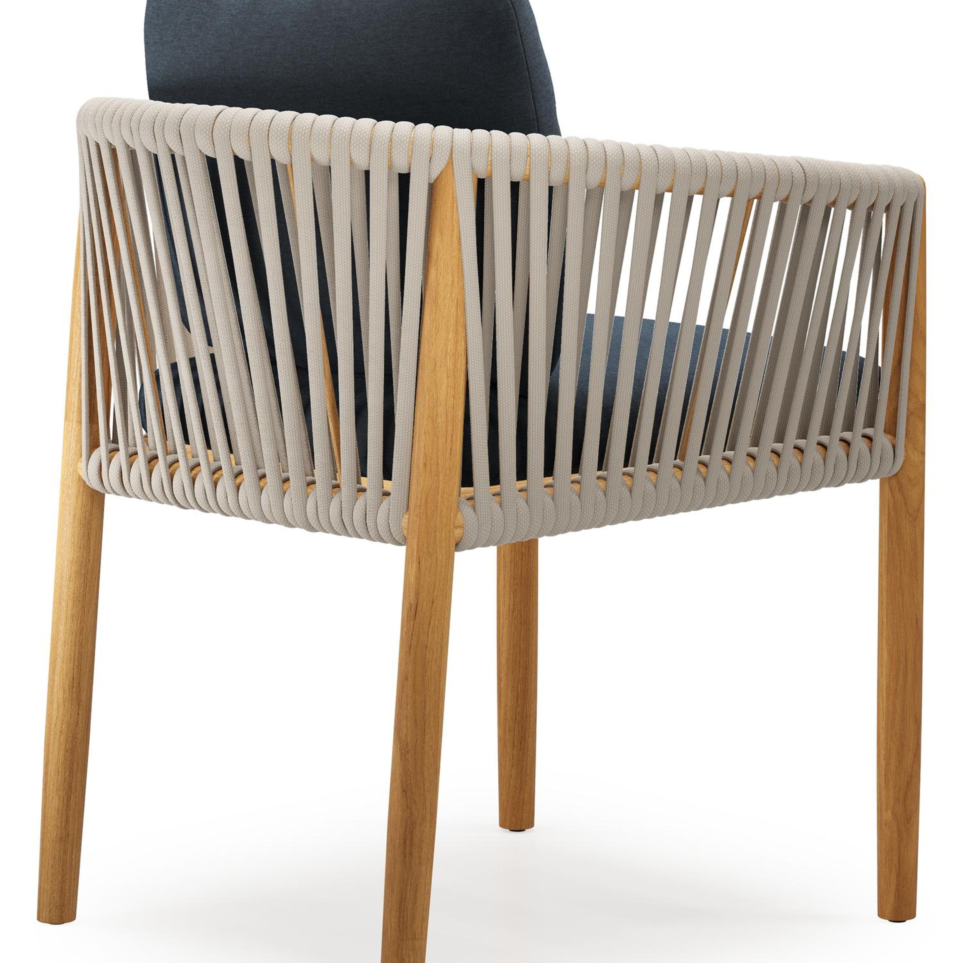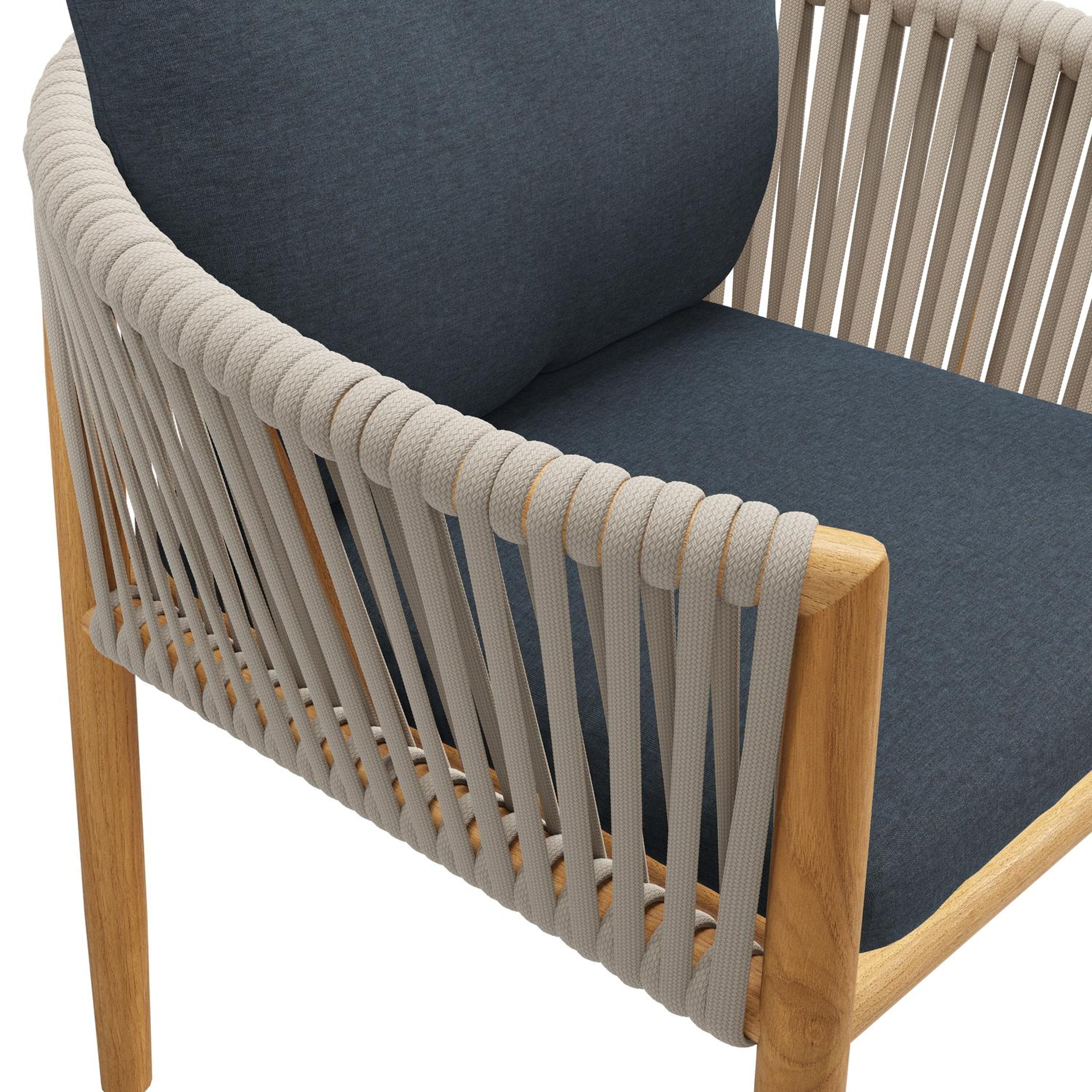 Chaise de jardin Organo en teck naturel et corde luxe plate tissée verticalement beige avec coussin en All Weather Sunbrella® Luxe Heritage Indigo | Exterioo mobilier de jardin