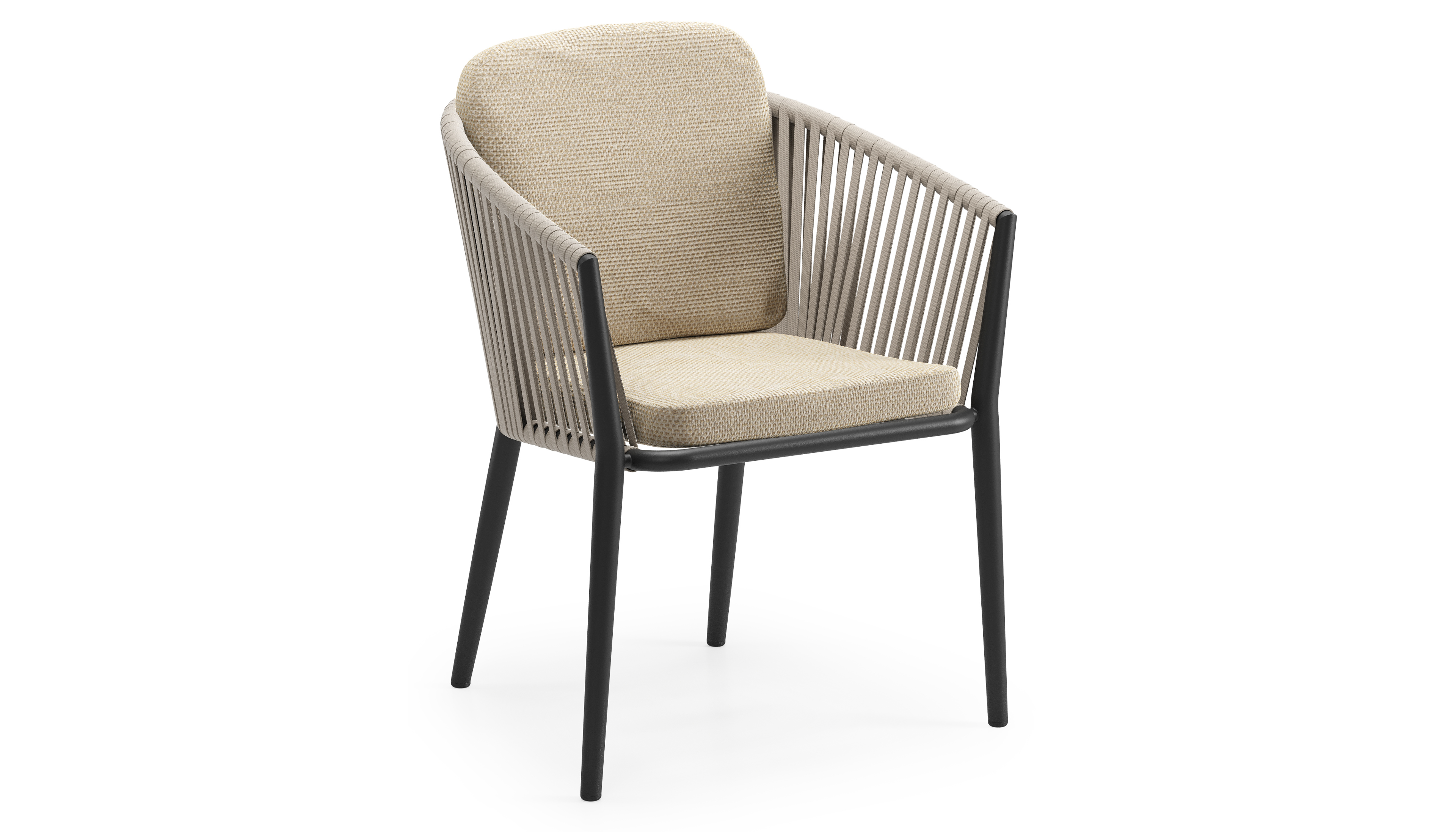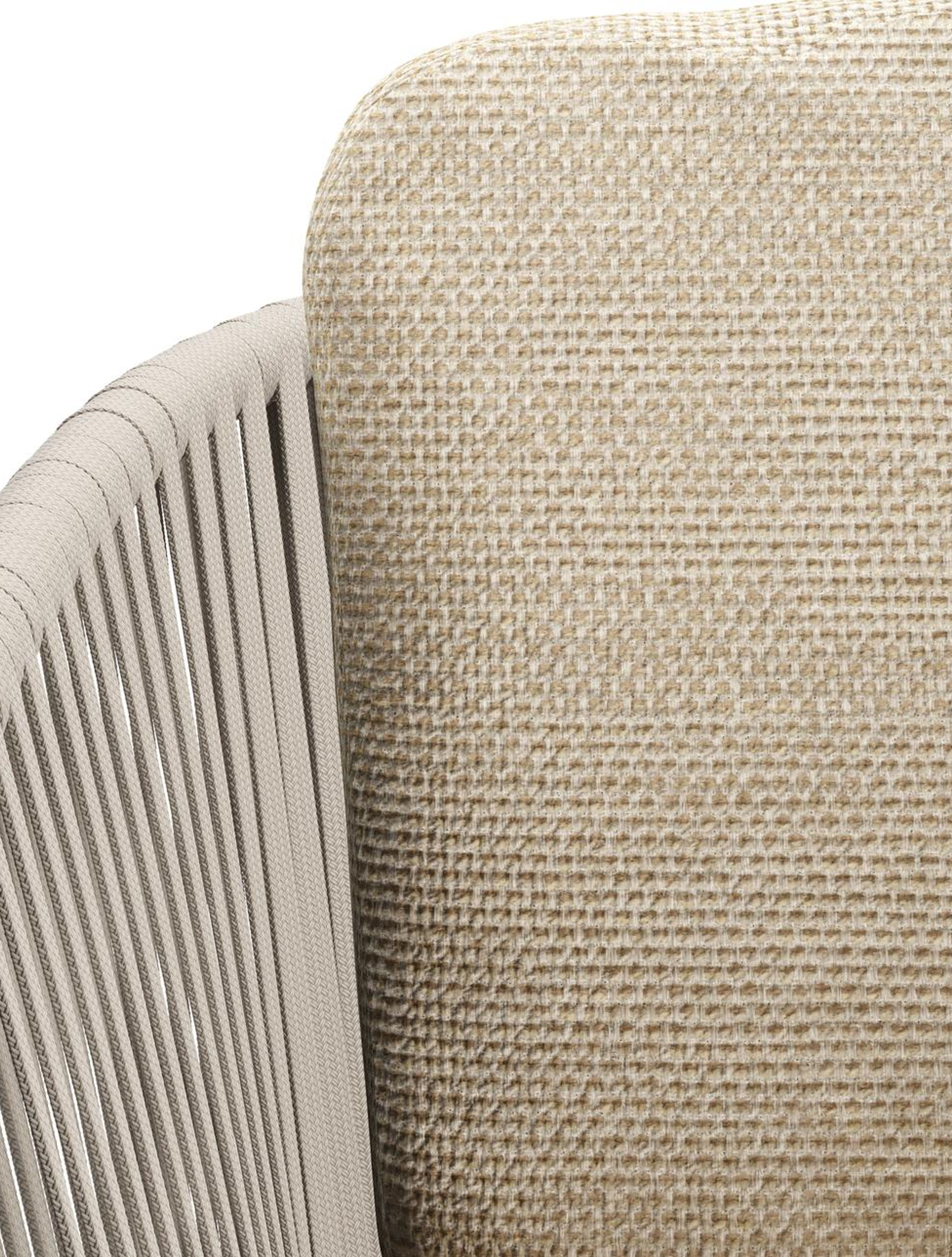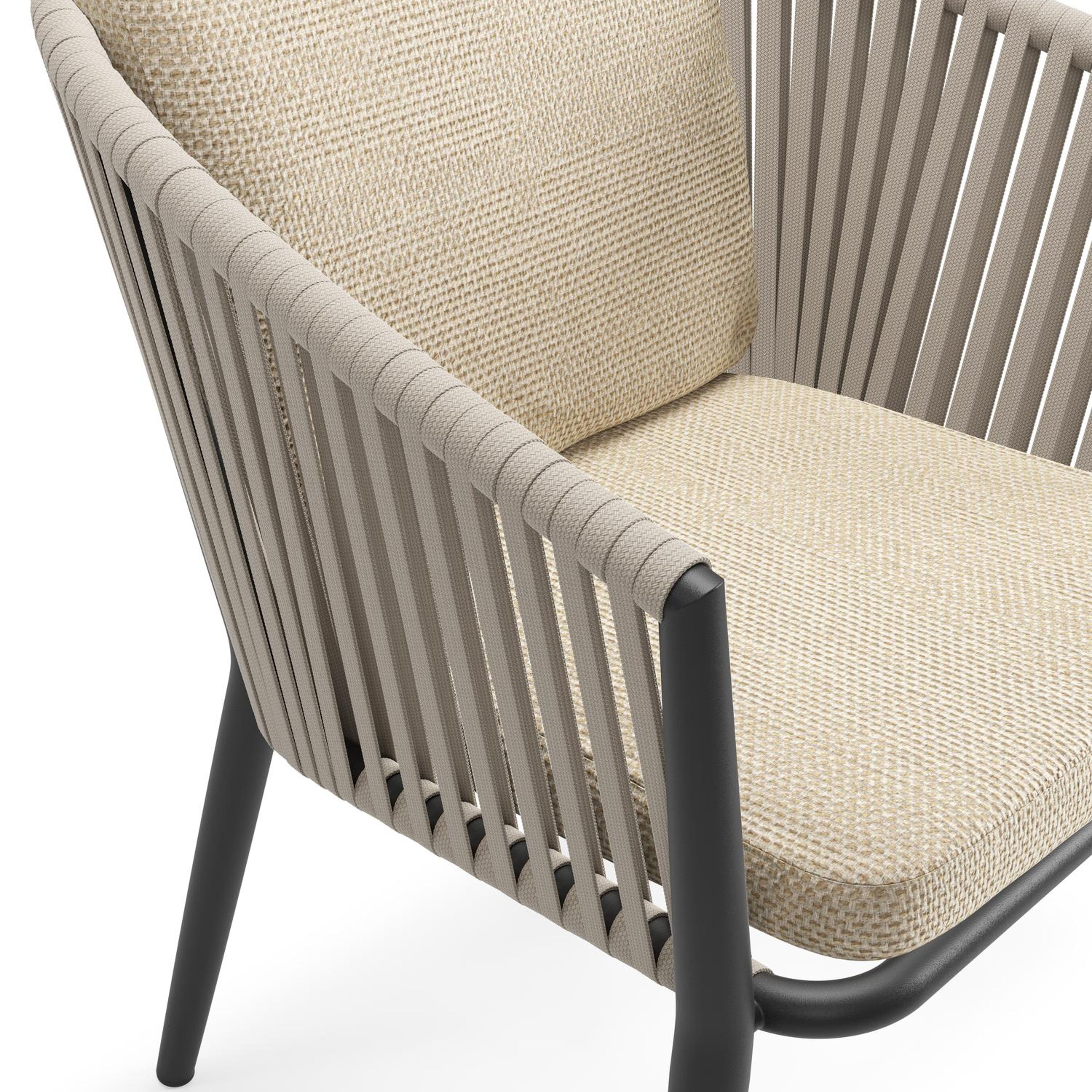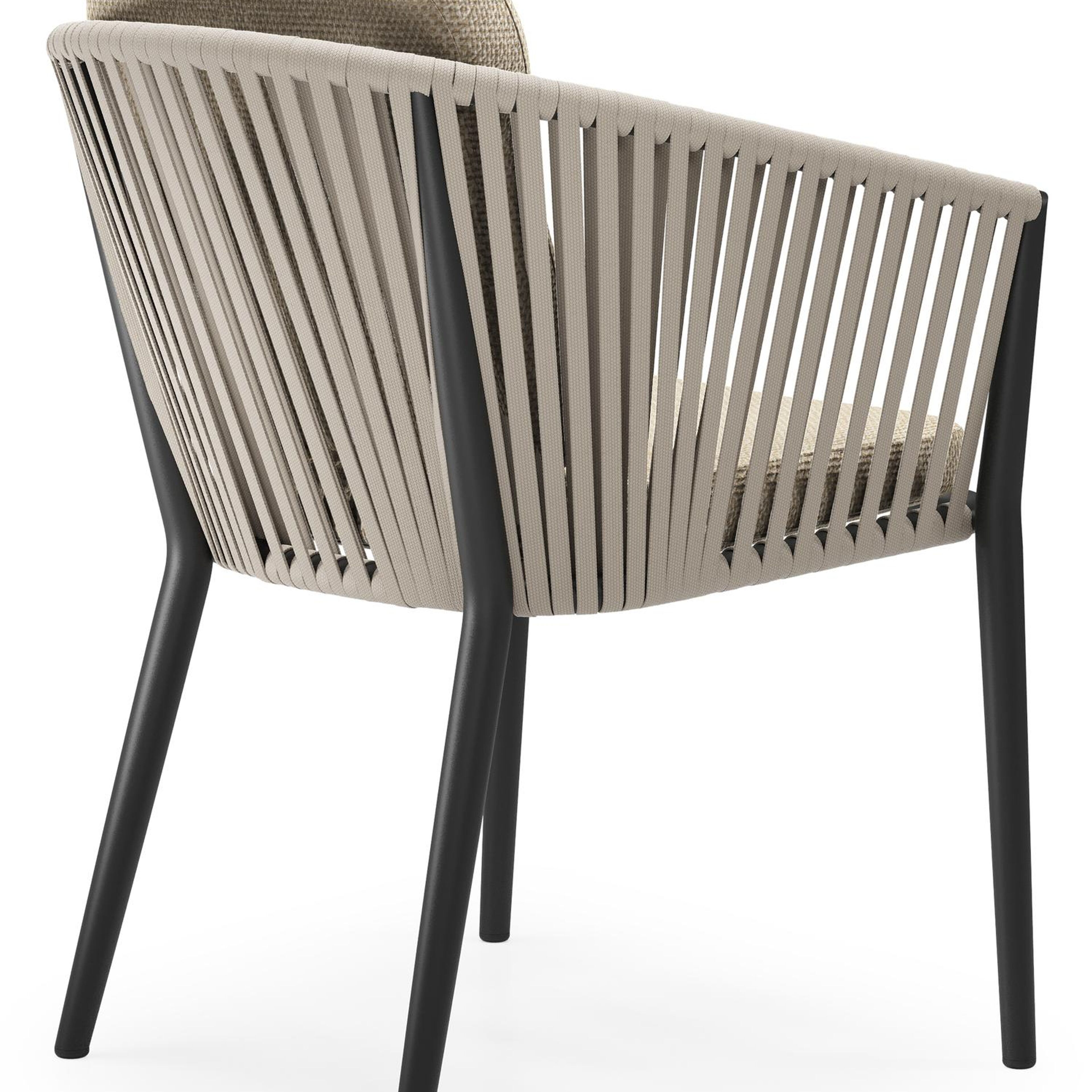 Chaise de jardin Orso en aluminium noir et corde plate tissée verticalement beige avec coussin luxe en All Weather Cosytica Althea Camel | Exterioo mobilier de jardin