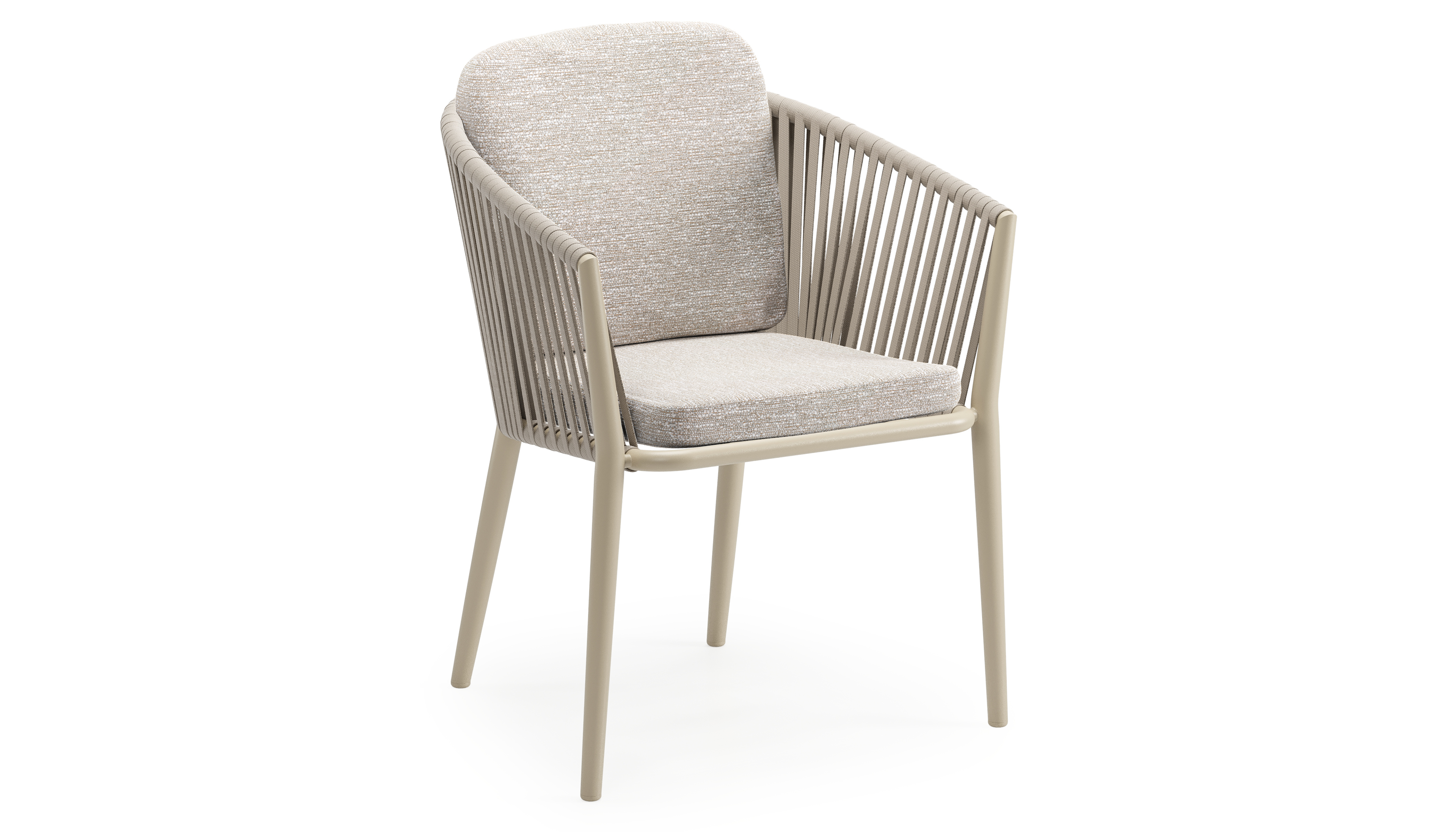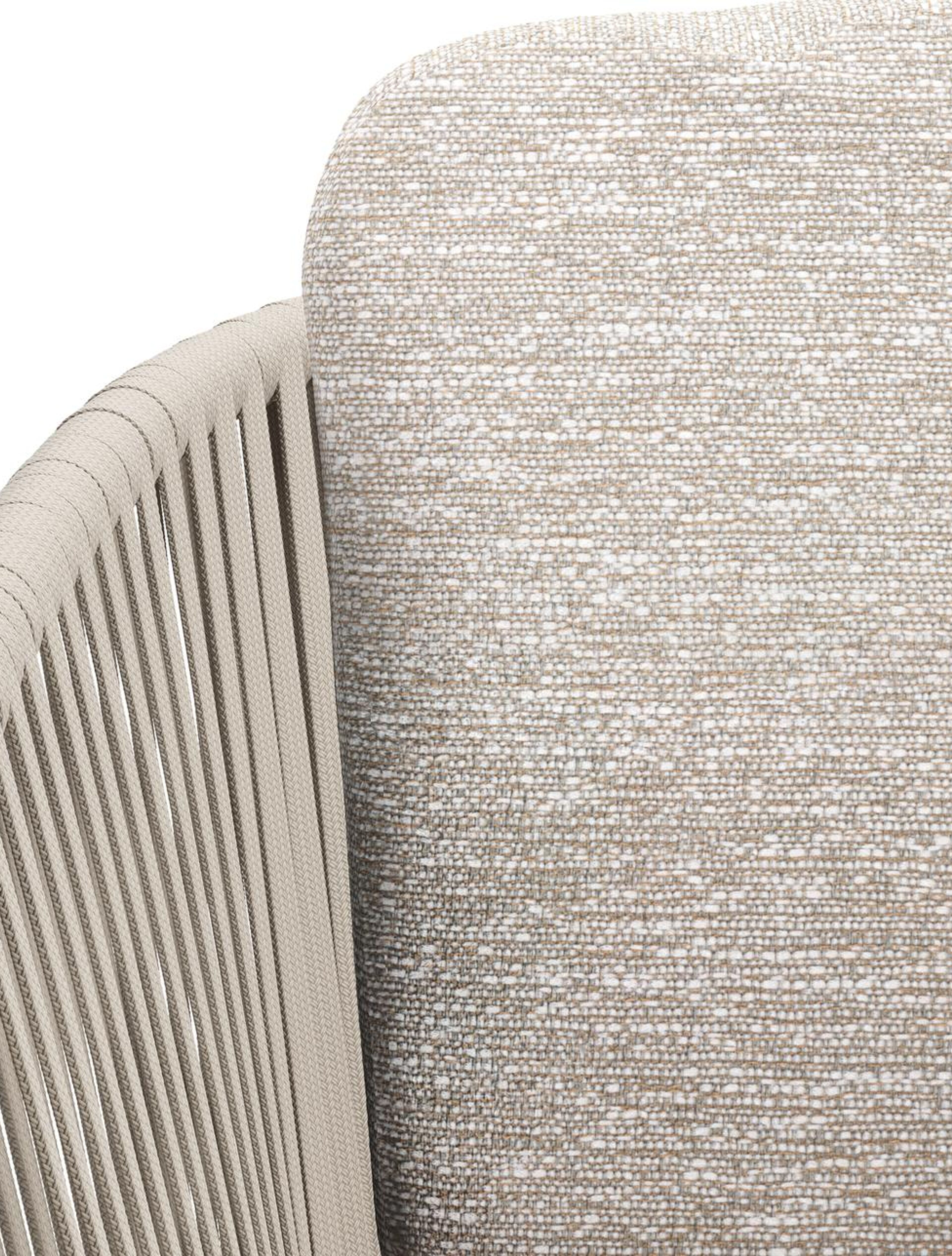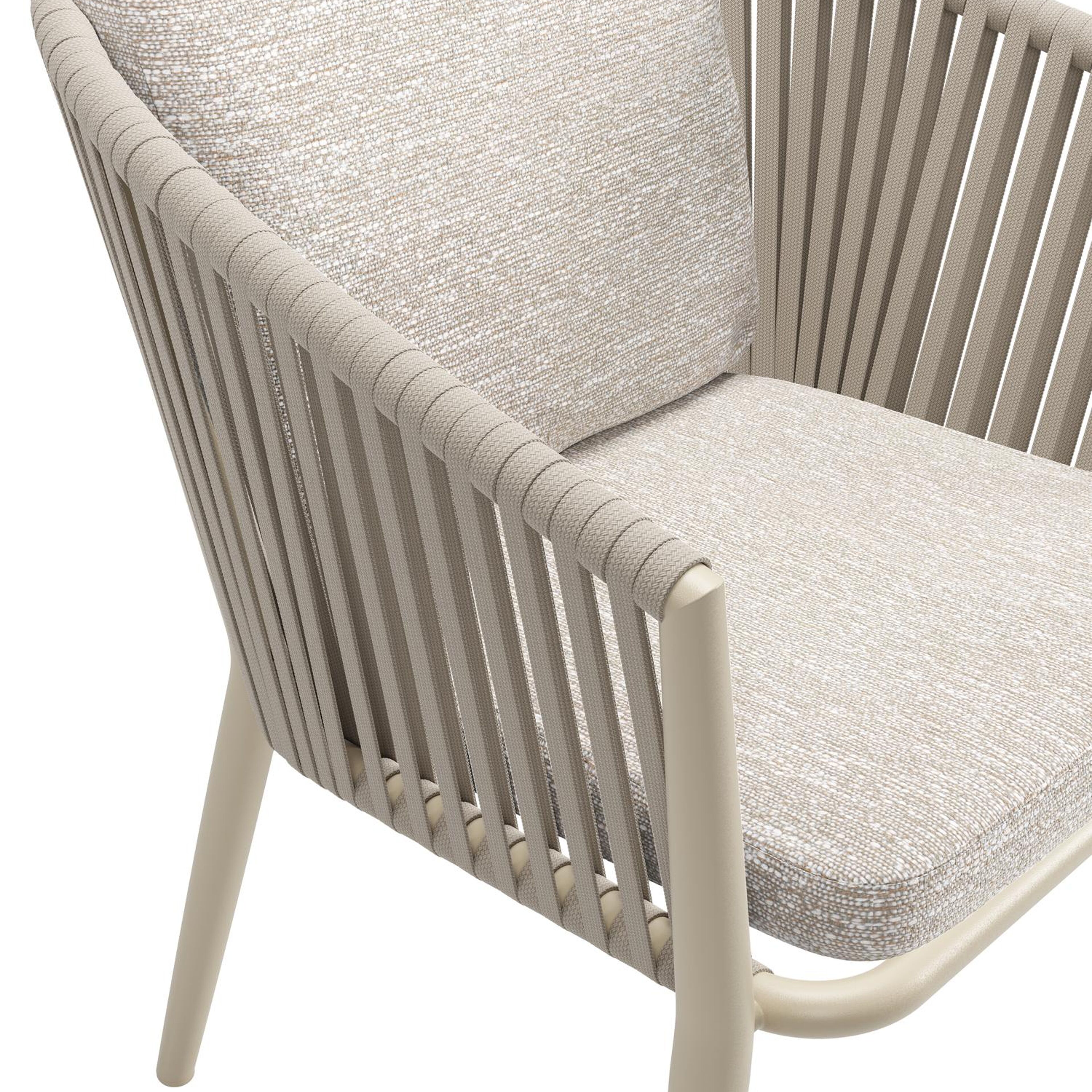Chaise de jardin Orso en aluminium beige et corde plate tissée verticalement beige avec coussin luxe en All Weather Sunbrella® Luxe Tundra Sand | Exterioo mobilier de jardin