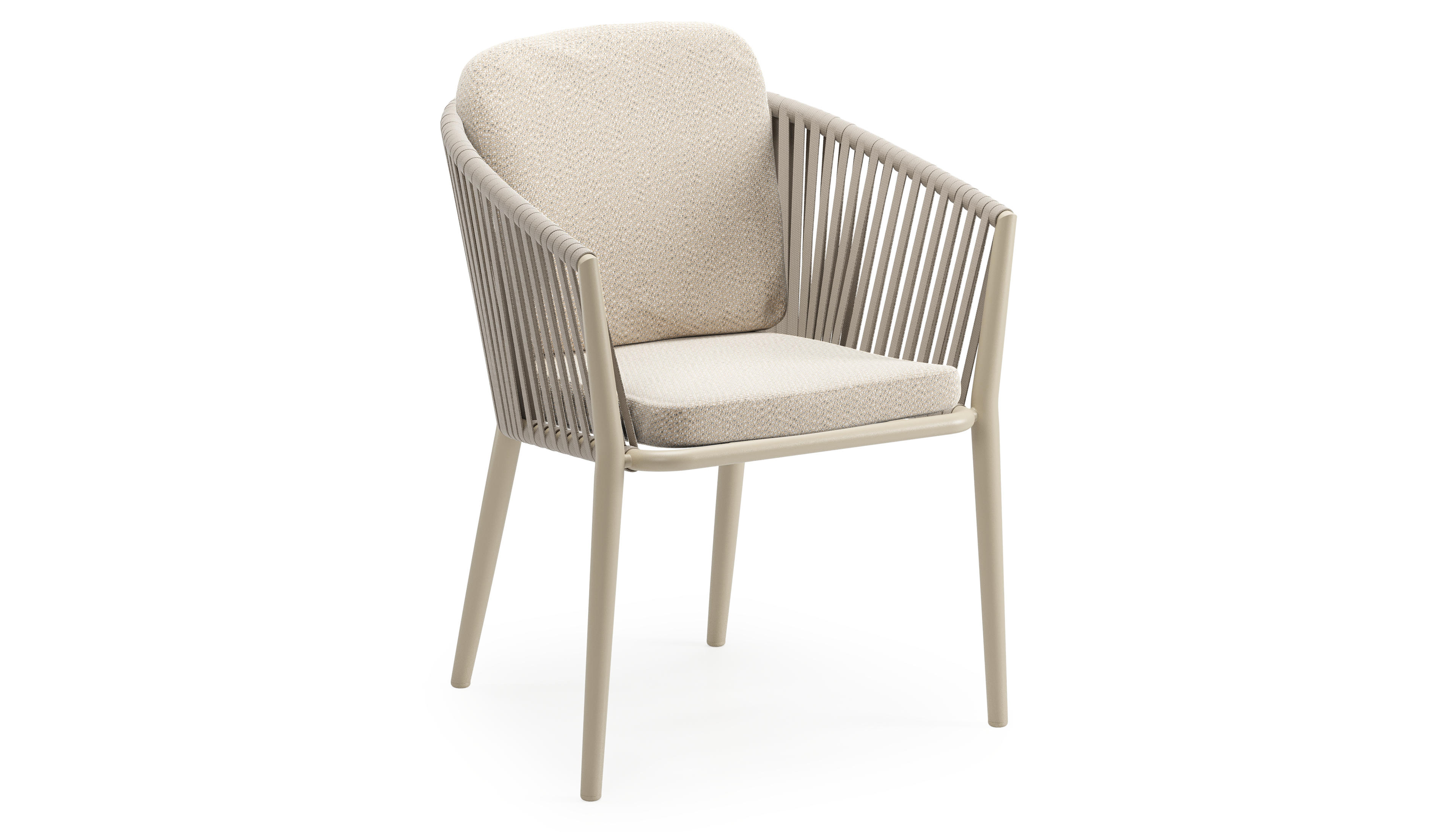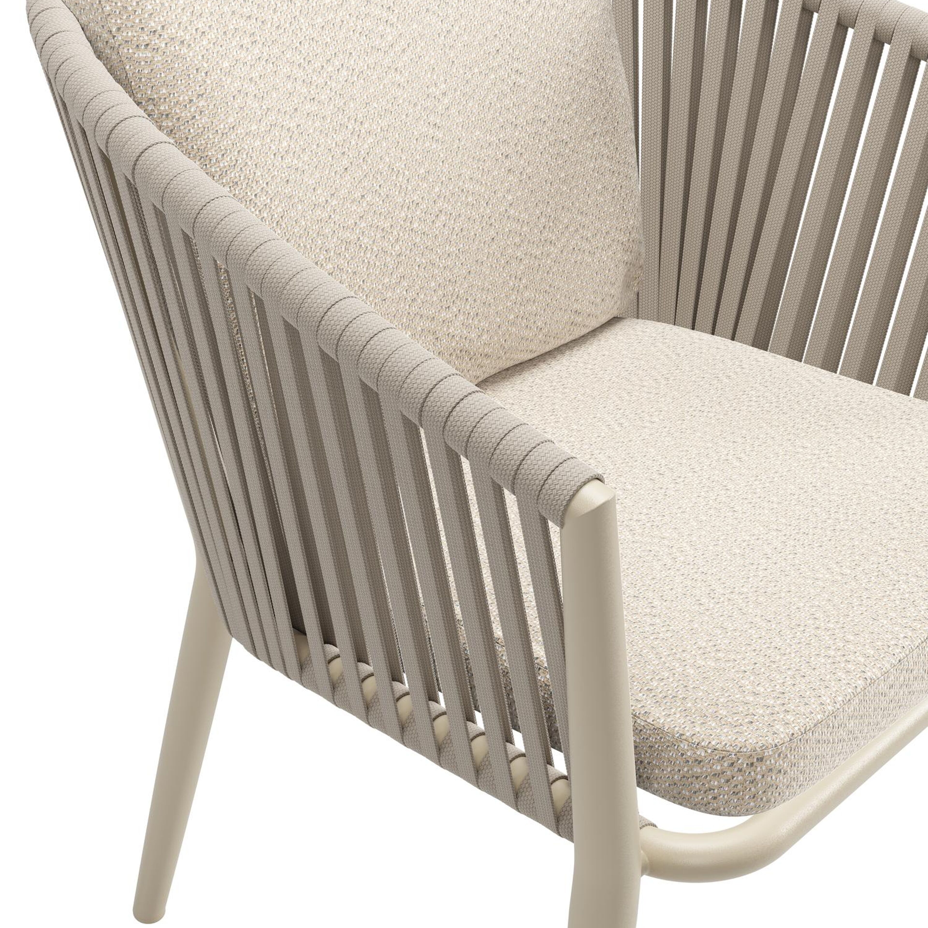 Chaise de jardin Orso en aluminium beige et corde plate tissée verticalement beige avec coussin luxe en All Weather Sunbrella® Luxe Lopi Sand | Exterioo mobilier de jardin