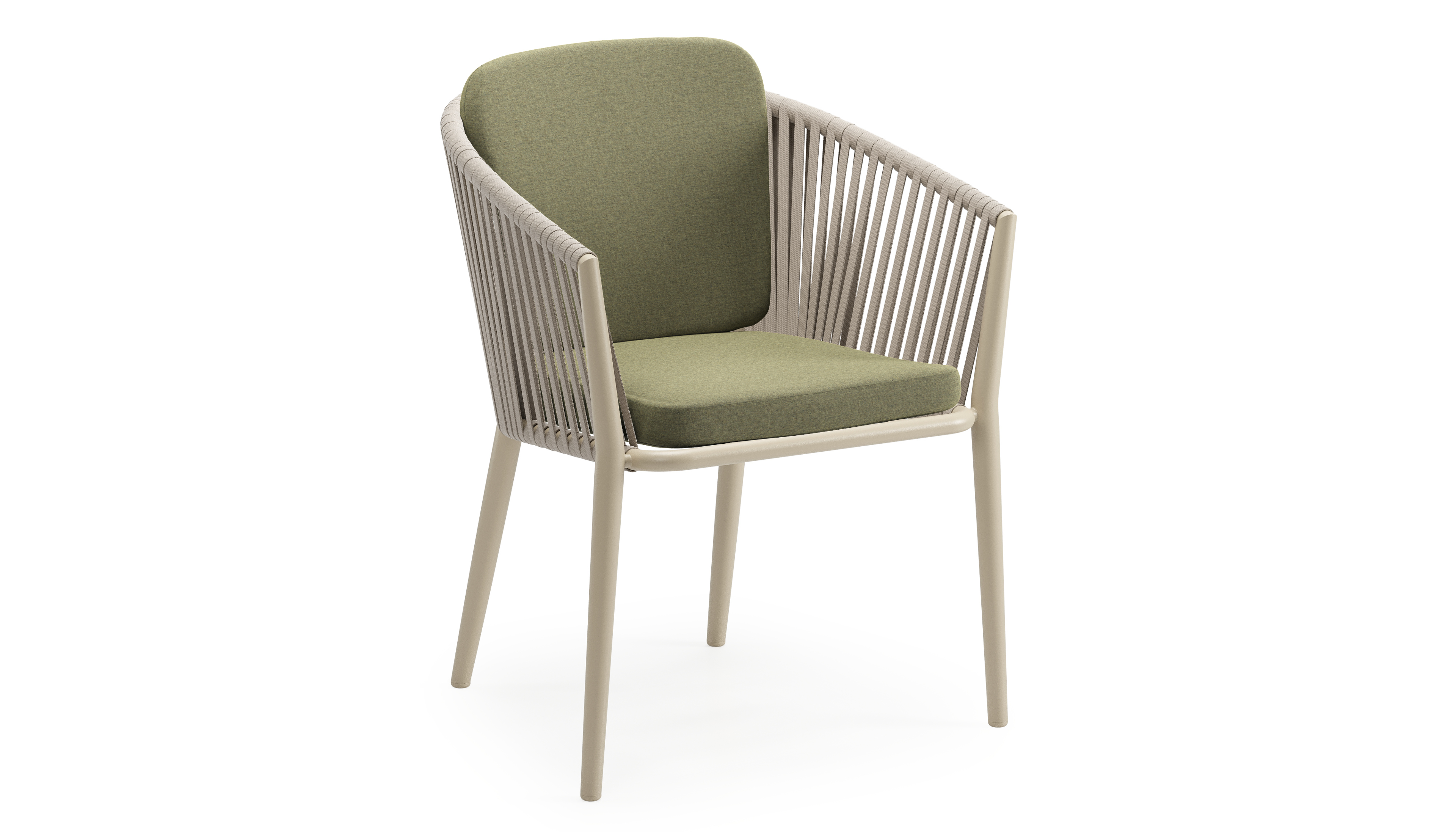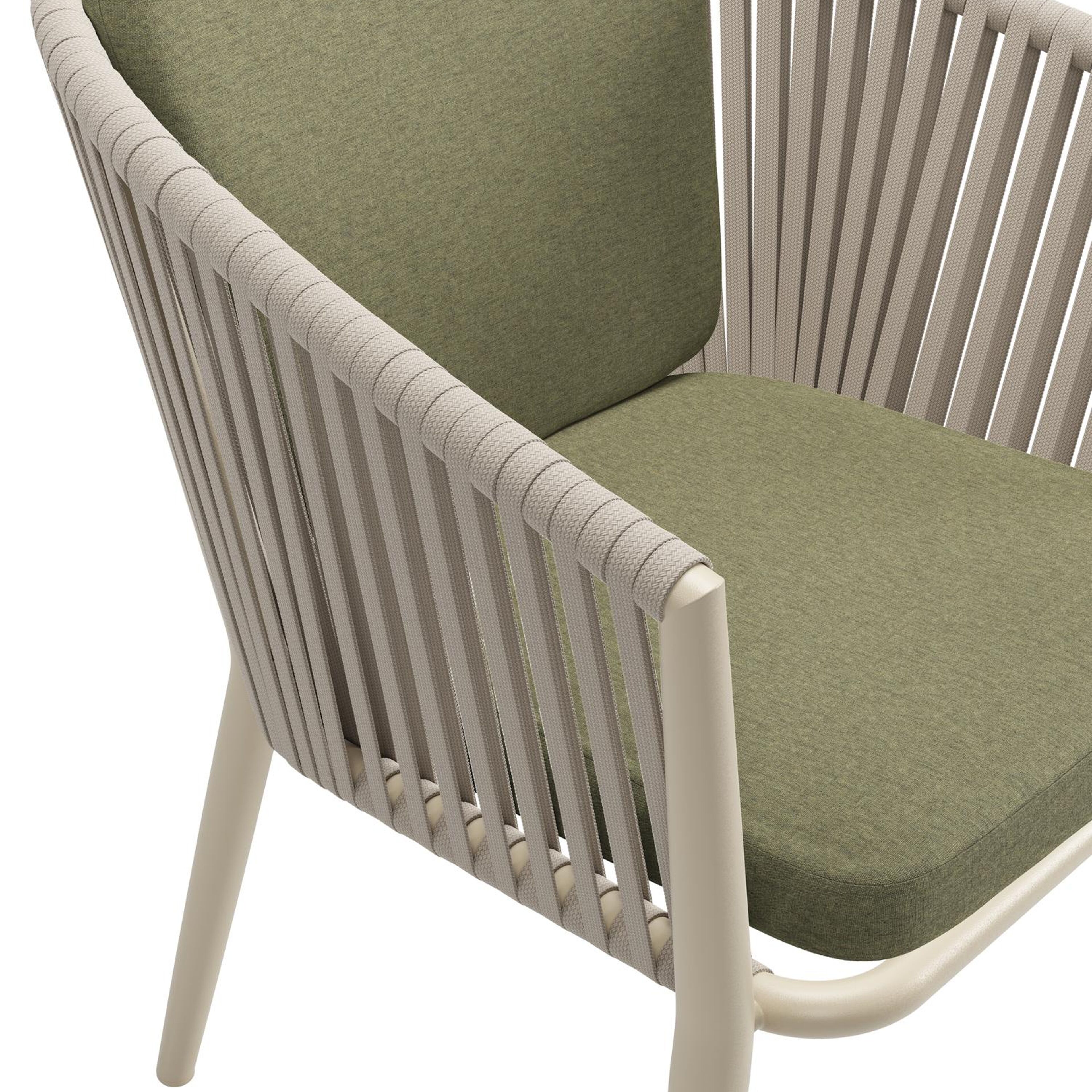 Chaise de jardin Orso en aluminium beige et corde plate tissée verticalement beige avec coussin en All Weather Sunbrella® Luxe Heritage Leaf | Exterioo mobilier de jardin