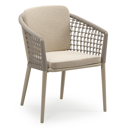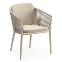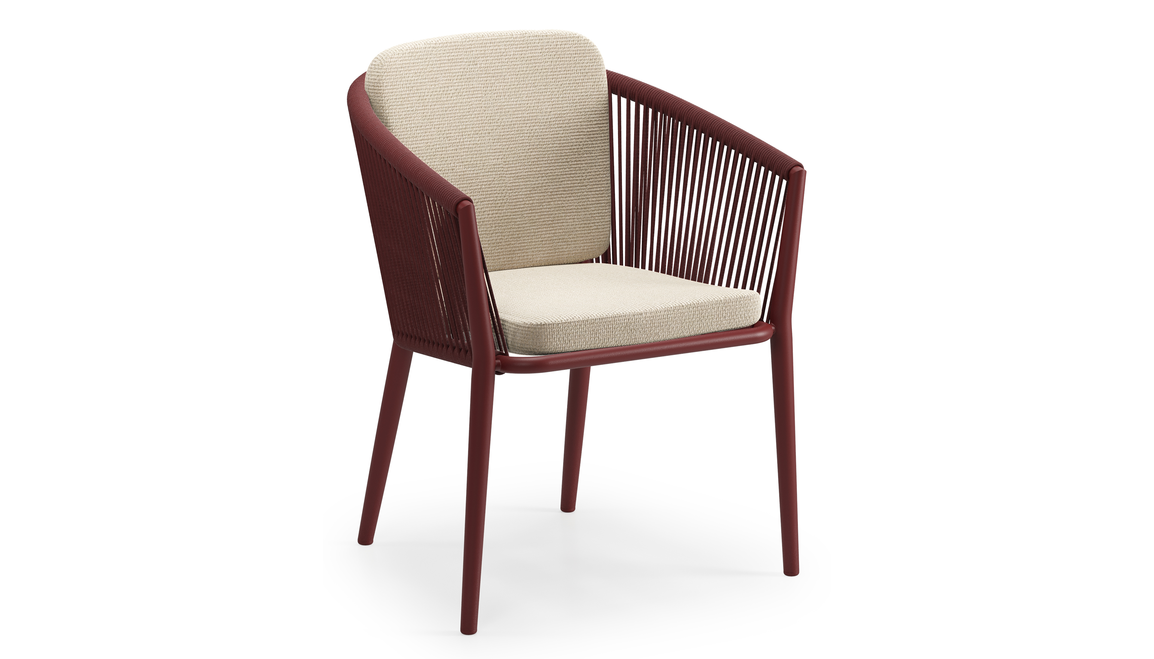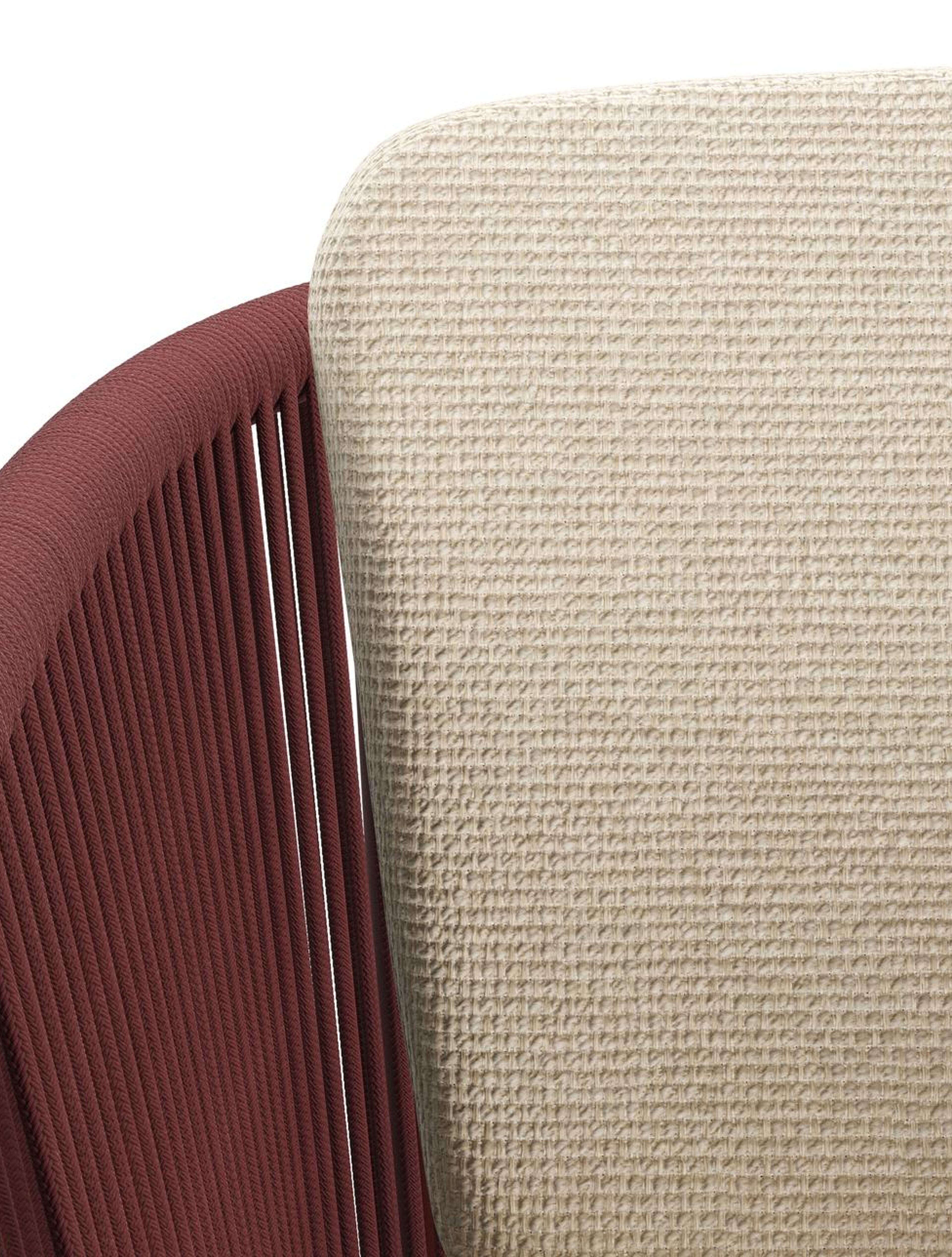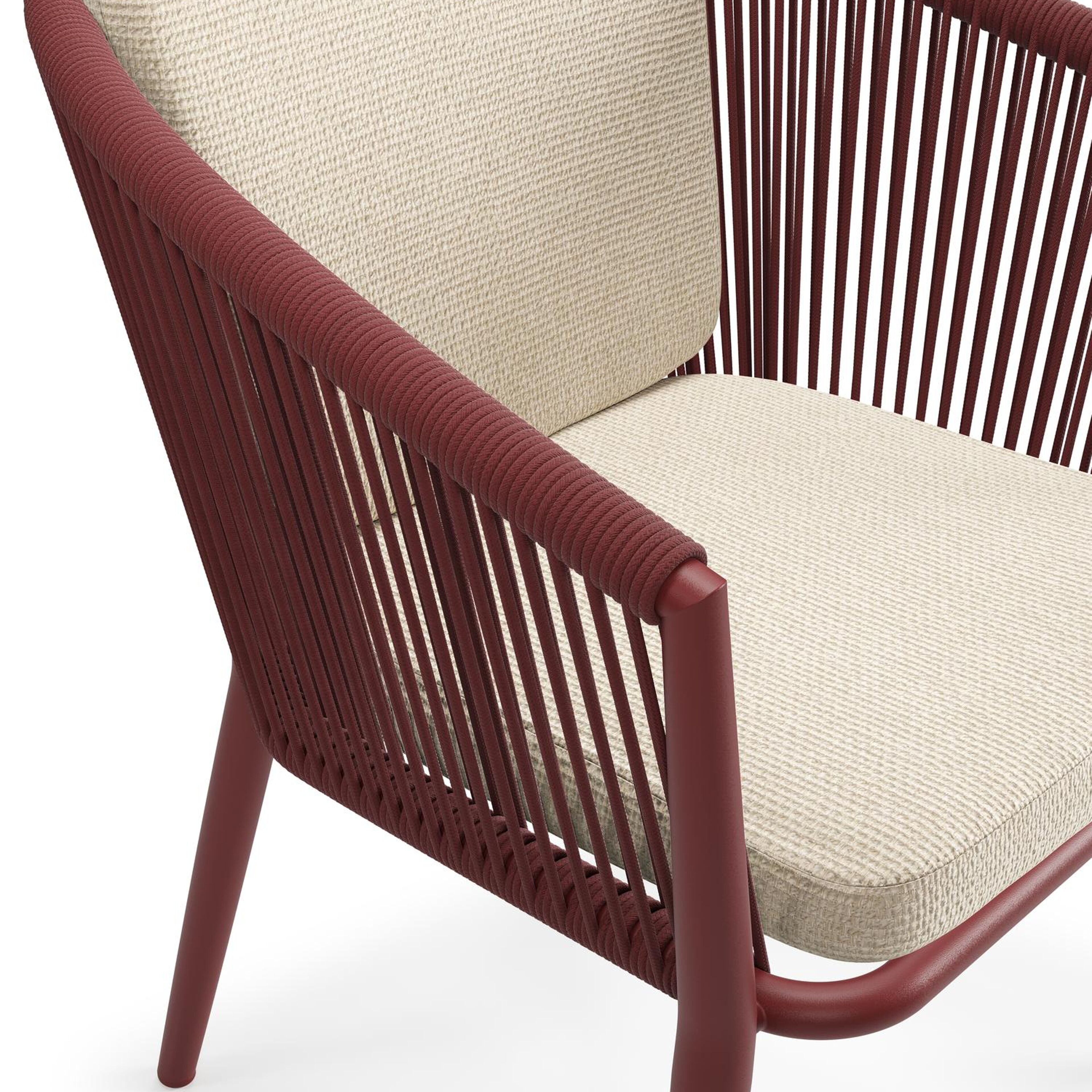 Chaise de jardin Orso en aluminium ruby et corde ronde tissée verticalement ruby avec coussin en All Weather Cosytica Althea Chalk | Exterioo mobilier de jardin