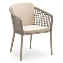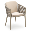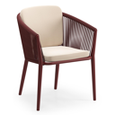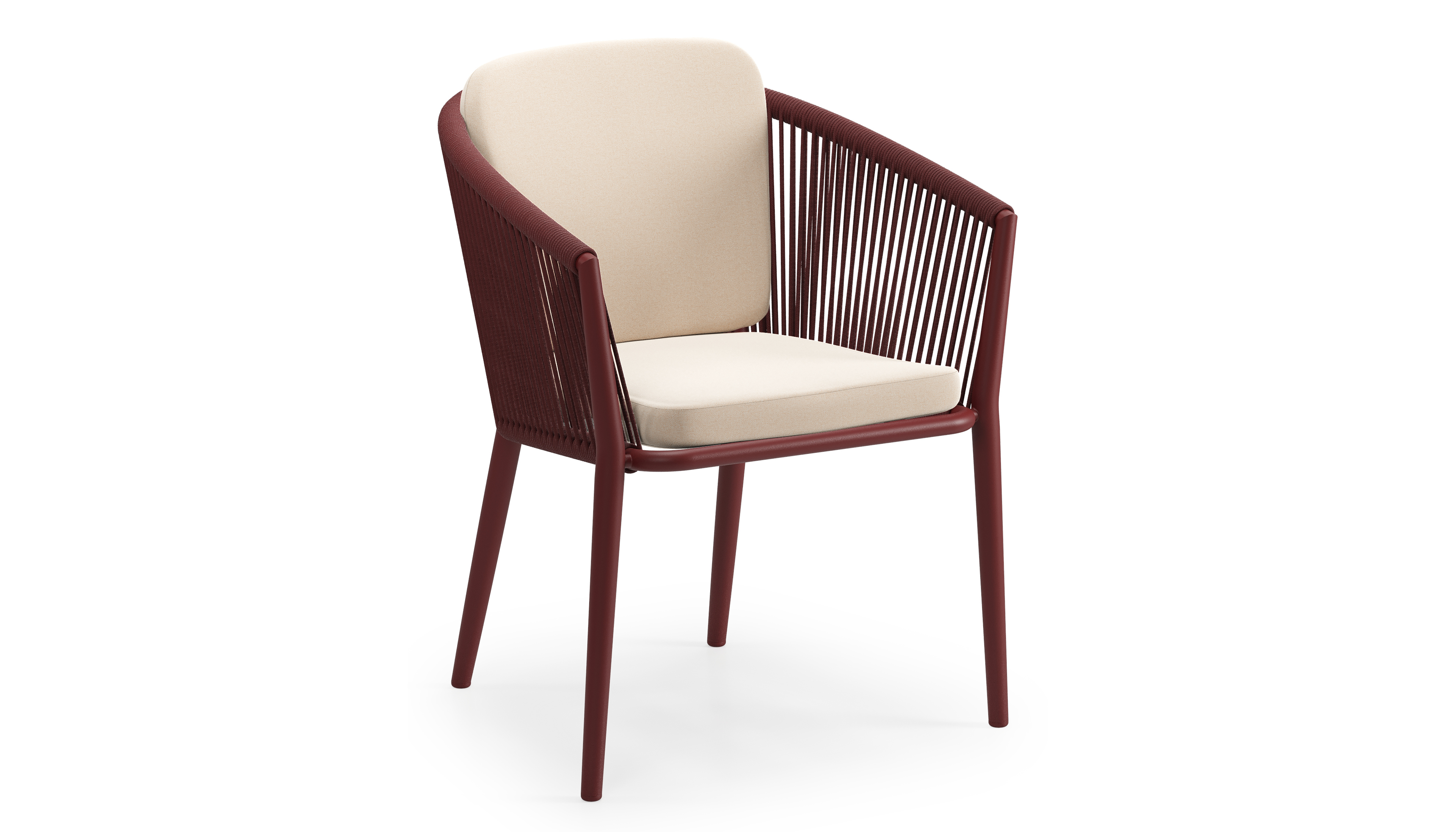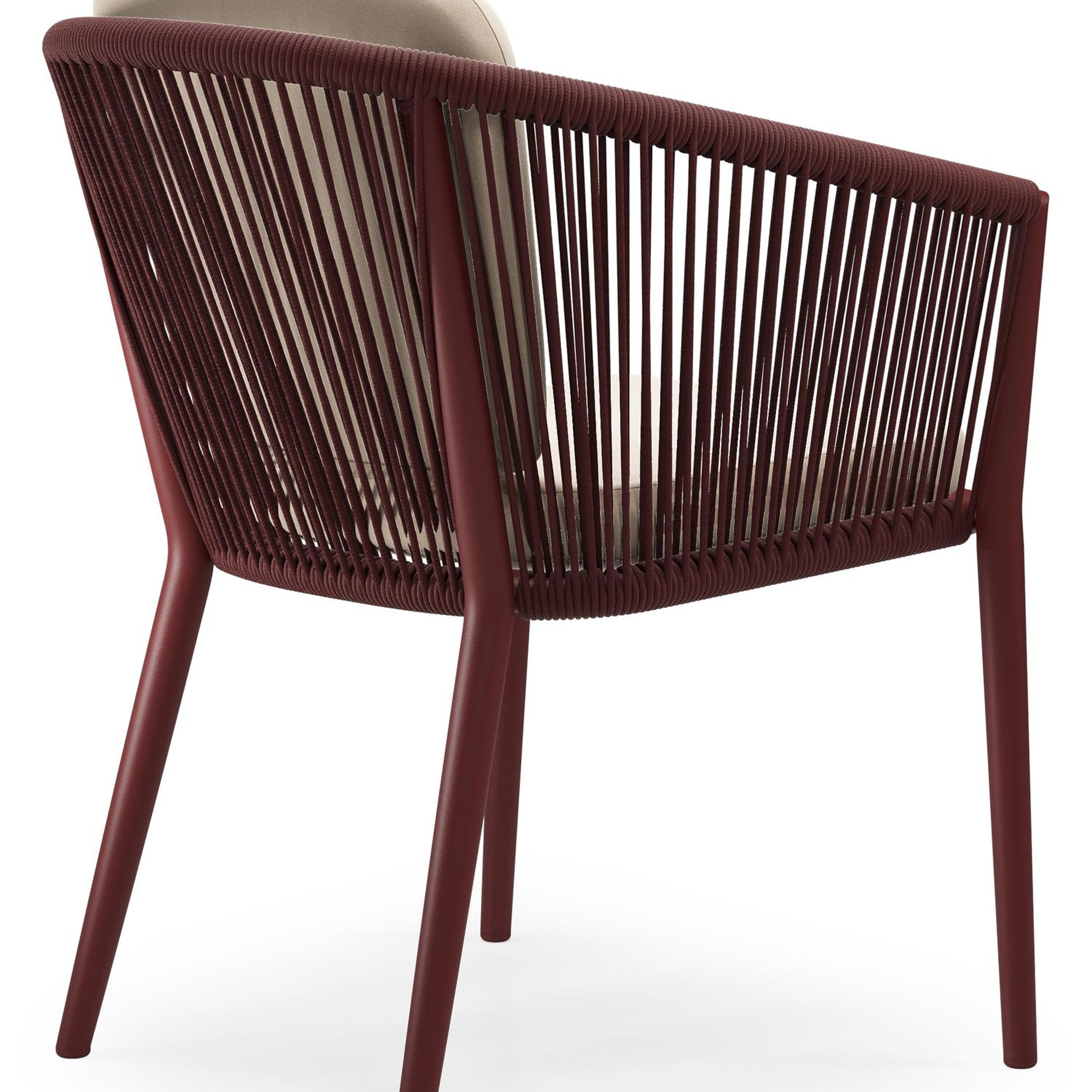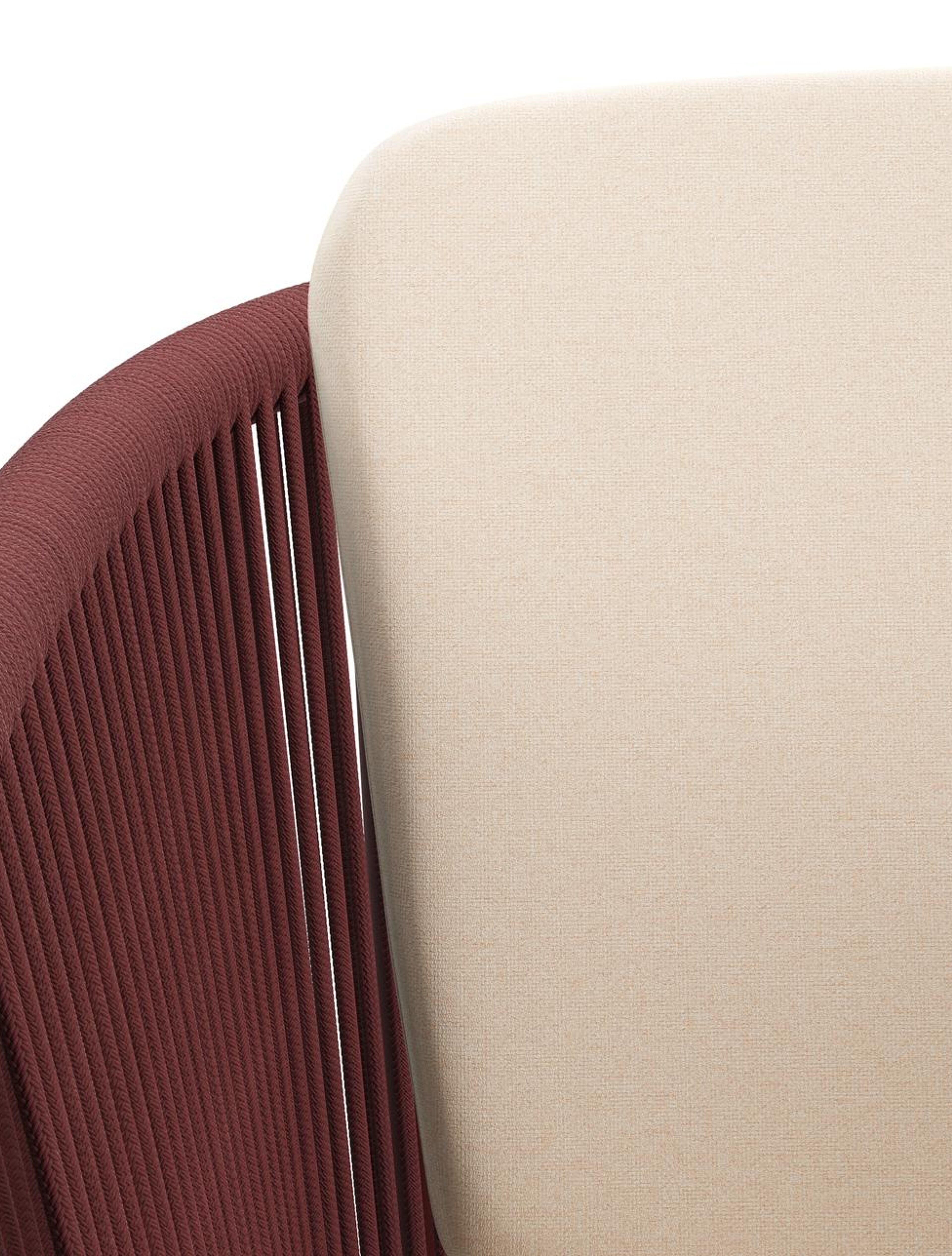 Chaise de jardin Orso en aluminium ruby et corde ronde tissée verticalement ruby avec coussin en All Weather Sunbrella® Luxe Natte Linen Chalk | Exterioo mobilier de jardin