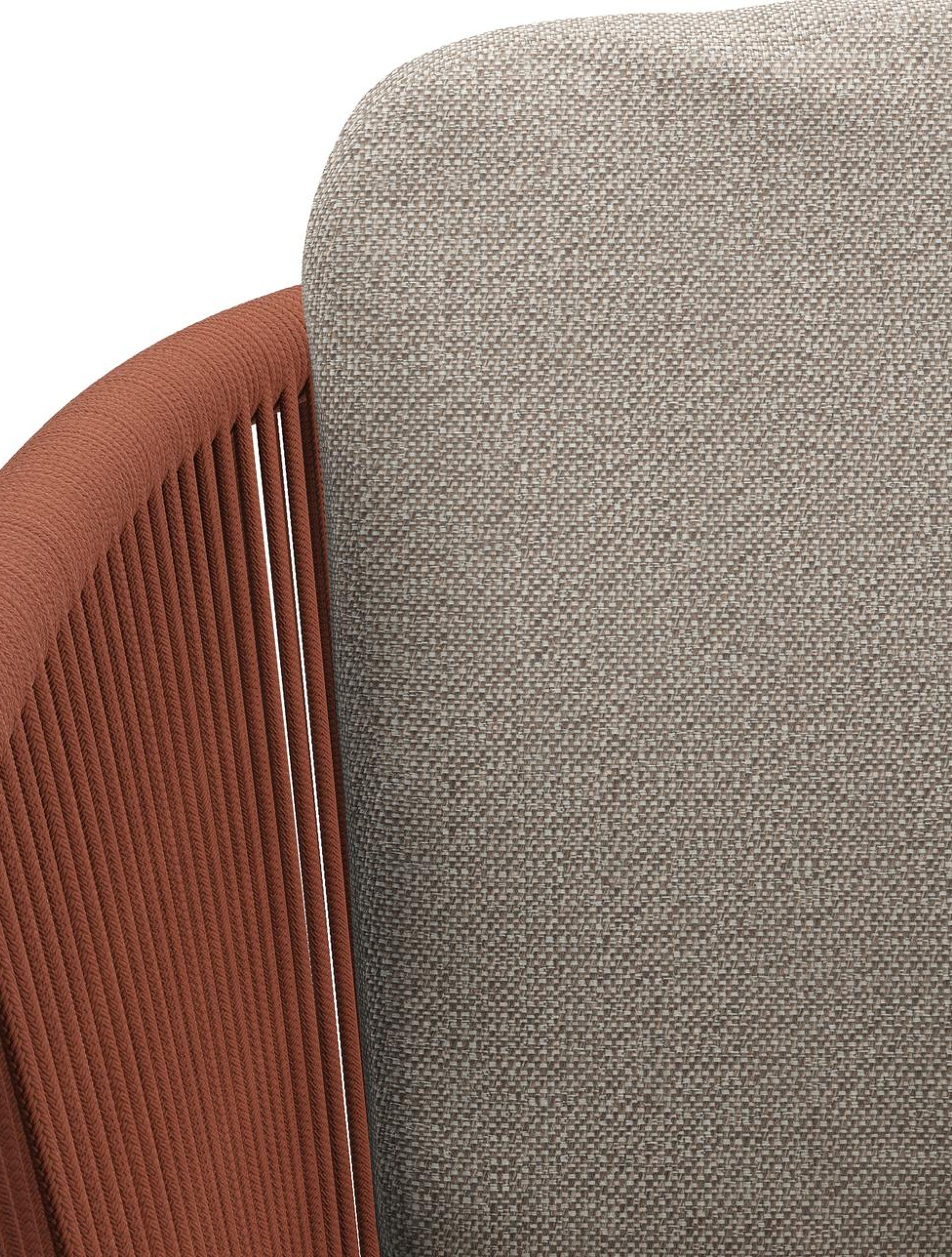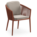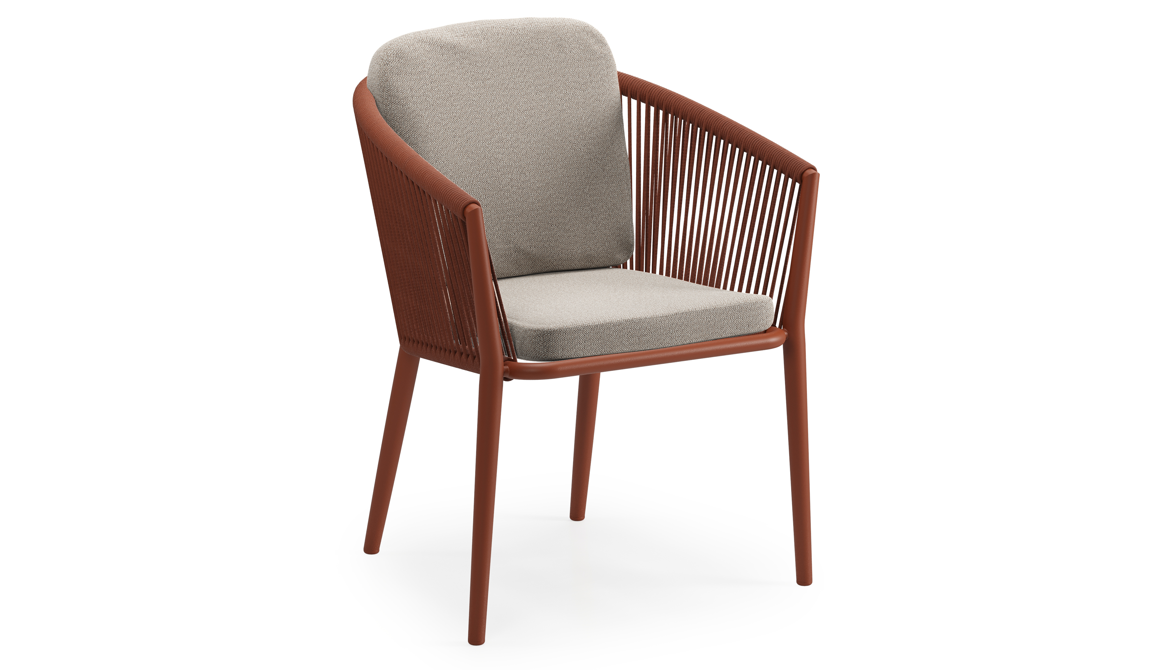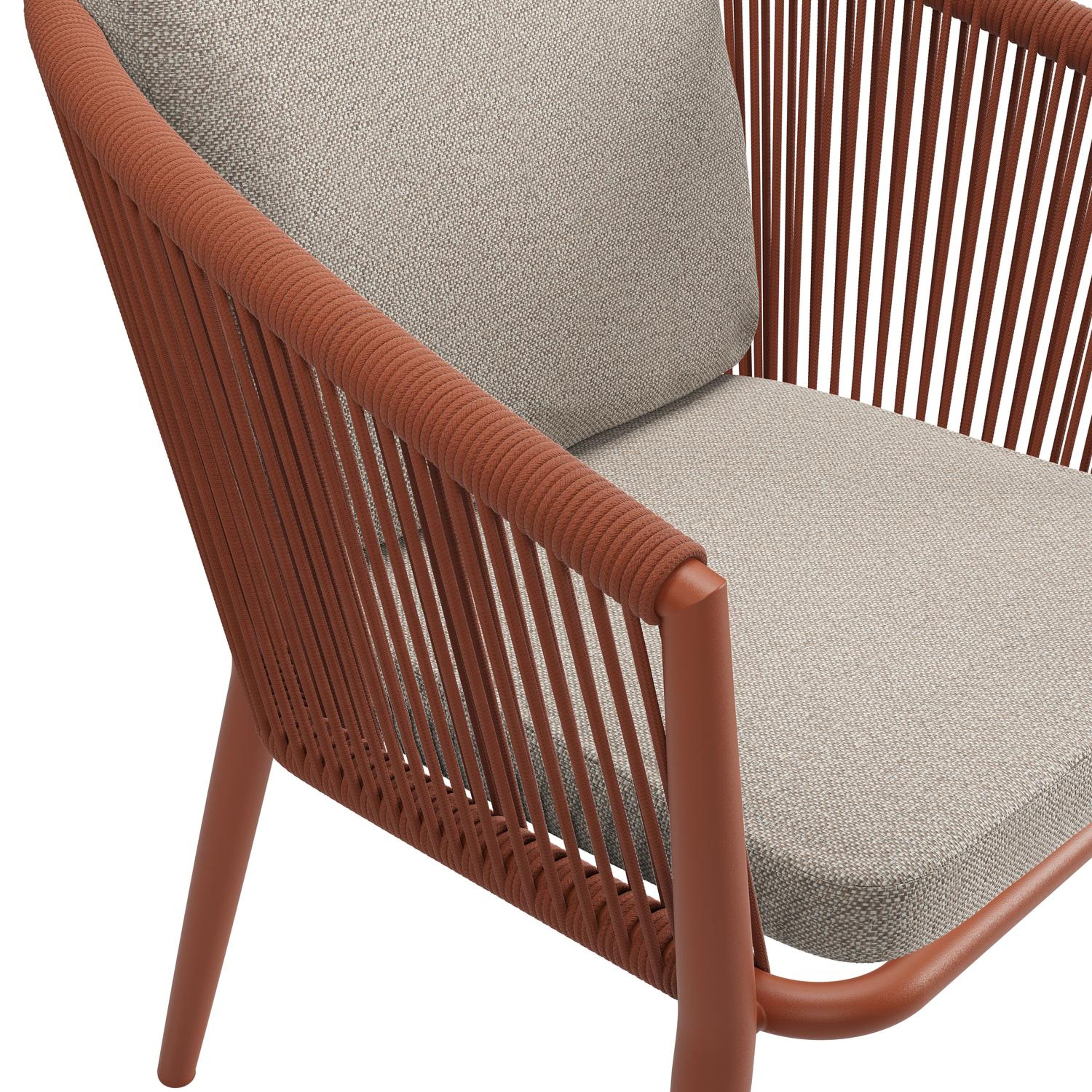 Chaise de jardin Orso en aluminium brun rouille et corde ronde tissée verticalement brun rouille avec coussin luxe en All Weather Sunbrella® Luxe Savane Coconut | Exterioo mobilier de jardin